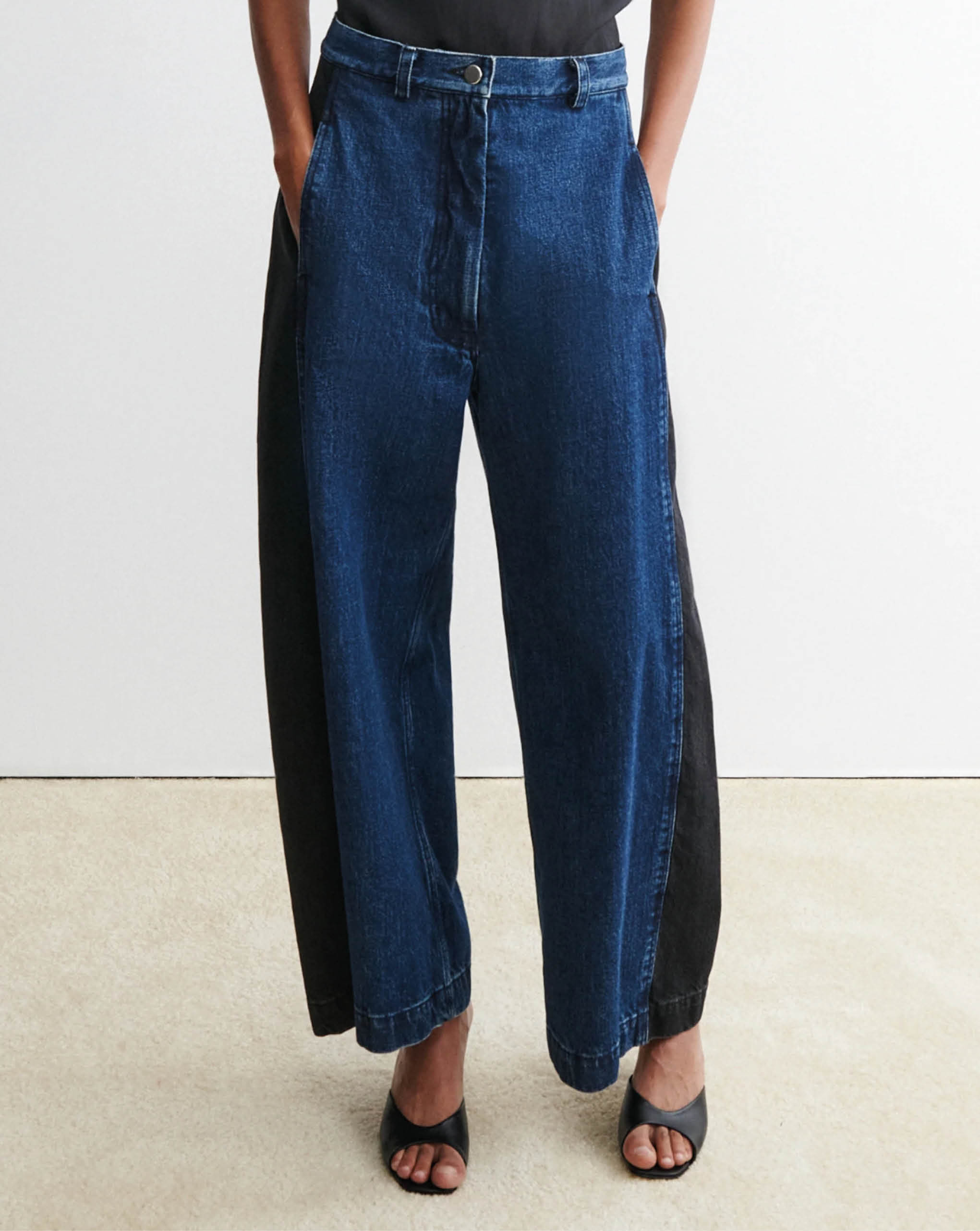 Rachel Comey high-waisted, flat-front, relaxed fit jean with a wide, rounded leg, cut in our classic two-tone denim. Contrast denim side panels elongate the silhouette. Denim made in Los Angeles using premium Japanese denim