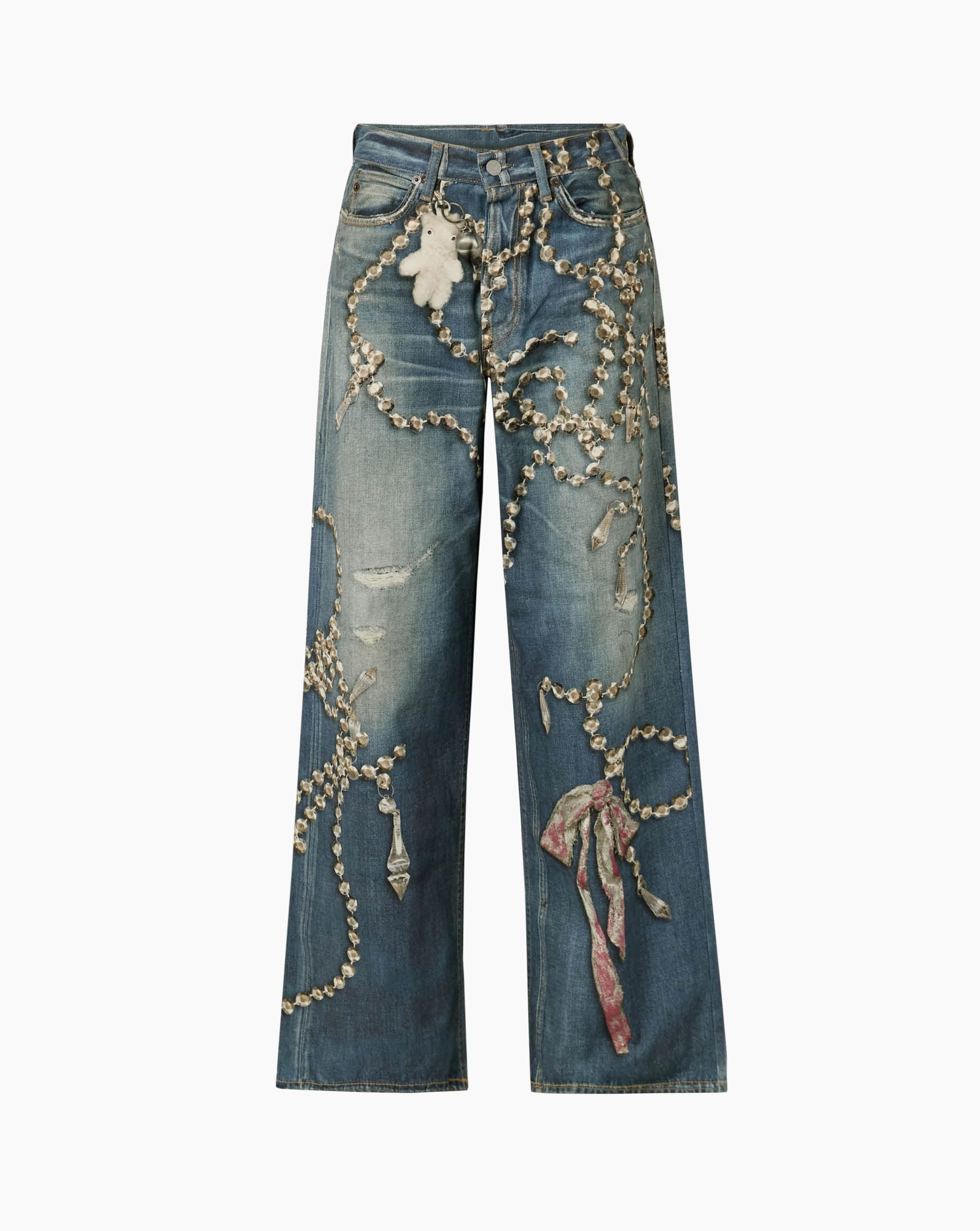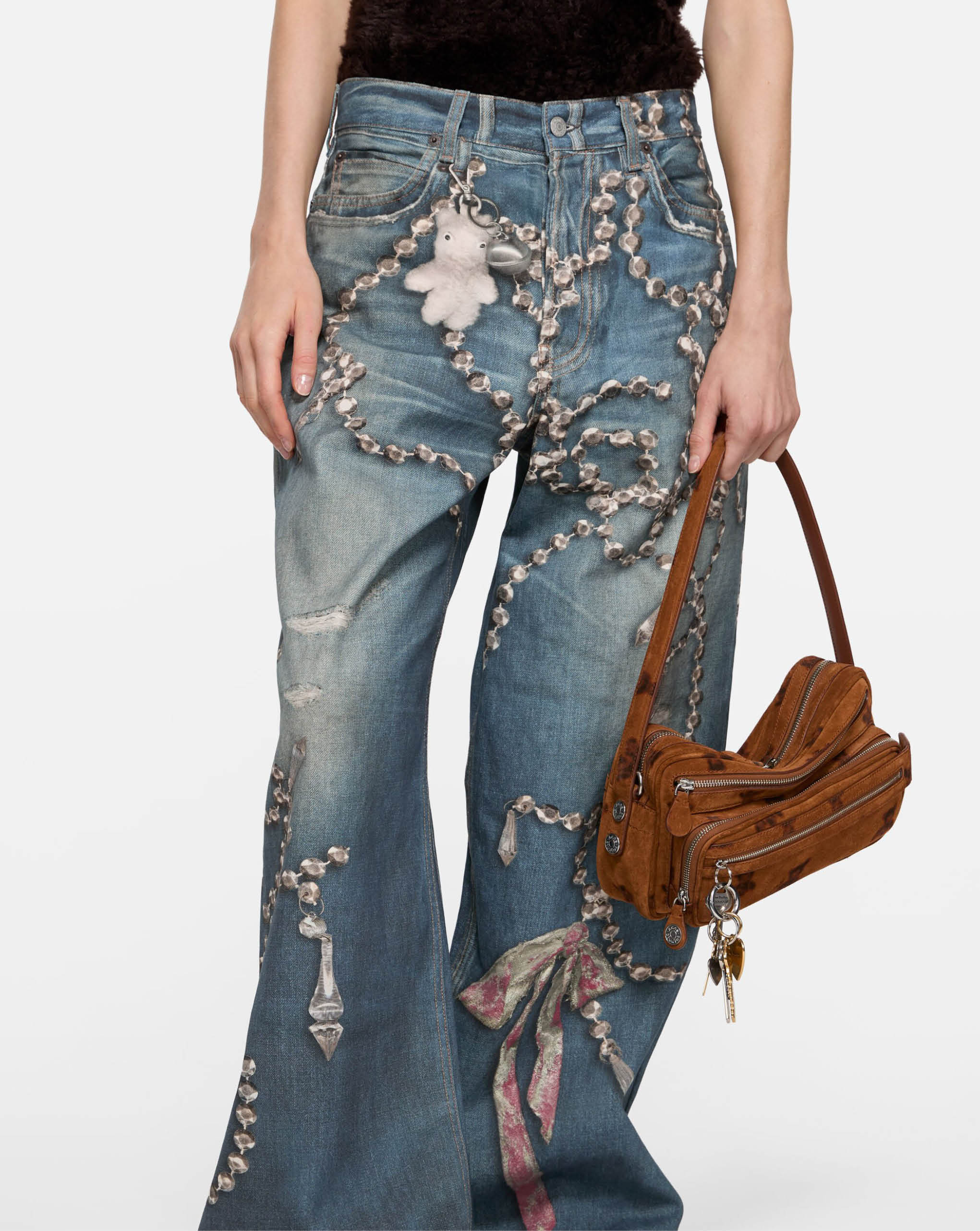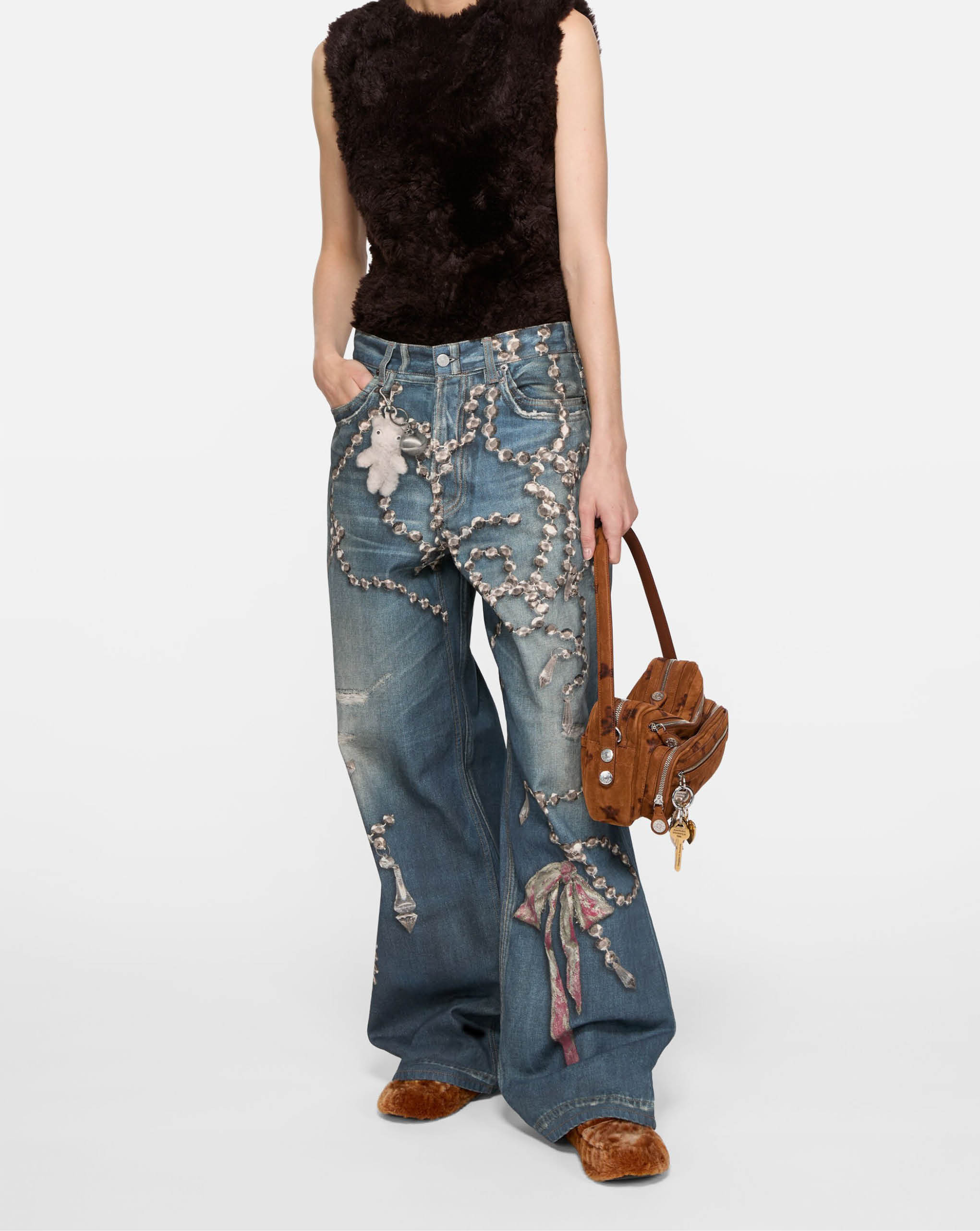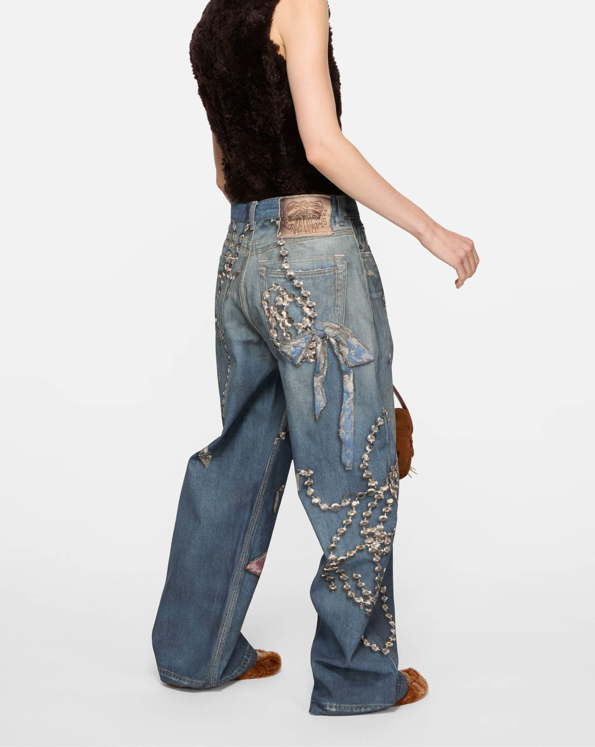 Acne Studios Jeans featuring a seasonal trompe-l’oeil print of crystals and bows, crafted from denim with a brushed face for a soft handfeel. 1981 jeans are cut to a loose fit with a low to mid waist, super baggy leg, and long length