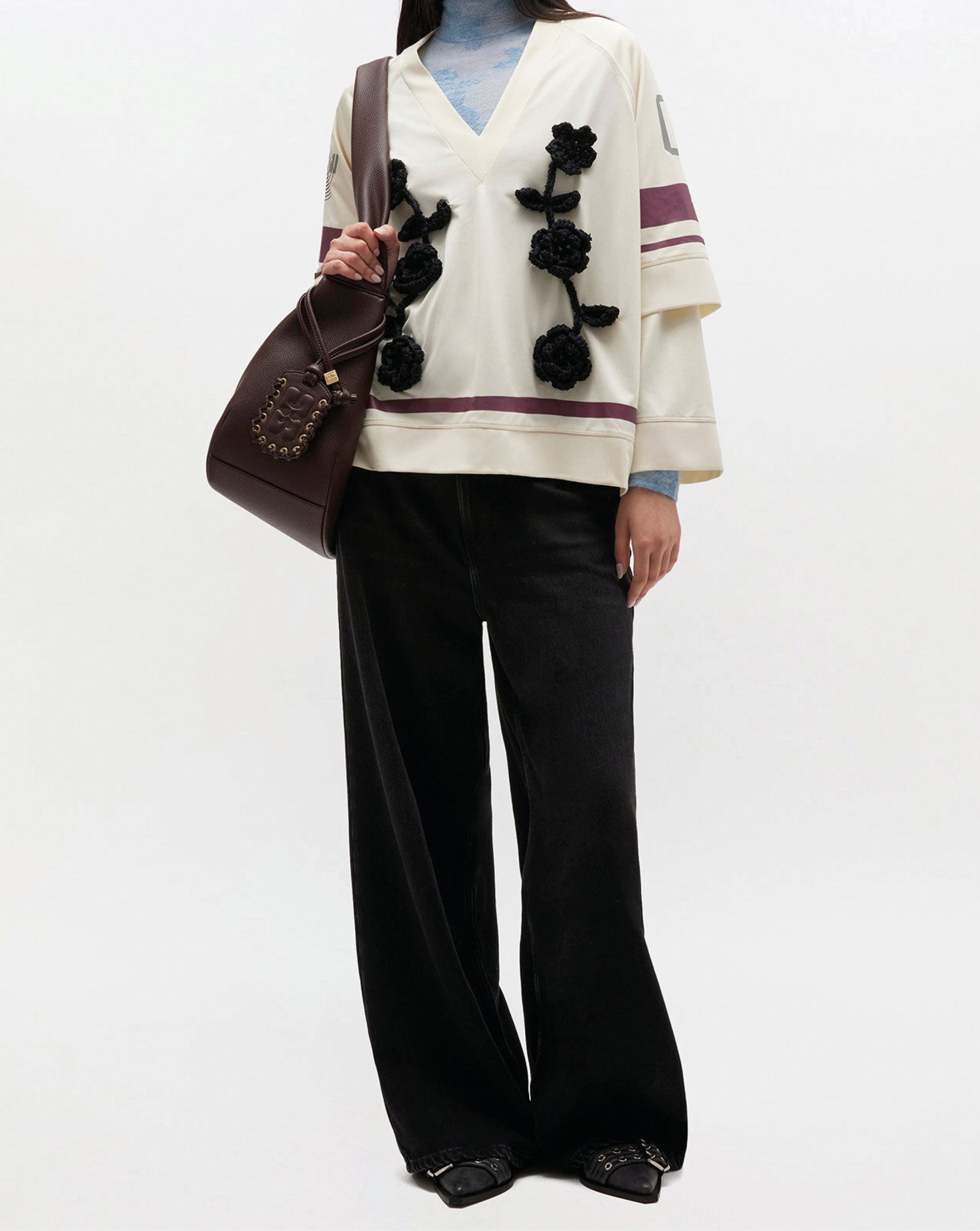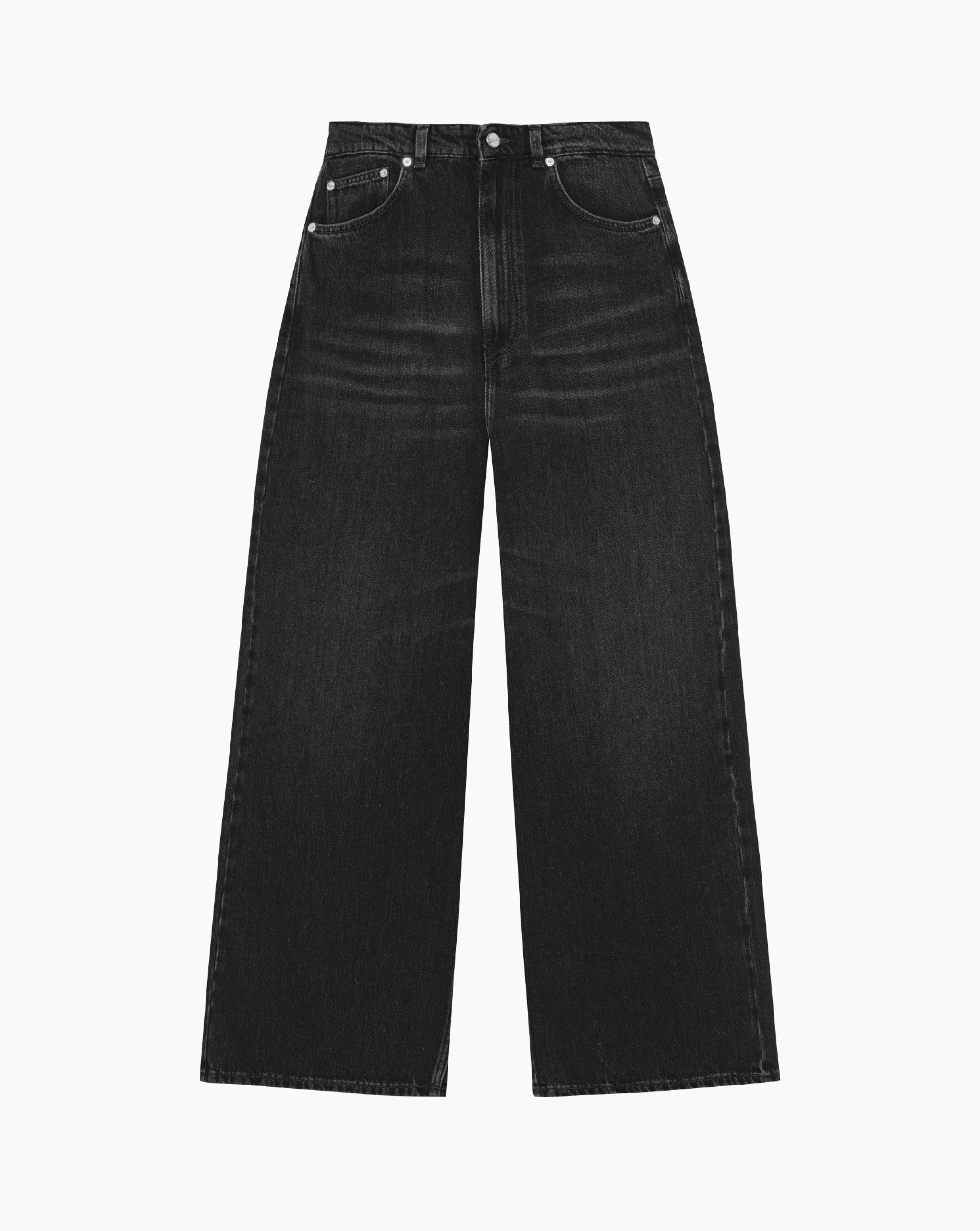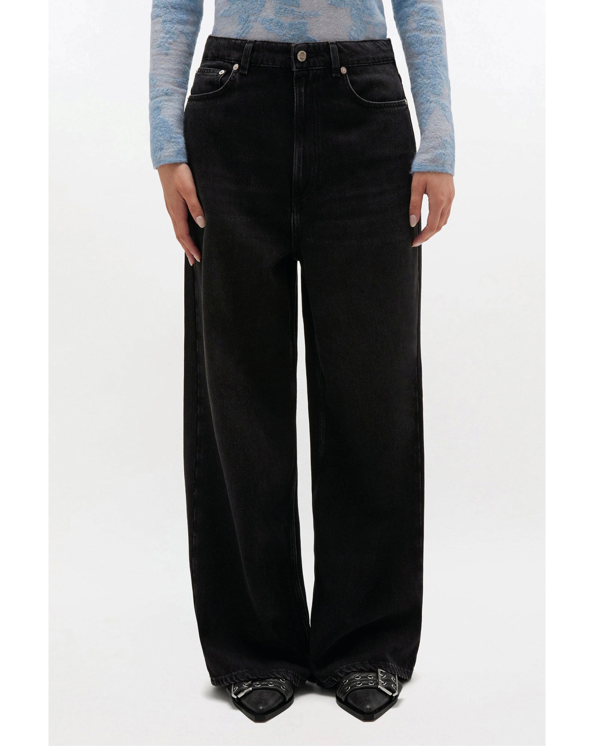 Ganni black washed denim baggy jeans come with a zip and button fastening, five pockets, belt loops, and the GANNI logo displayed on the back pocket