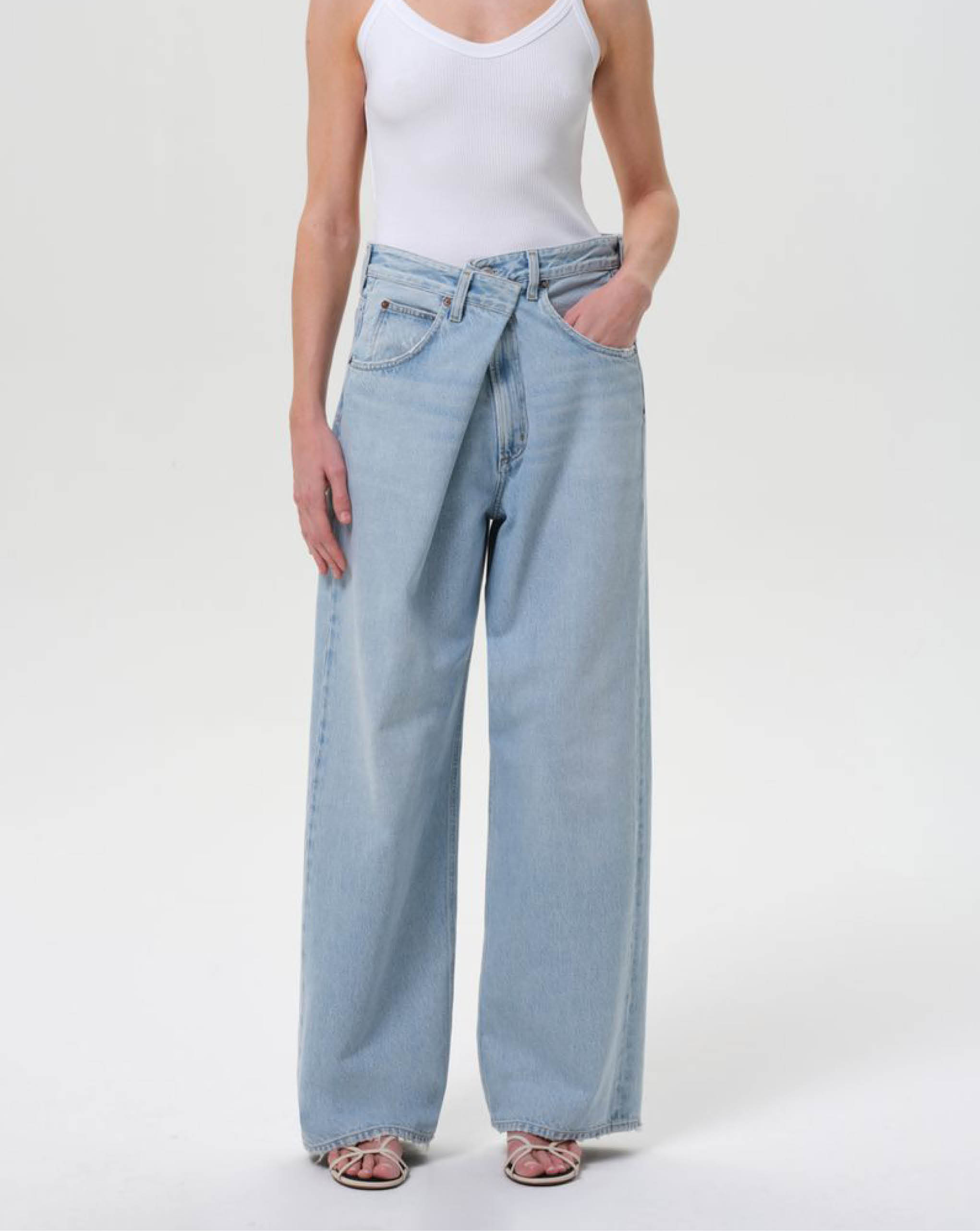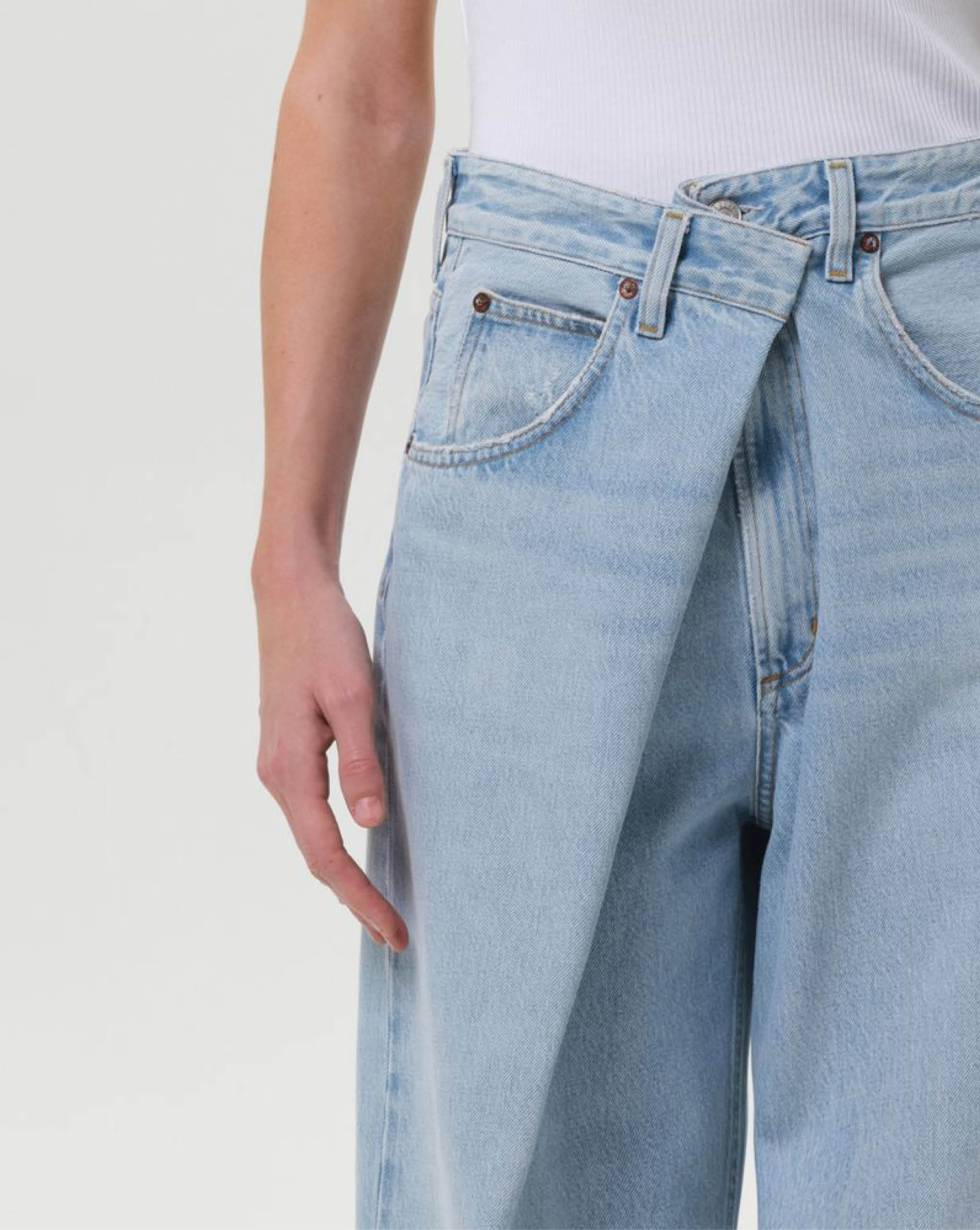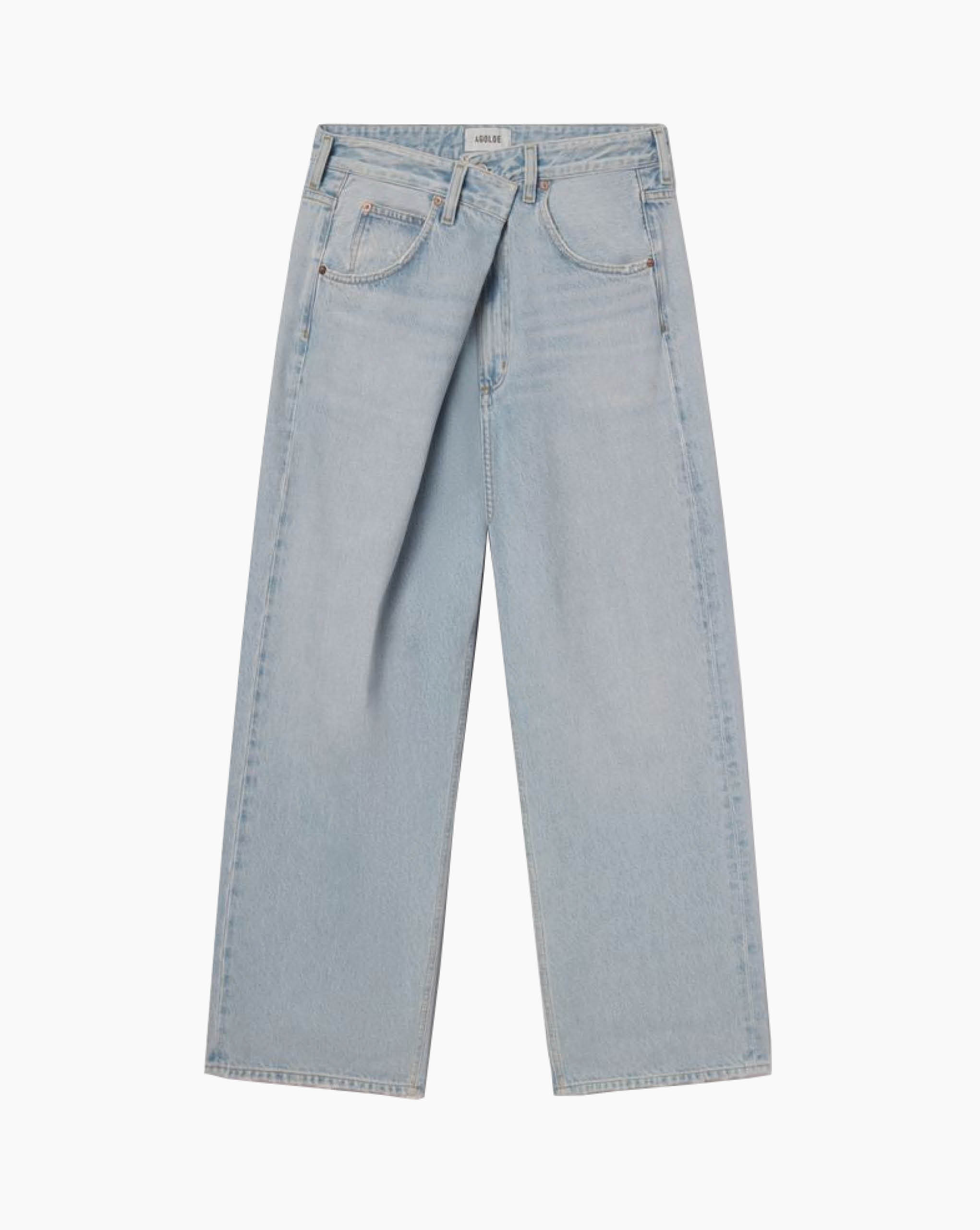 Agolde light vintage indigo denim with exaggerated front fold. Featuring a distinctive "fold" closure and classic 5-pocket styling. The low-slung fit and roomy, full-length leg create an effortlessly oversized vibe, embracing the laid-back, relaxed aesthetic