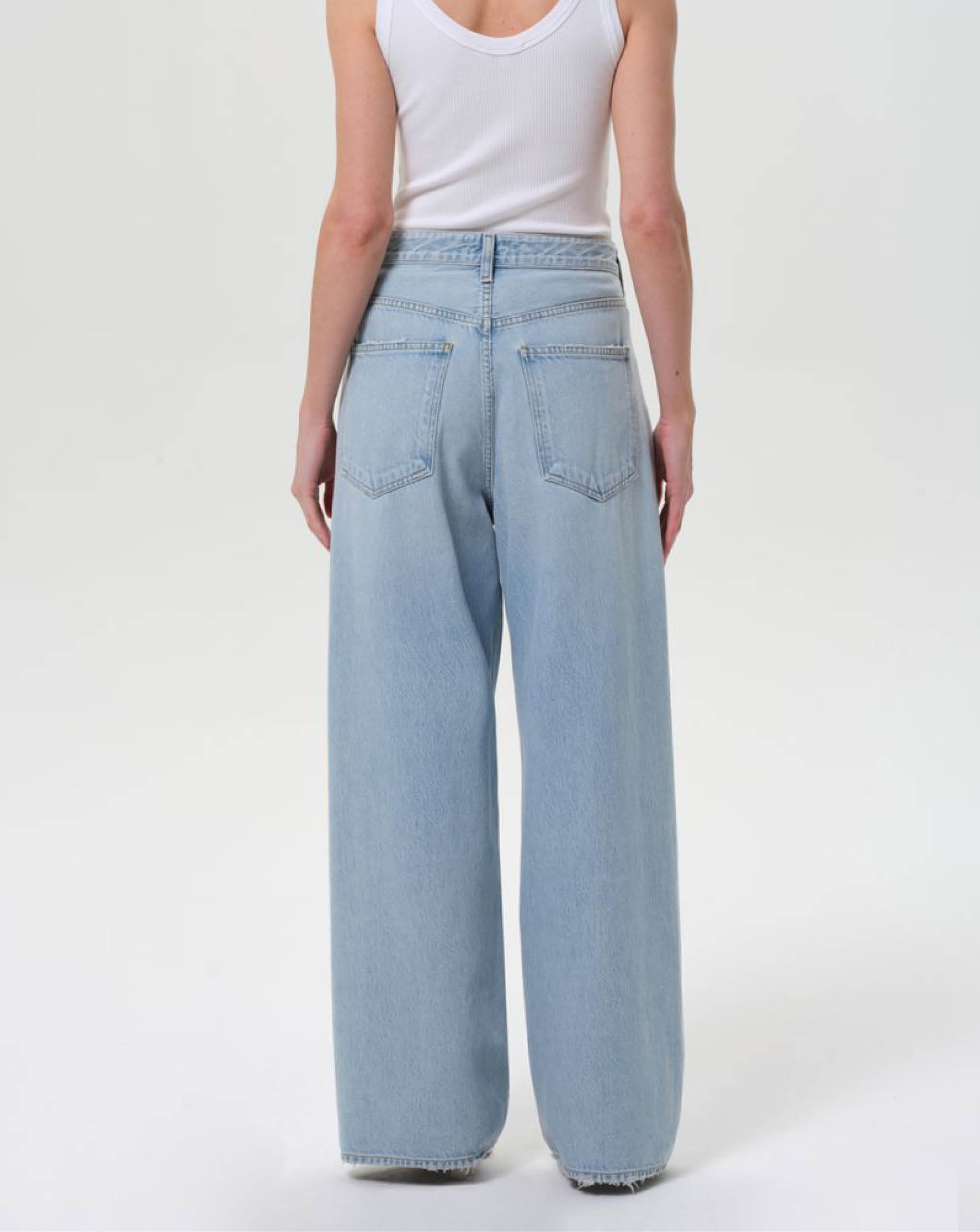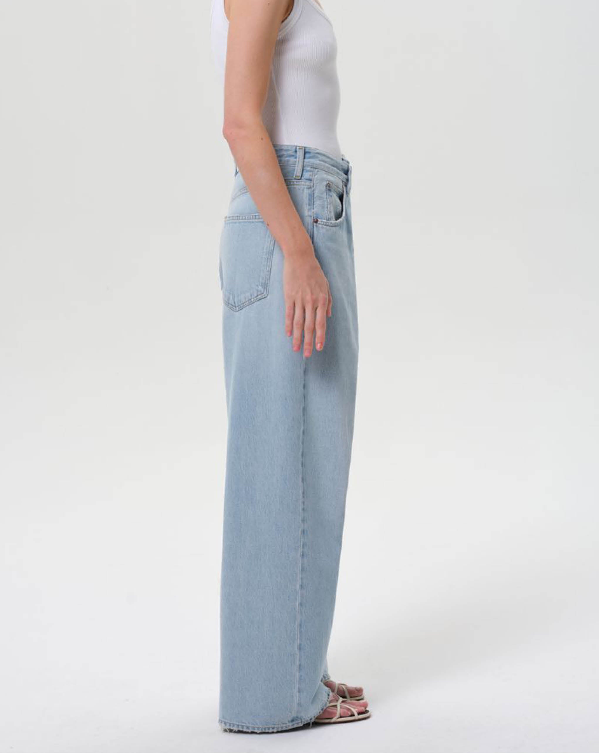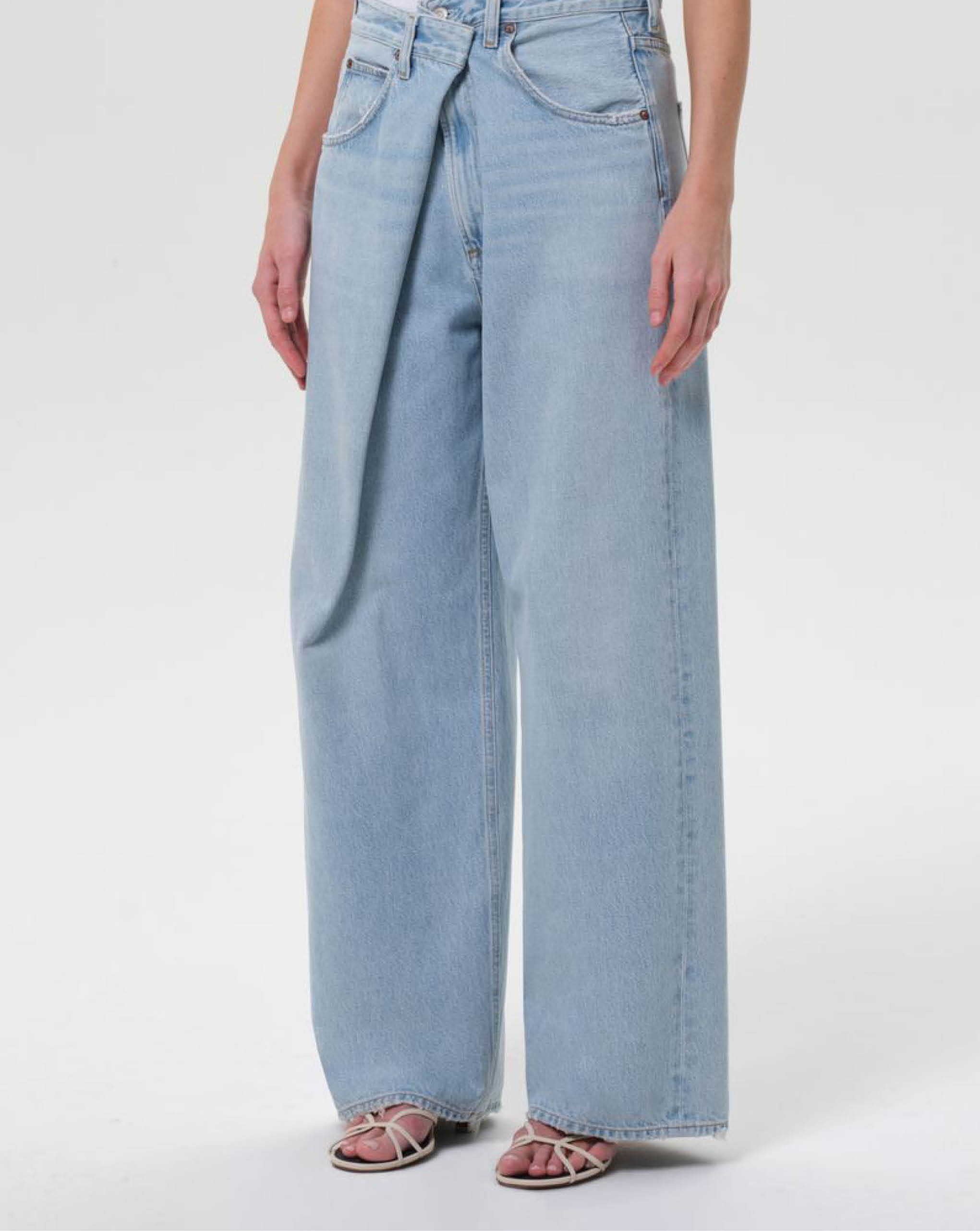 Agolde light vintage indigo denim with exaggerated front fold. Featuring a distinctive "fold" closure and classic 5-pocket styling. The low-slung fit and roomy, full-length leg create an effortlessly oversized vibe, embracing the laid-back, relaxed aesthetic
