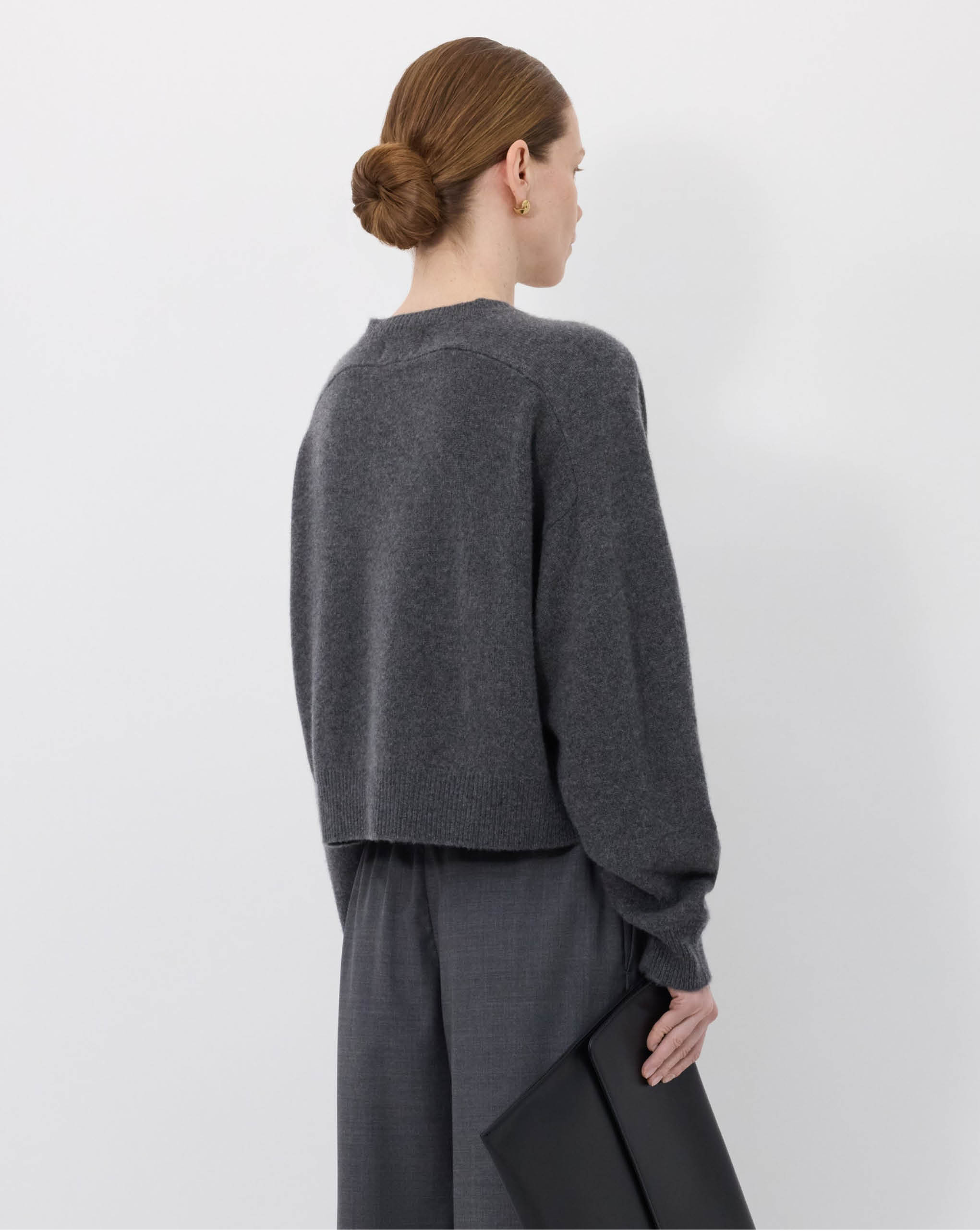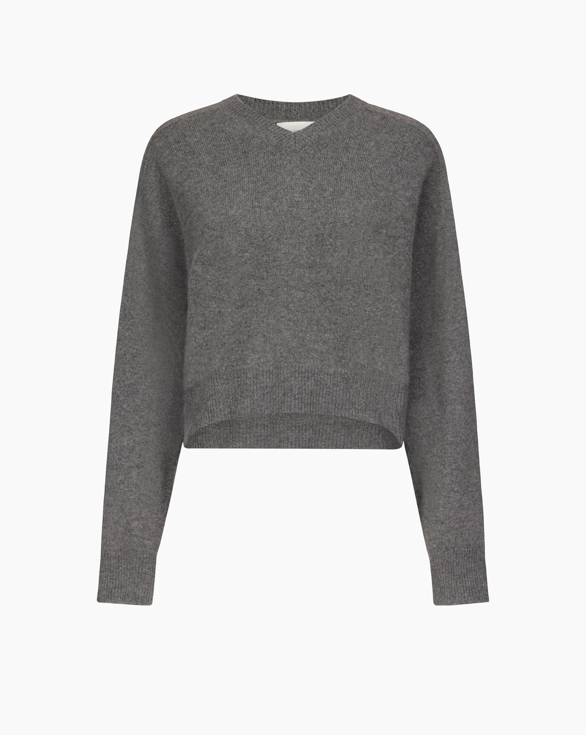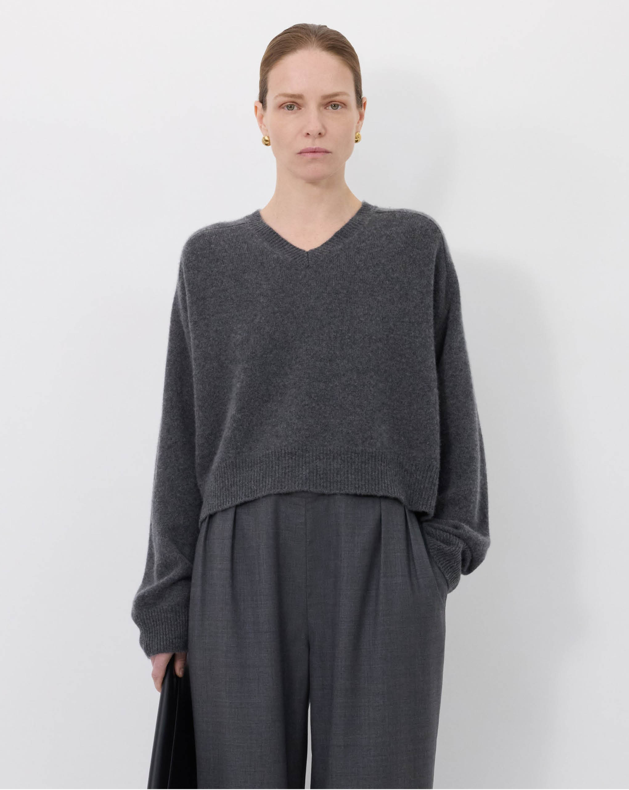 Loulou de Saison sweater made of cashmere. It features a boxy fit, a V neck, drop shoulders and ribbed details on the neckline, cuffs and hem