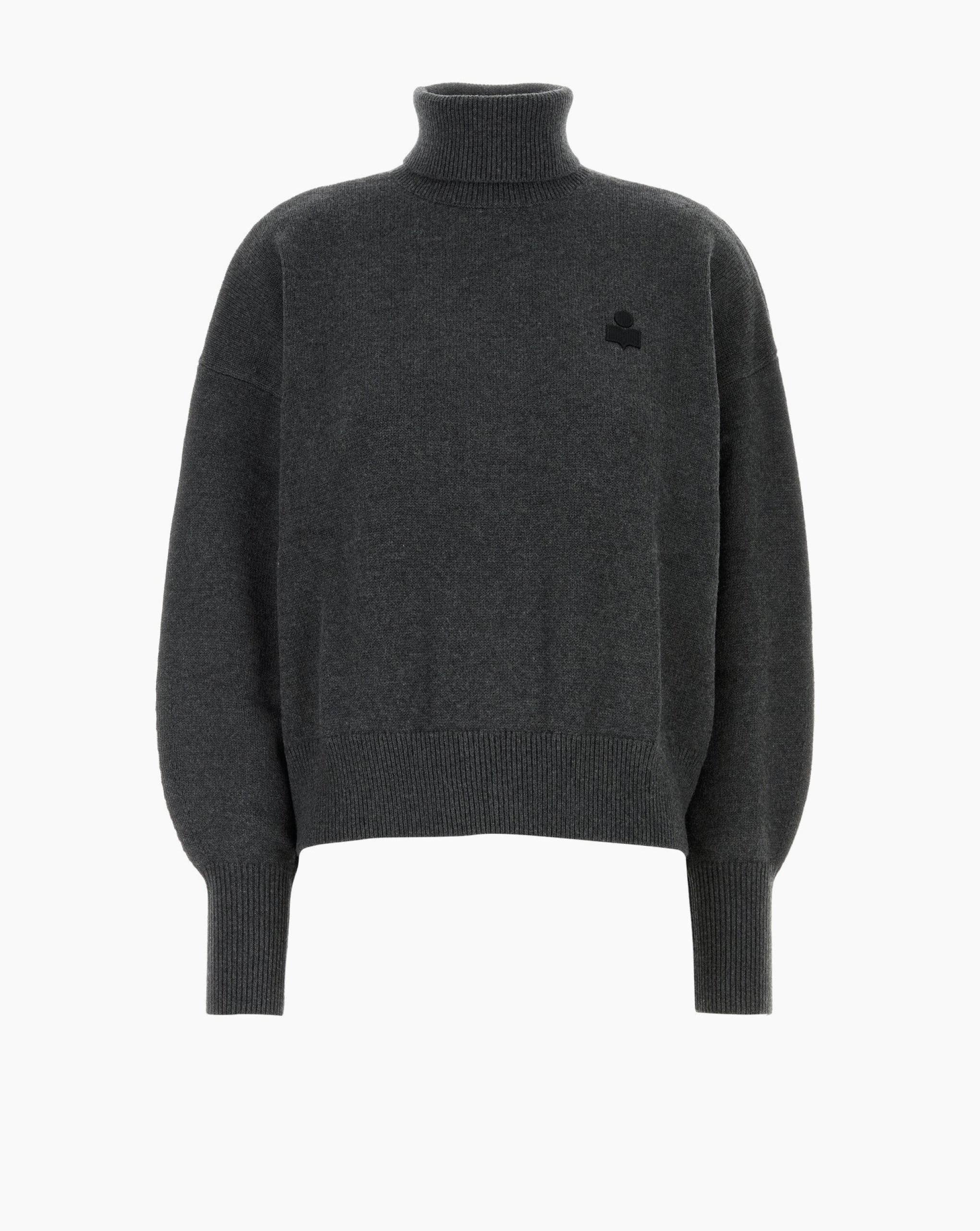 Marant Etoile knit featuring a cozy blend of cotton and wool, accented with a front logo patch. It has a turned-up high neck, long sleeves with cuffs, and relaxed dropped shoulders for added comfort