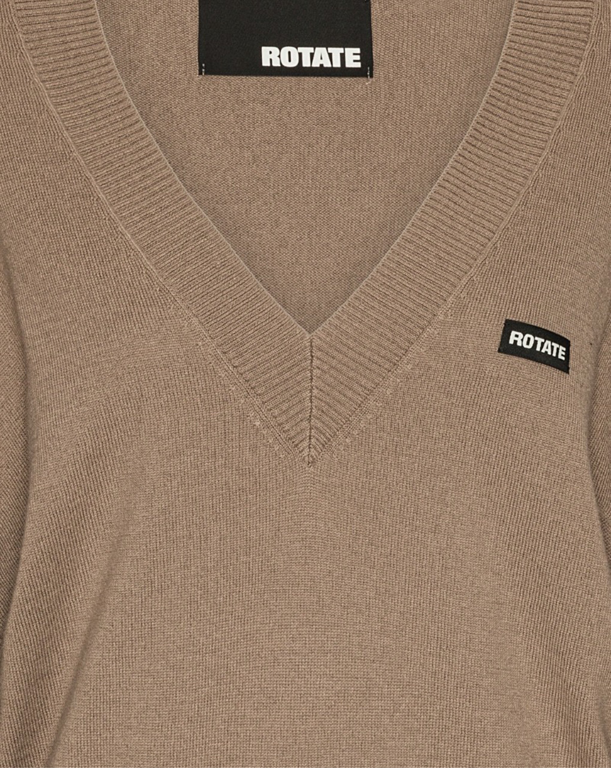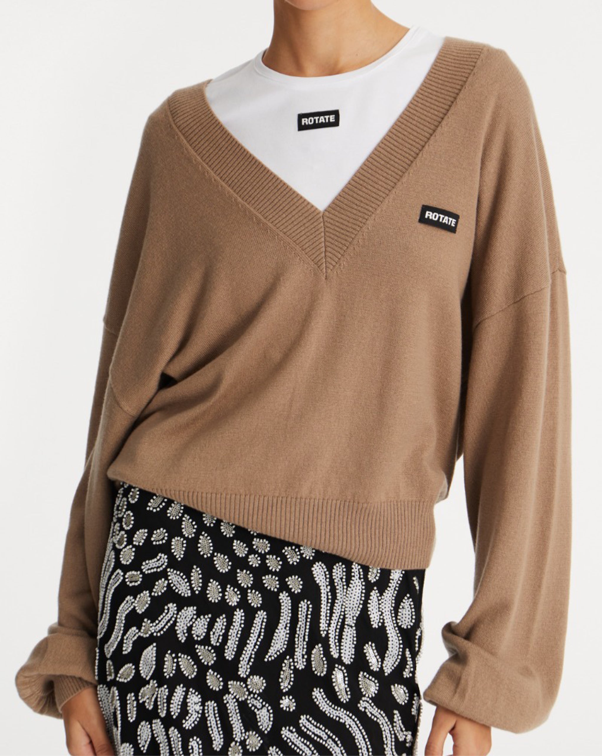 Rotate camel V-neck knit sweater offering a relaxed fit with a deep neckline and ribbed trims. The dropped shoulders and long sleeves create a voluminous shape that narrows into snug cuffs. A subtle logo patch decorates the chest, while a ribbed band at the hem ensures a comfortable, structured finish