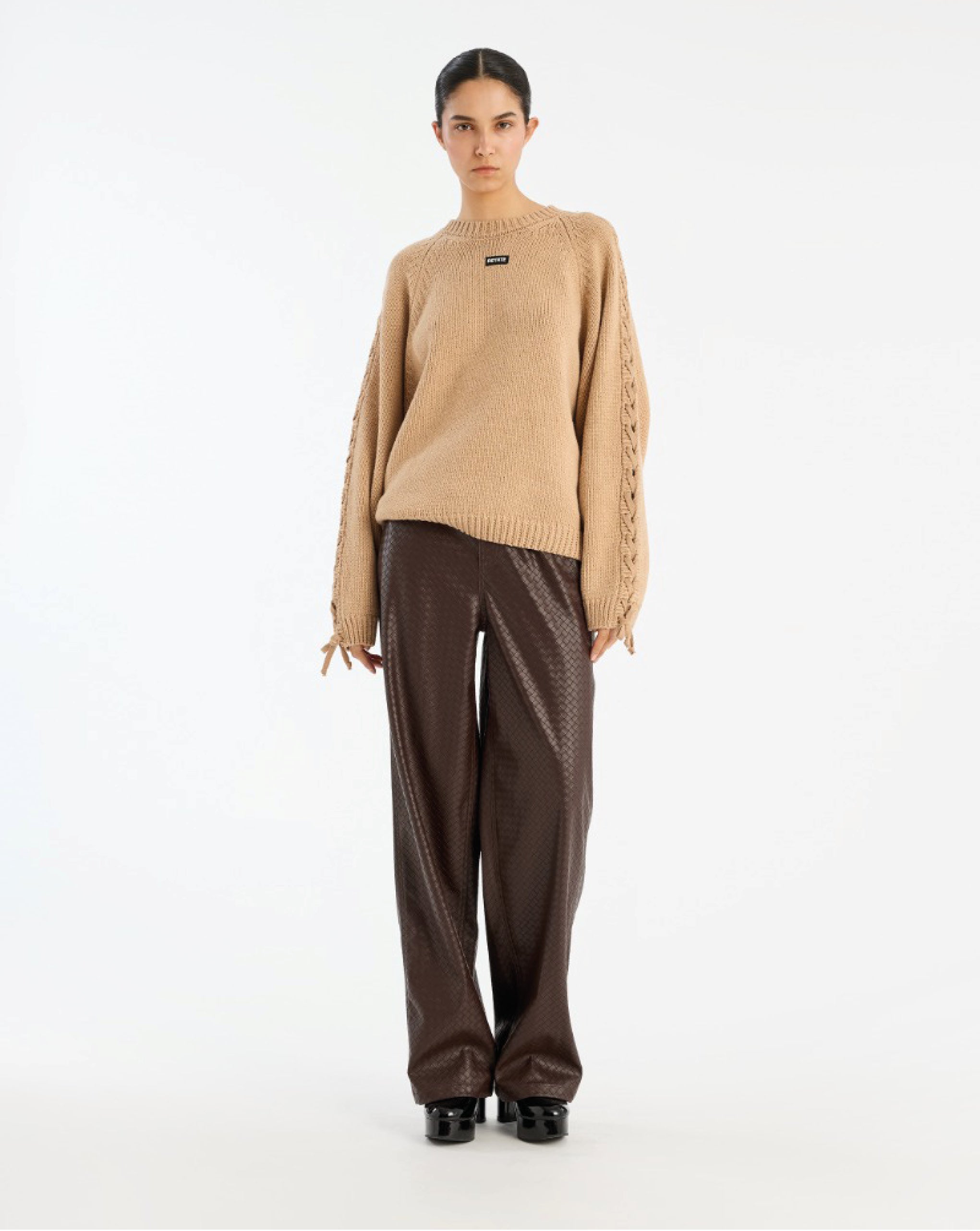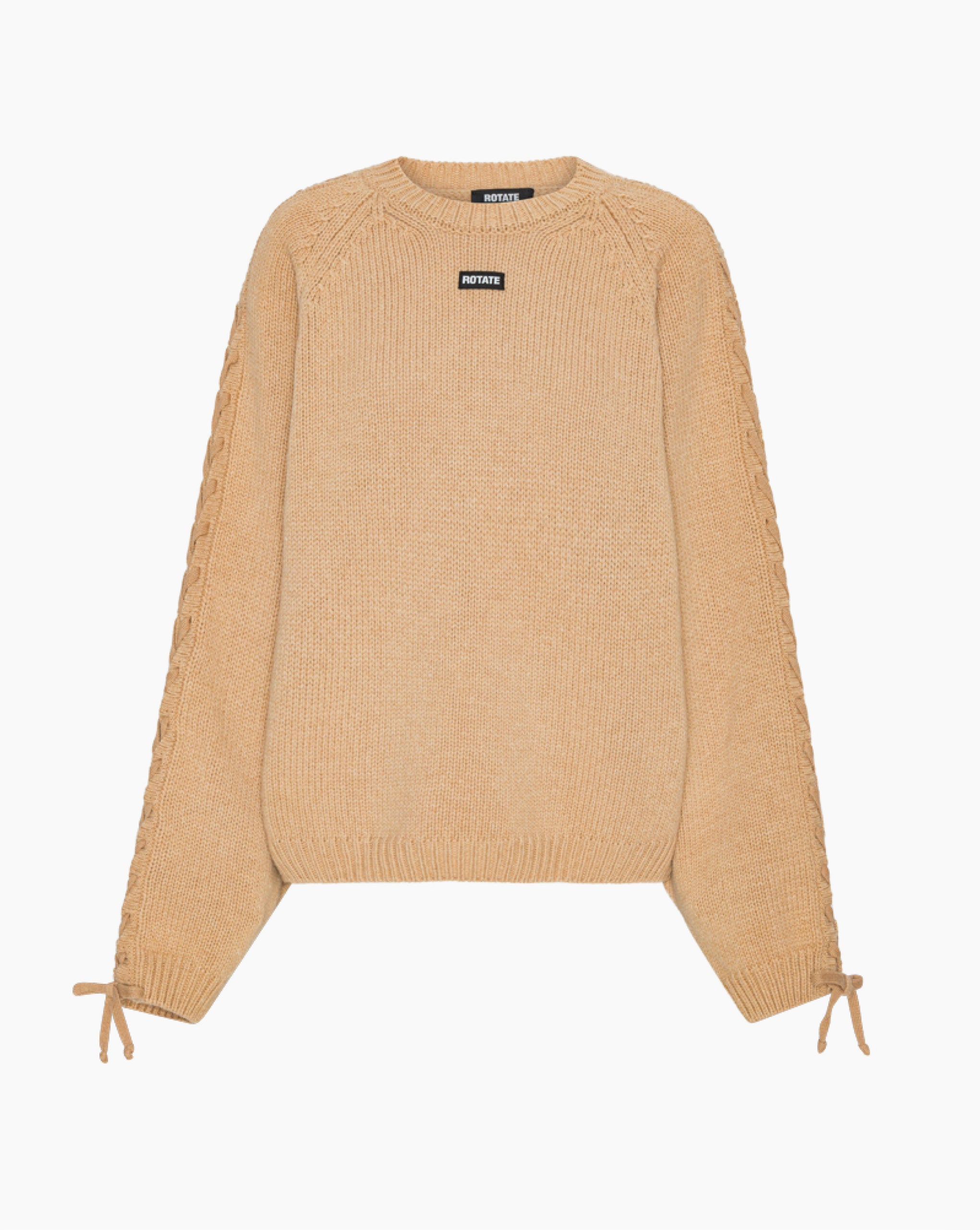 Rotate jumper with lace detailing on the sleeves featuring a crew neckline, ribbed hems and cuffs and a logo patch on the chest