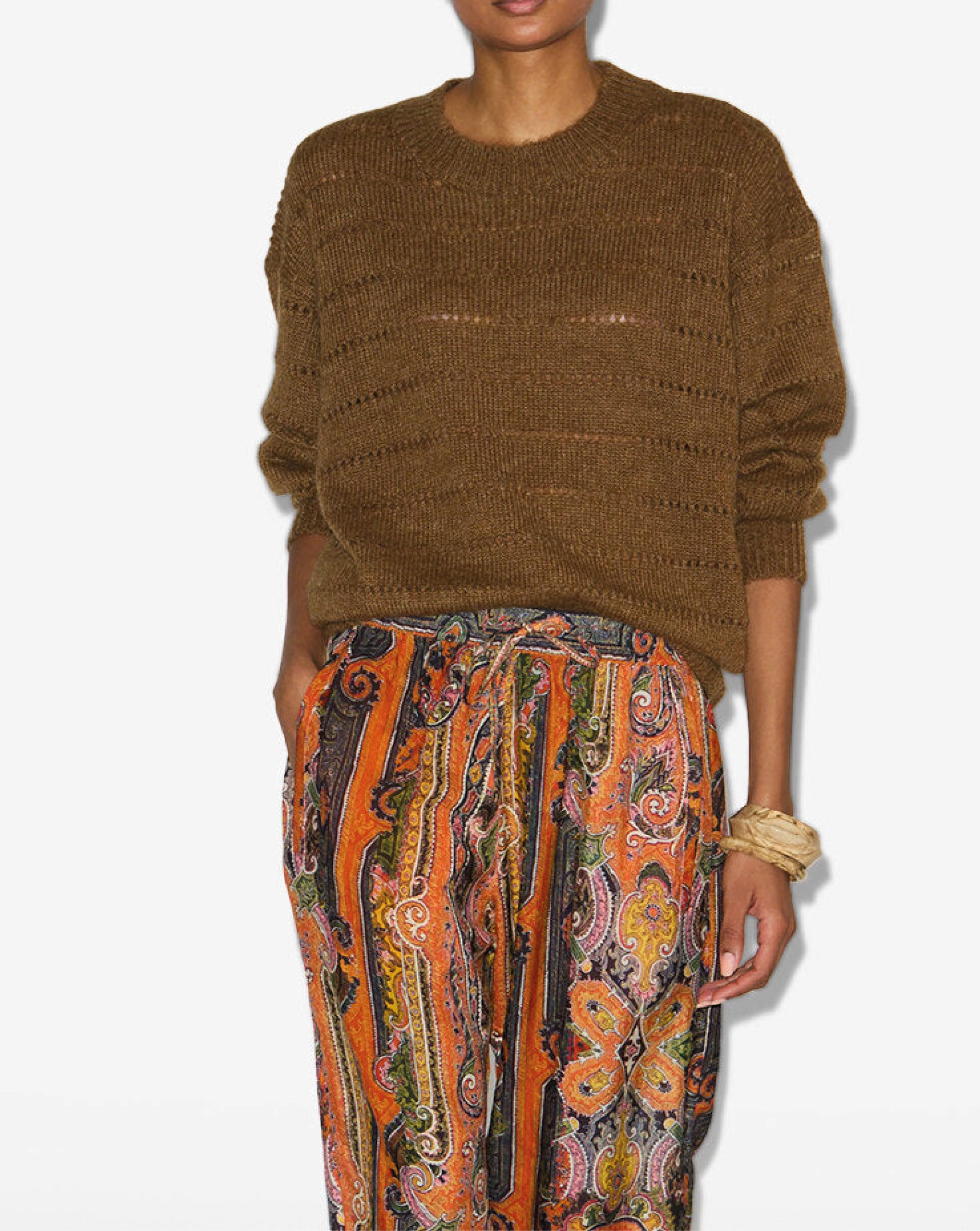 Marant Etoile knit featuring a plain-colored openwork knit design with a round neckline and long sleeves. It includes ribbed edges for added comfort and offers a relaxed fit to keep you cozy and stylish