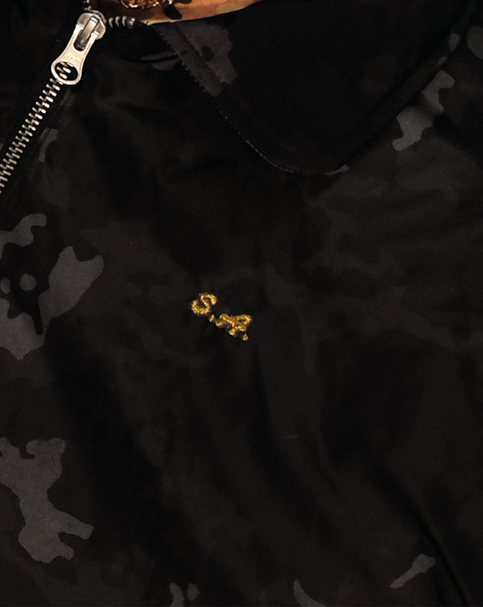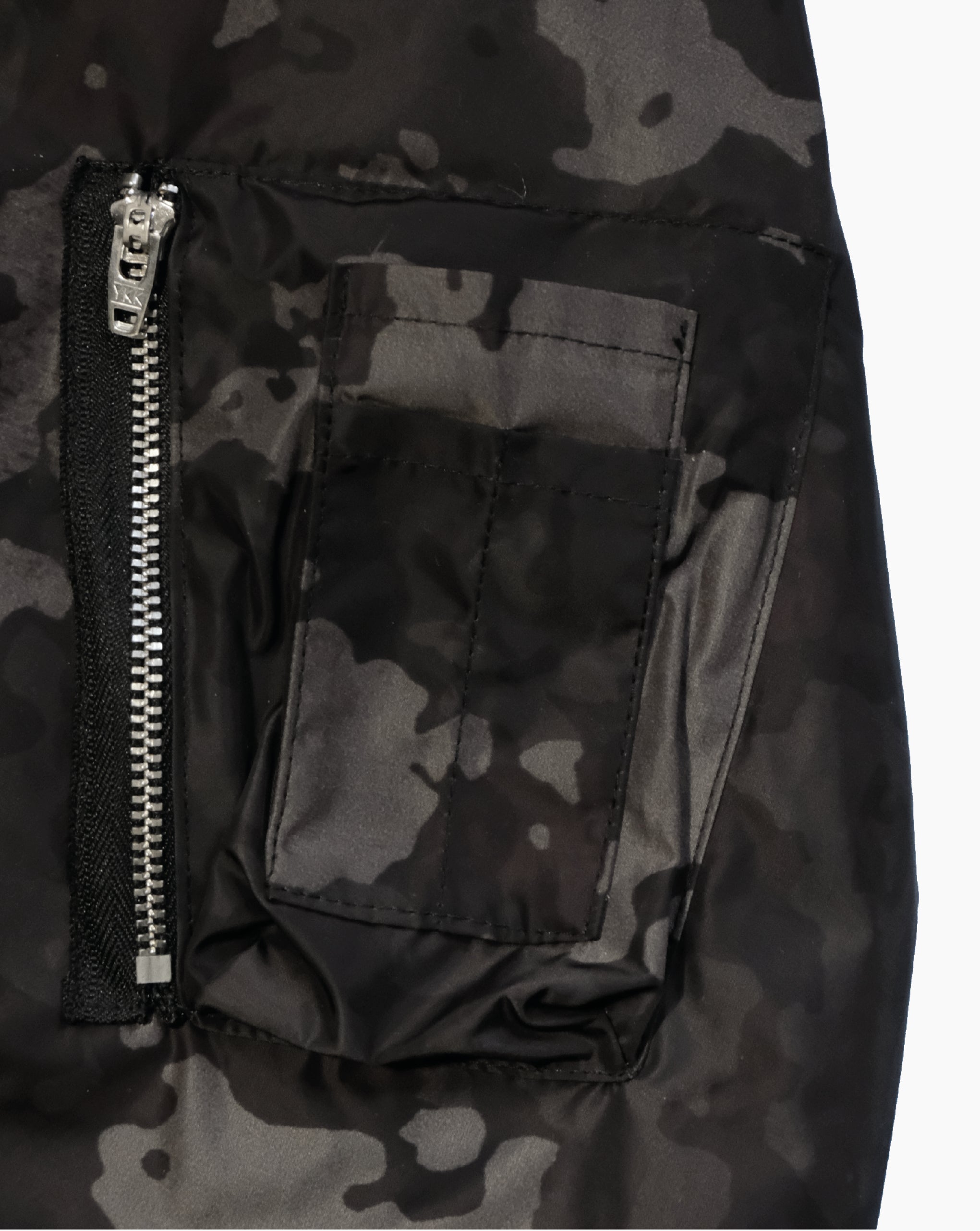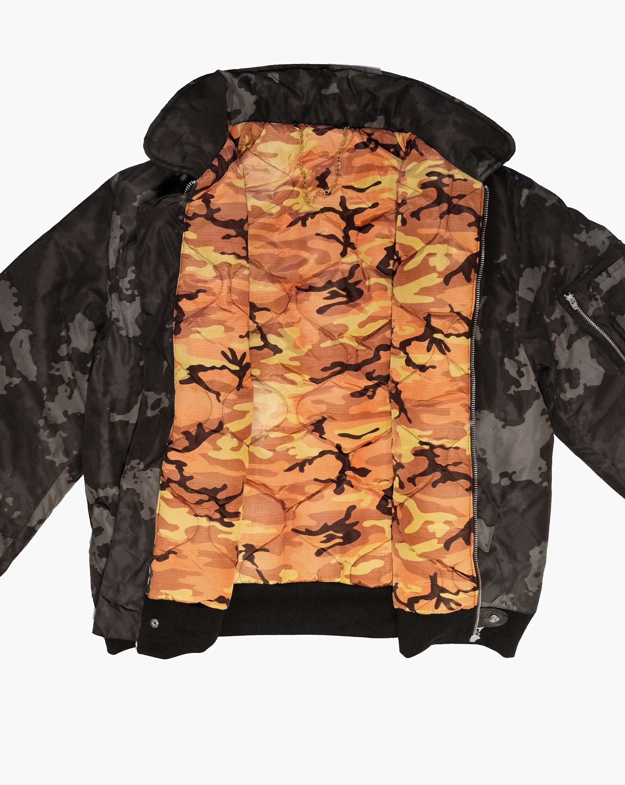 Service Area camo bomber featuring a printed quilted lining and a relaxed, boxy silhouette. It includes durable YKK zippers and snap buttons on the pockets for secure storage. The removable hood, adorned with faux fur trim, adds versatile warmth and style
