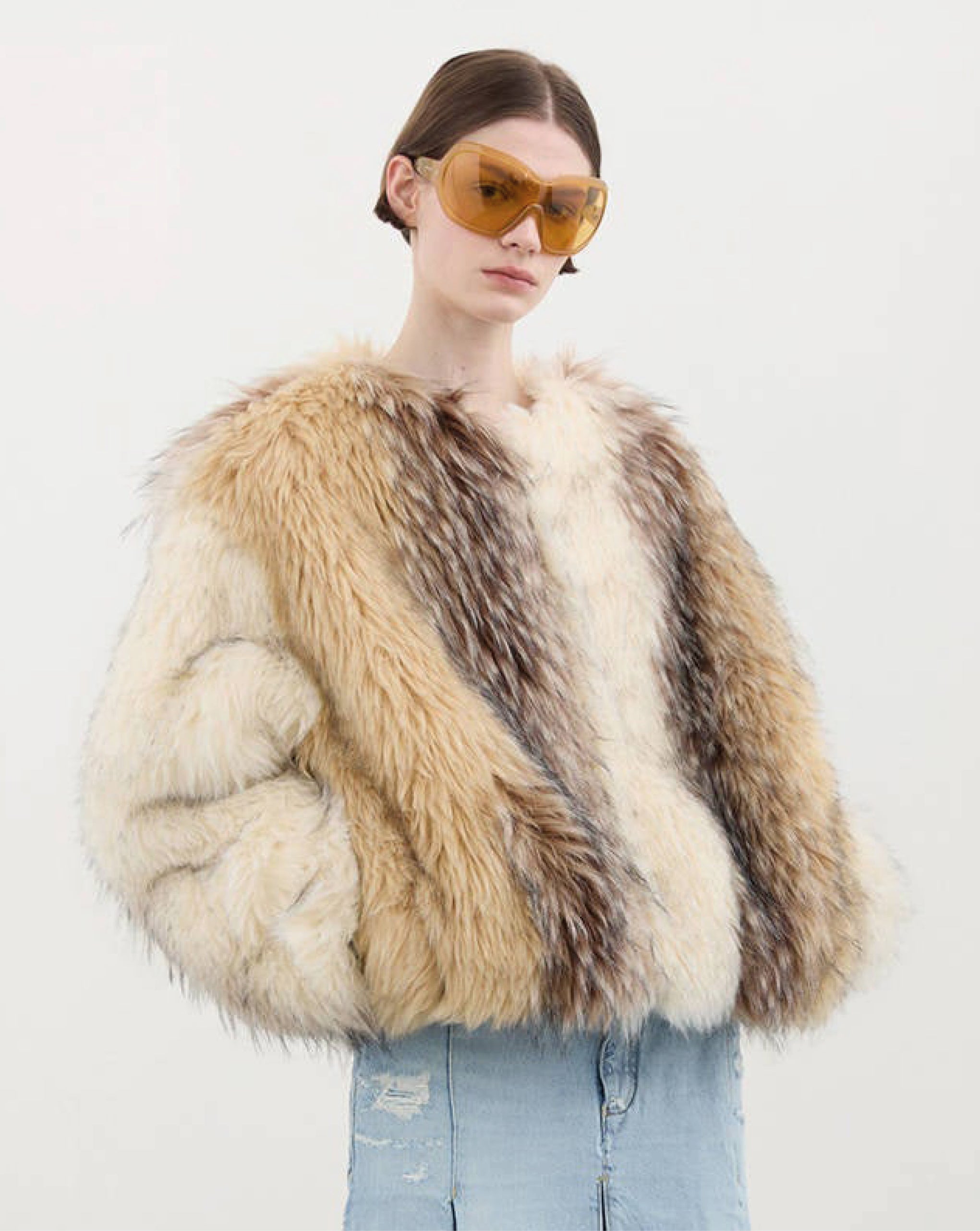 Halfboy faux fur jacket showcasing a striking, textured look that brings both volume and warmth to your wardrobe. Designed with care, it includes a cozy inner lining for extra comfort and a neat front zip closure. Features include a front zipper and convenient side pockets