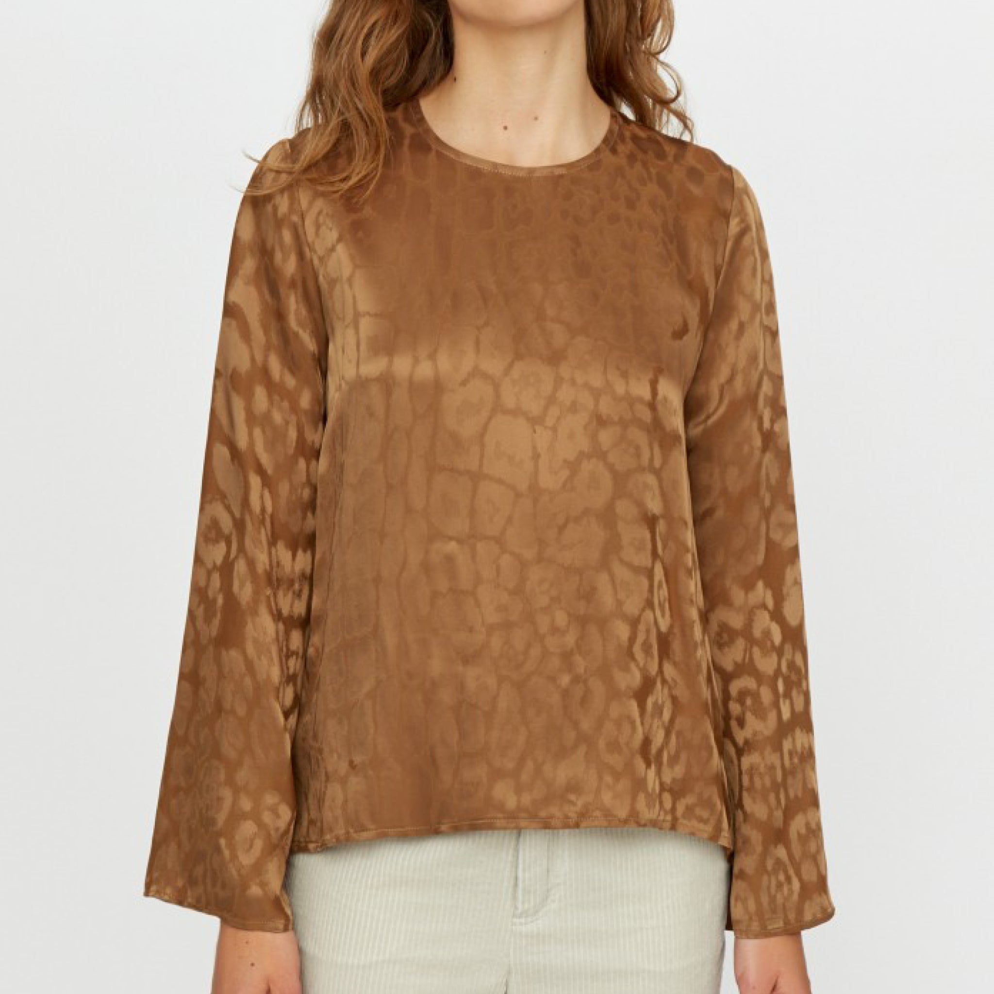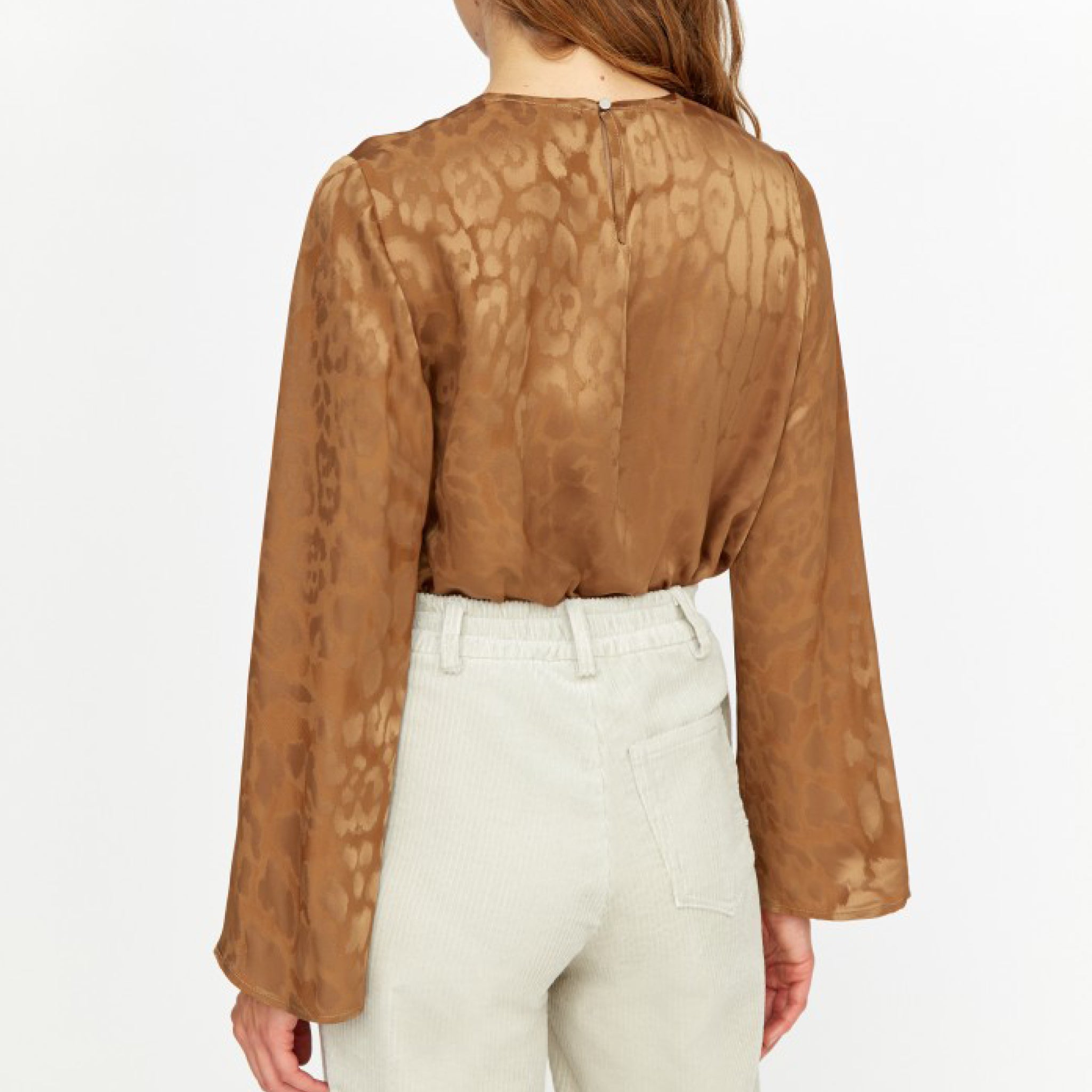 Color — CafeTrue to size — Straight cut— Round collar— Back neckline closed by a button— Long flared sleeves— 53% Acetate 47% Viscose