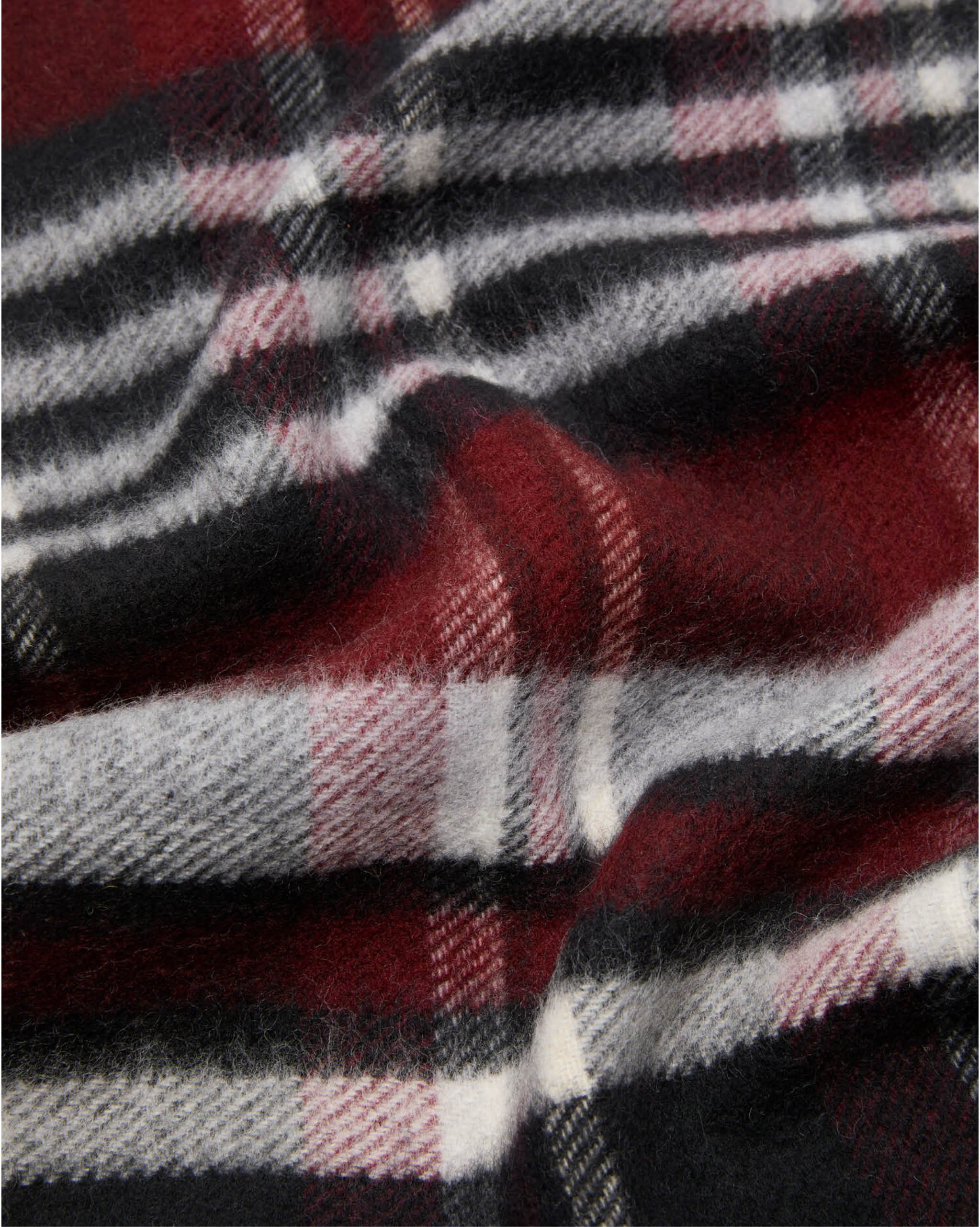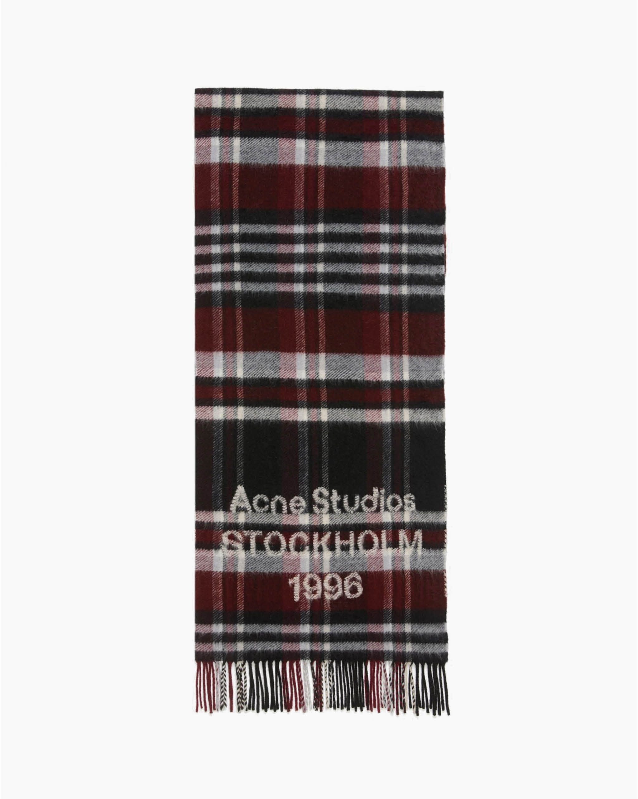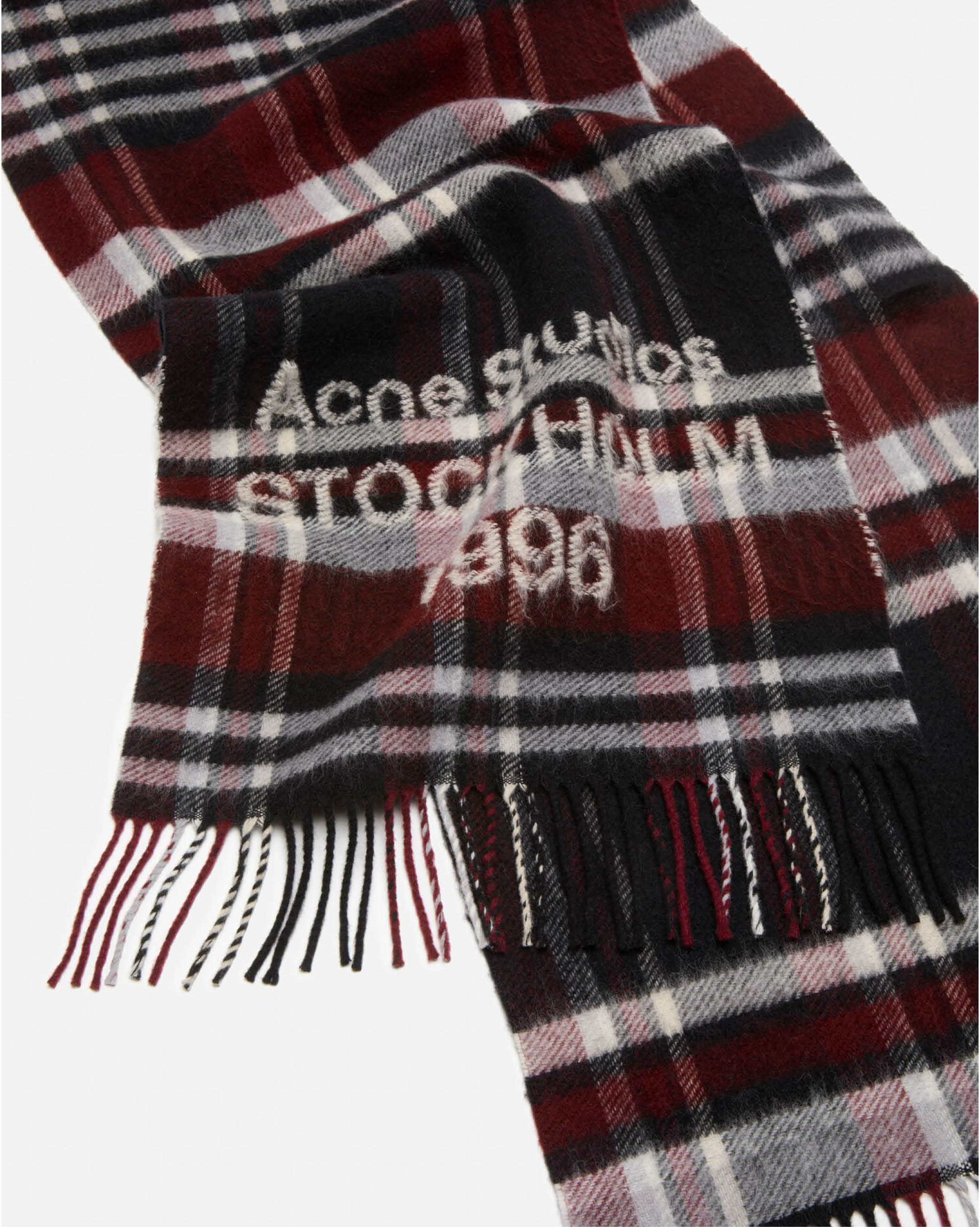 Acne Studios fringe scarf crafted from a wool blend with a soft hand-feel, featuring an all-over check pattern. Detailed with a Acne Studios logo on both the front and back