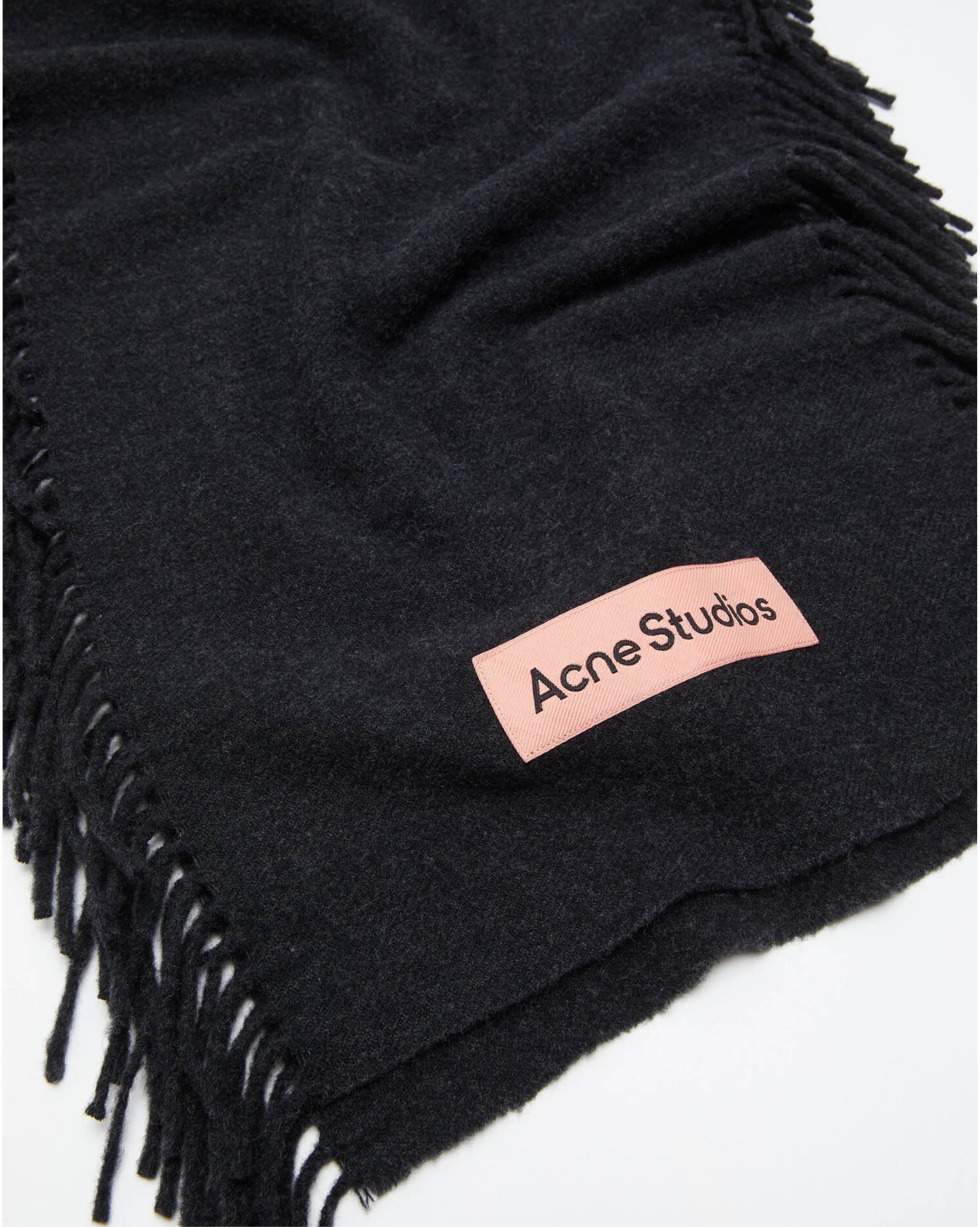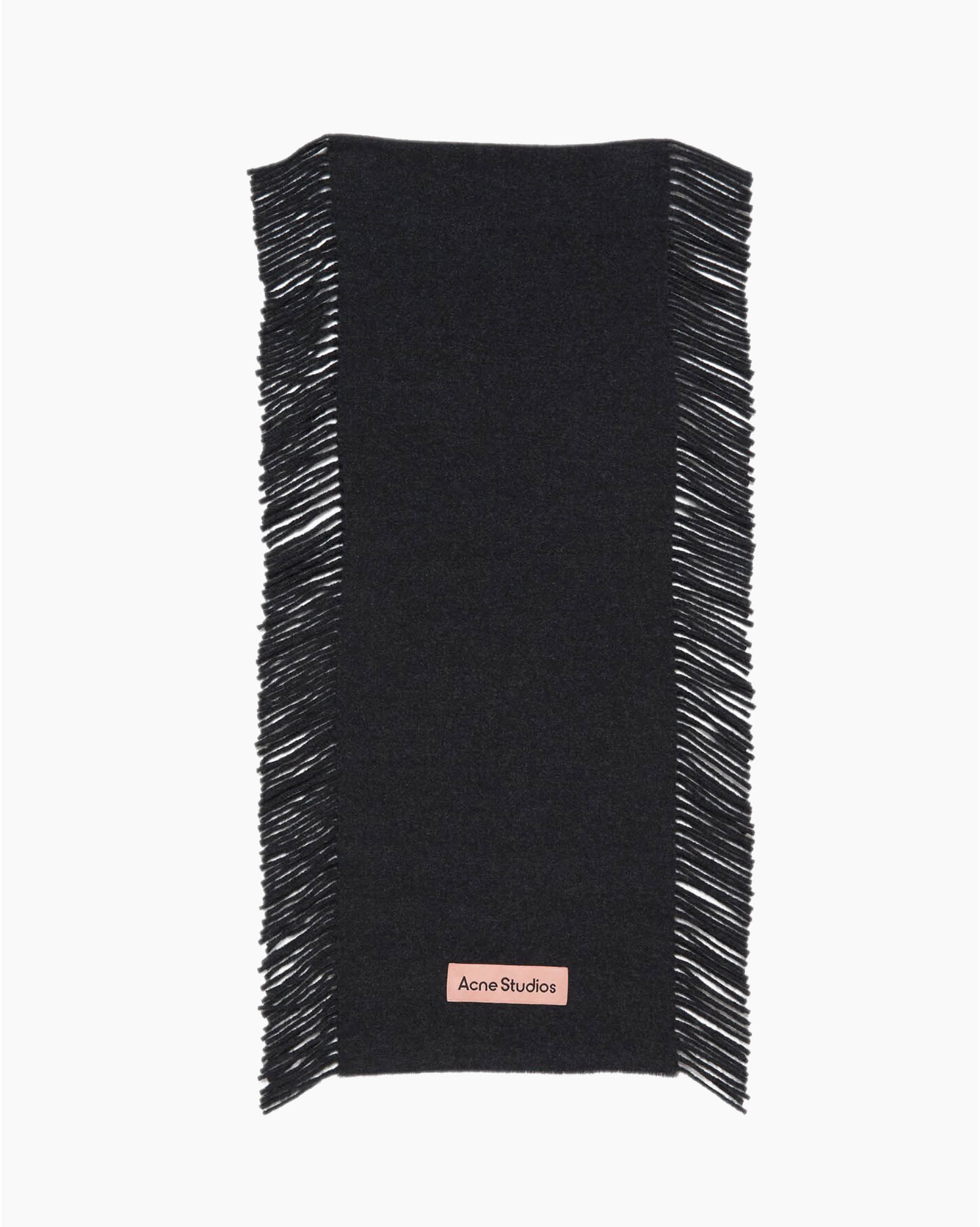 Acne Studios scarf featuring long fringe detailing on each side and an Acne Studios pink label. Crafted from midweight wool with a soft hand-feel