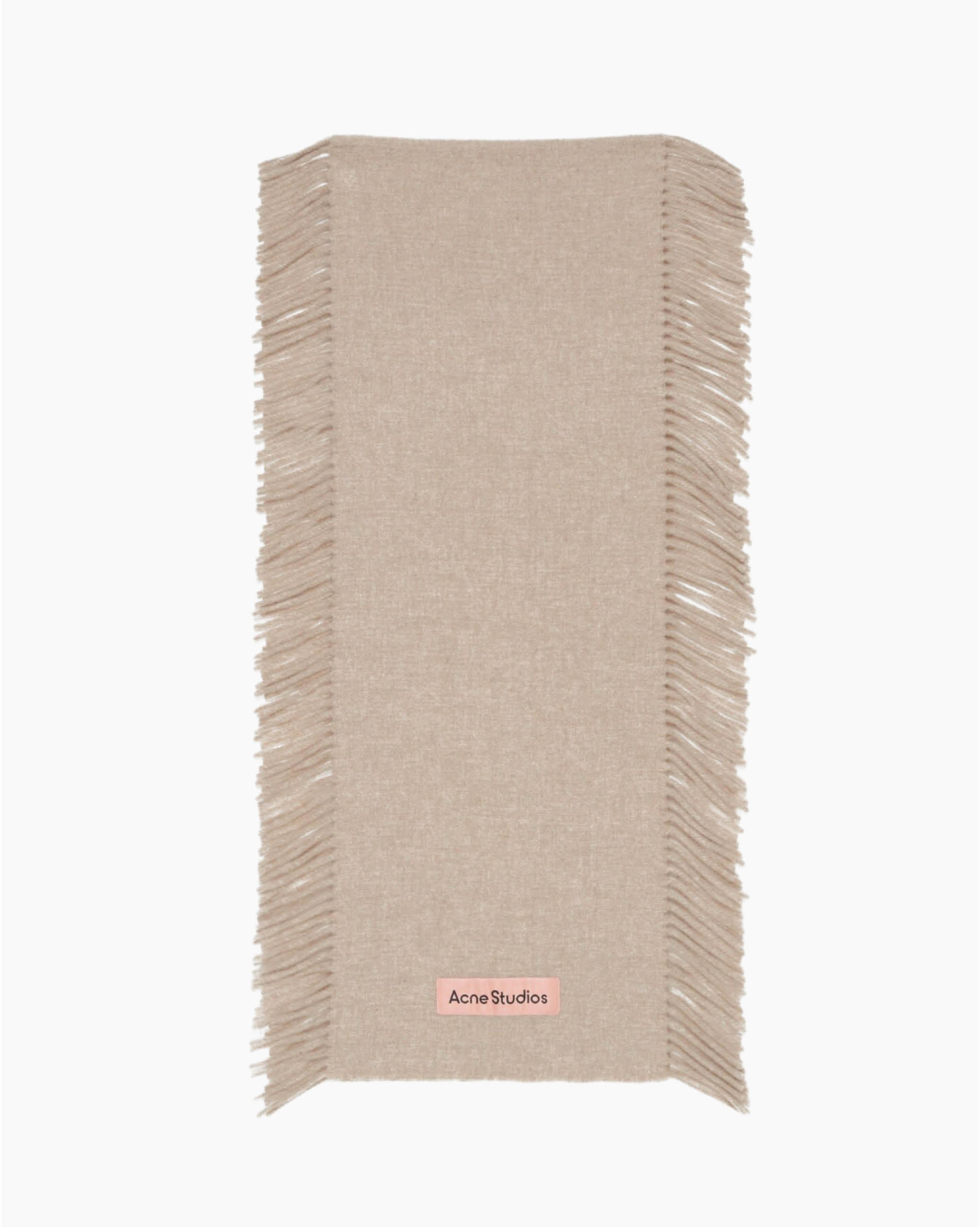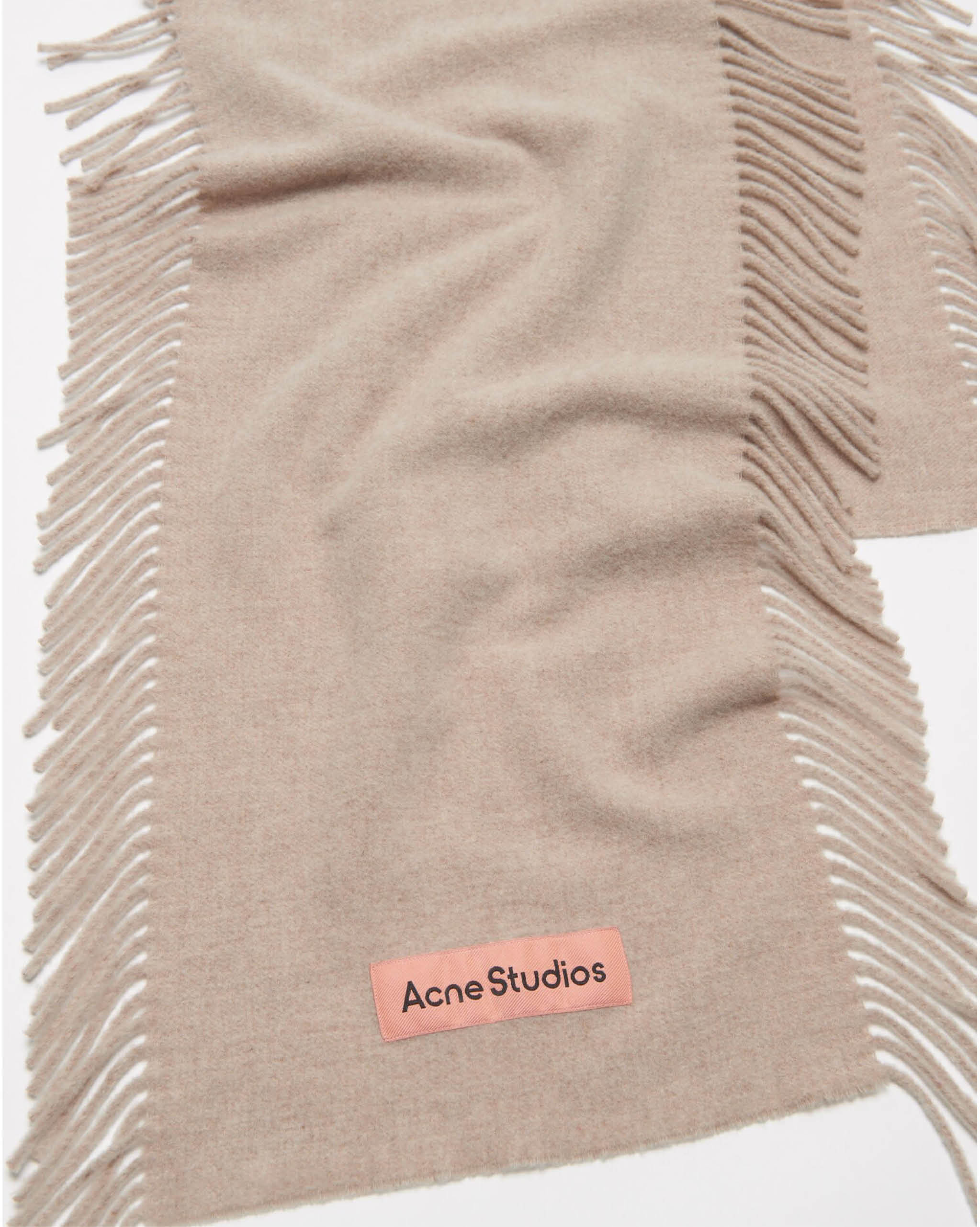 Acne Studios scarf featuring long fringe detailing on each side and an Acne Studios pink label. Crafted from midweight wool with a soft hand-feel