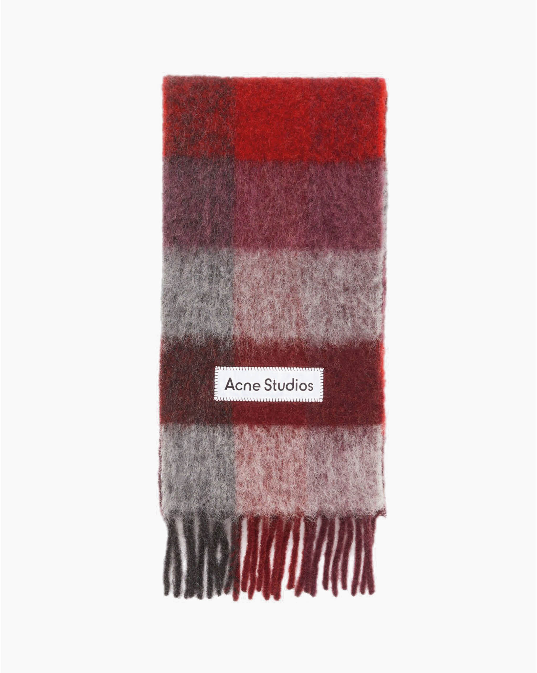 Acne Studios checked scarf made of a soft mohair blend with fringed ends. Detailed with an Acne Studios embroidered logo. Crafted from carefully selected material known for its soft and hairy fibres