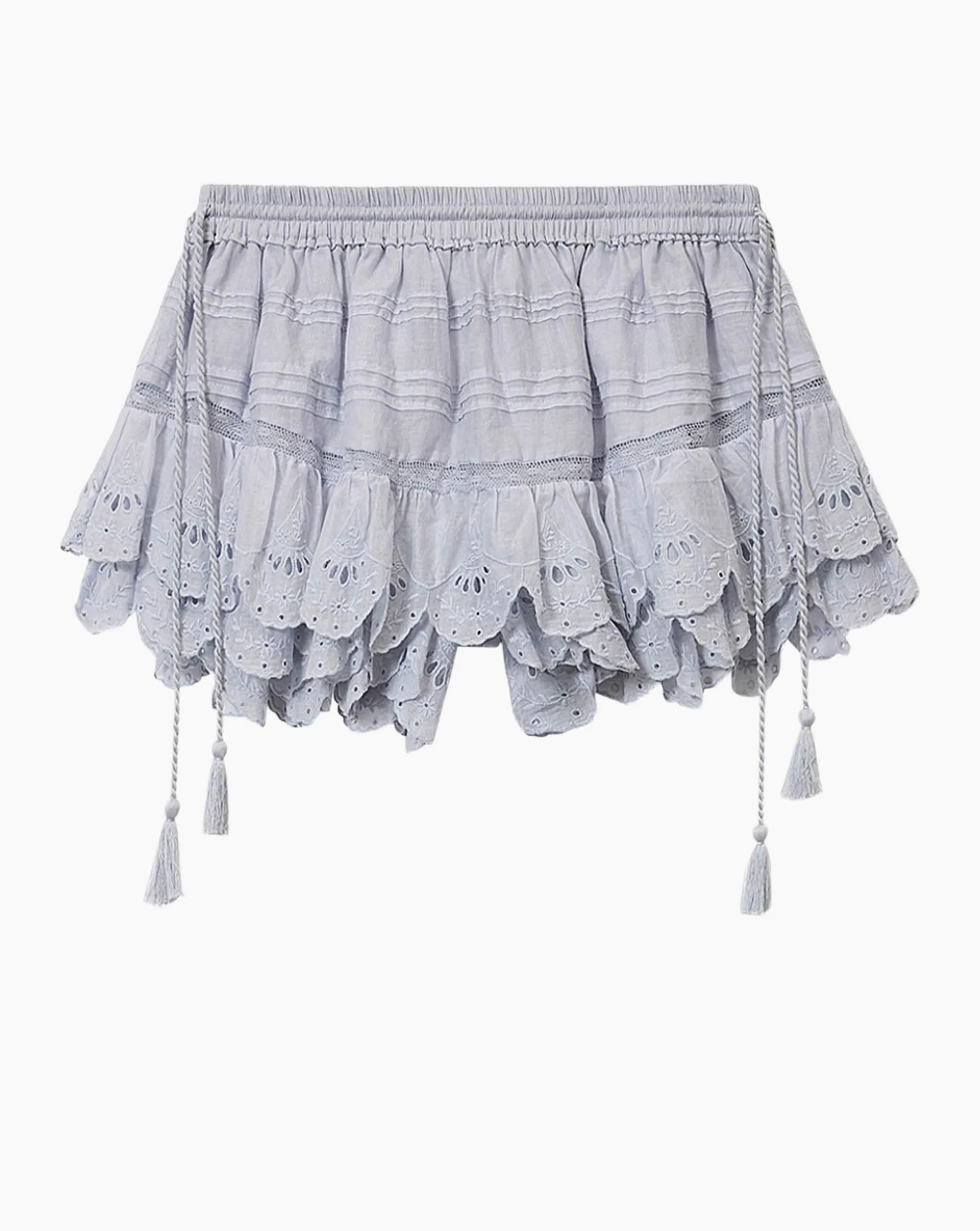 Marant Etoile ruffled shorts faturing intricate lace detailing and a gentle elasticated waistband for all-day ease, they showcase a flattering tiered silhouette enhanced by charming tassel accents