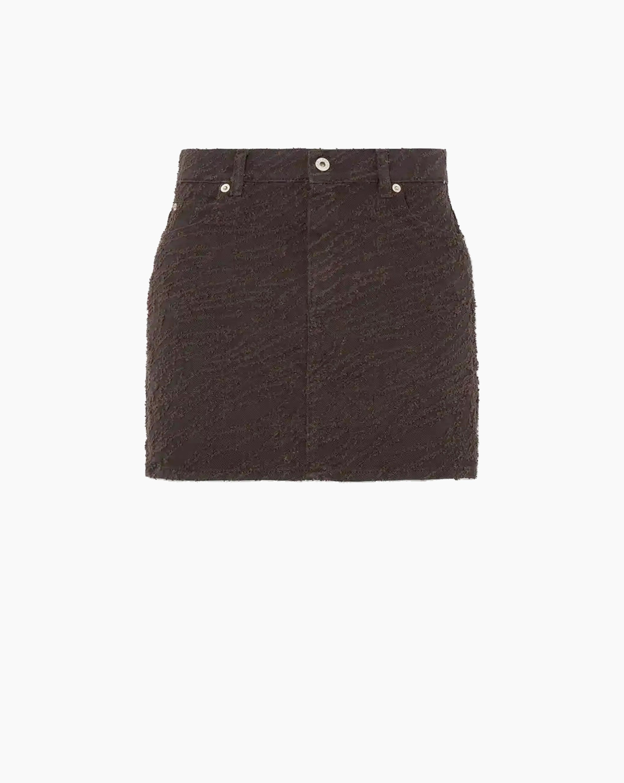 Halfboy mini skirt featuring a high waist and crafted from textured cotton. It includes a front button and zip closure, belt loops, five-pocket design, and a slit detail at the back for added style and comfort