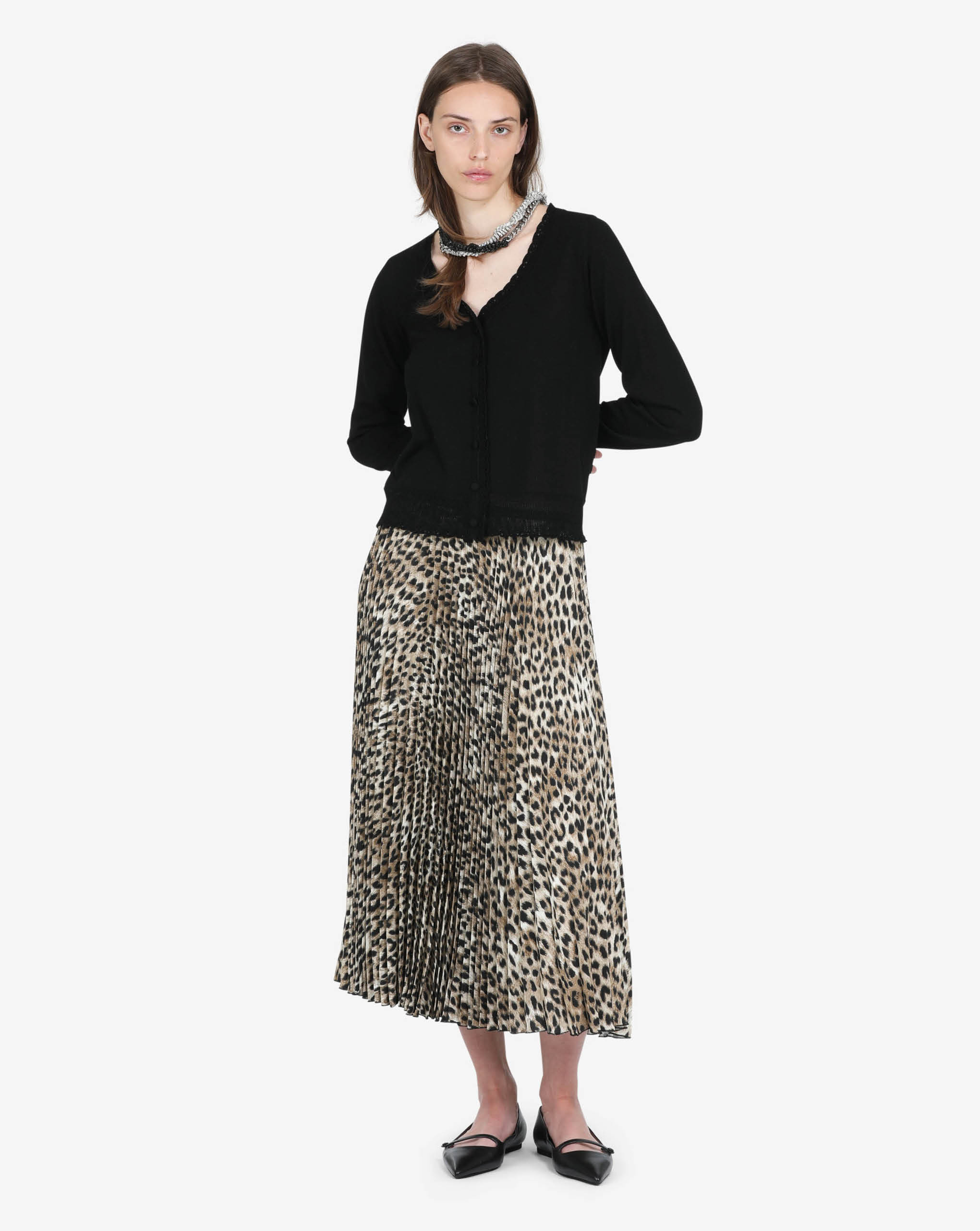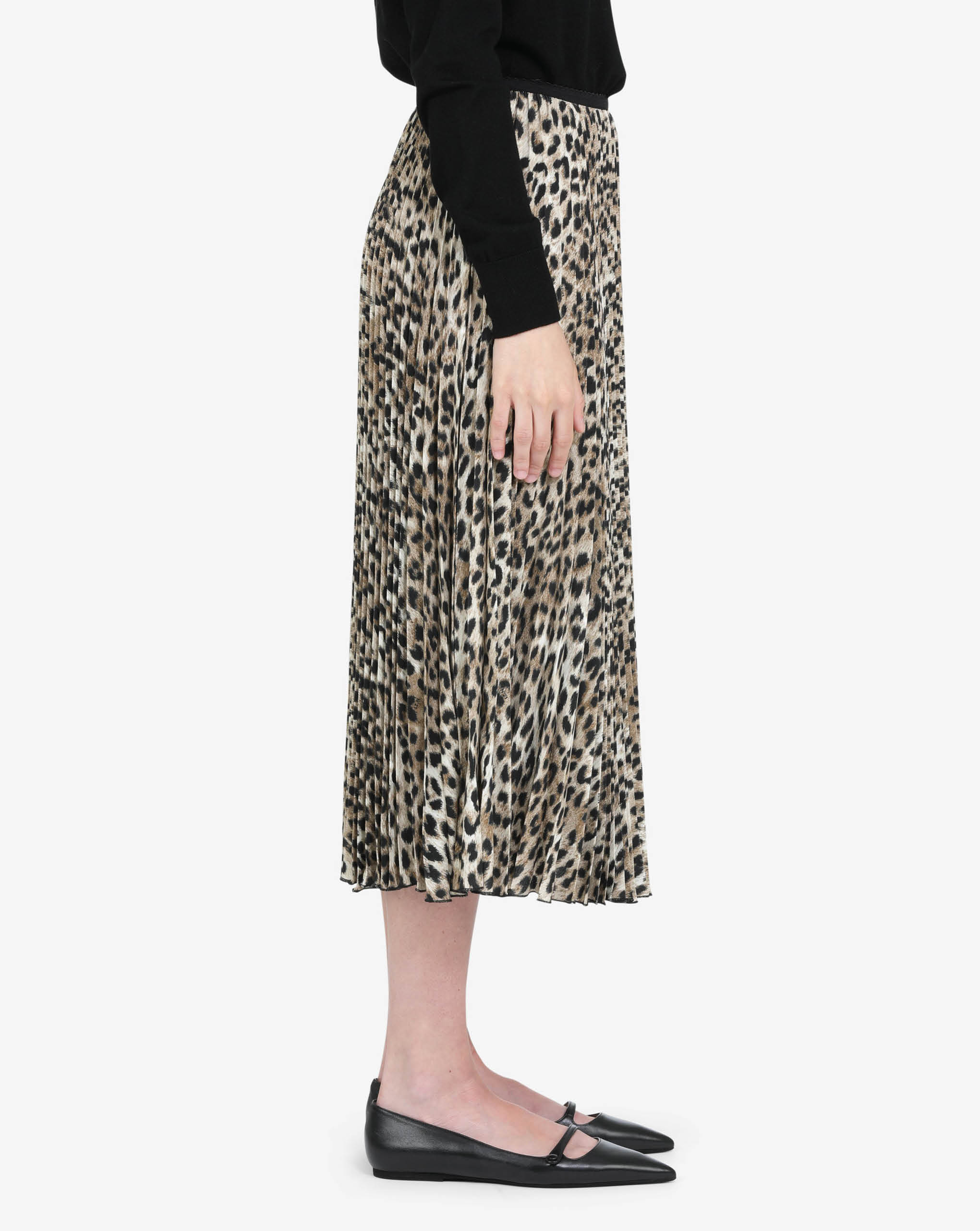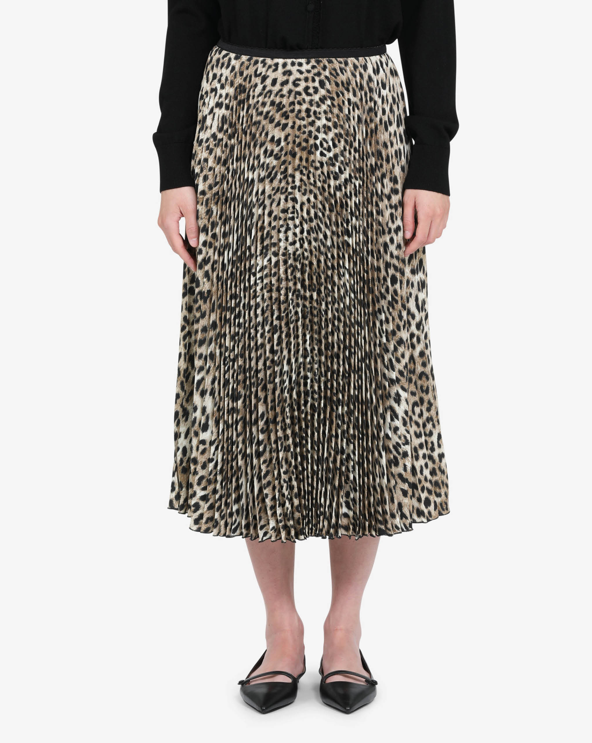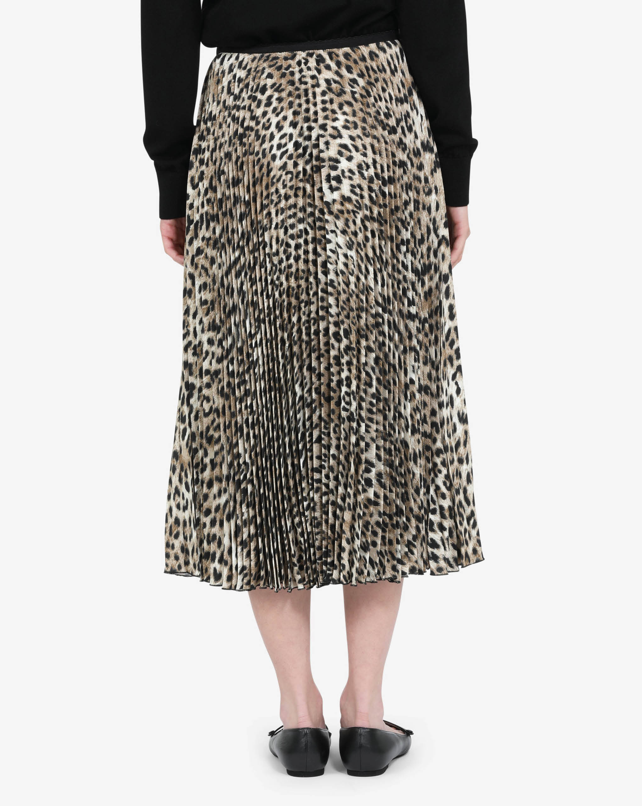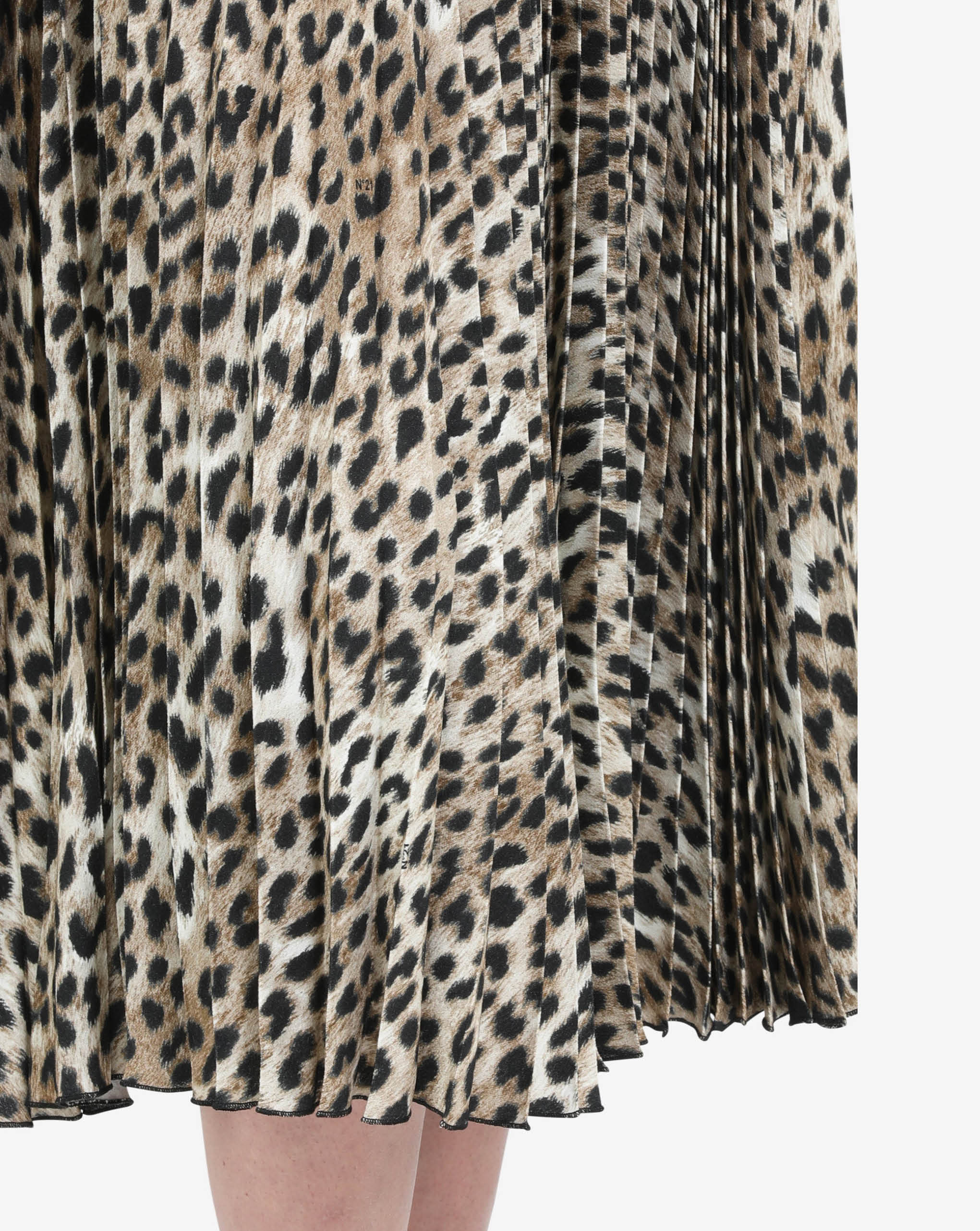 N21 pleated midi skirt with leopard print featuring uniform pleats from waist to hem. The custom print uses neutral tones of beige, brown, and black and length reaches mid-calf.