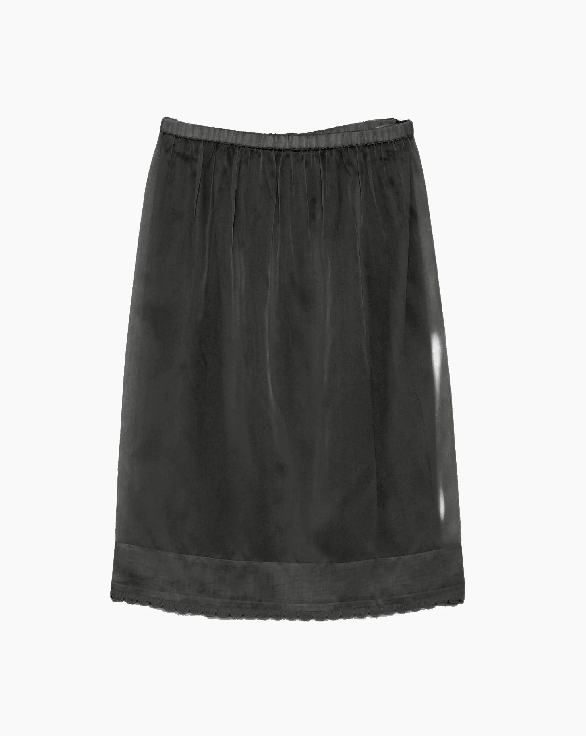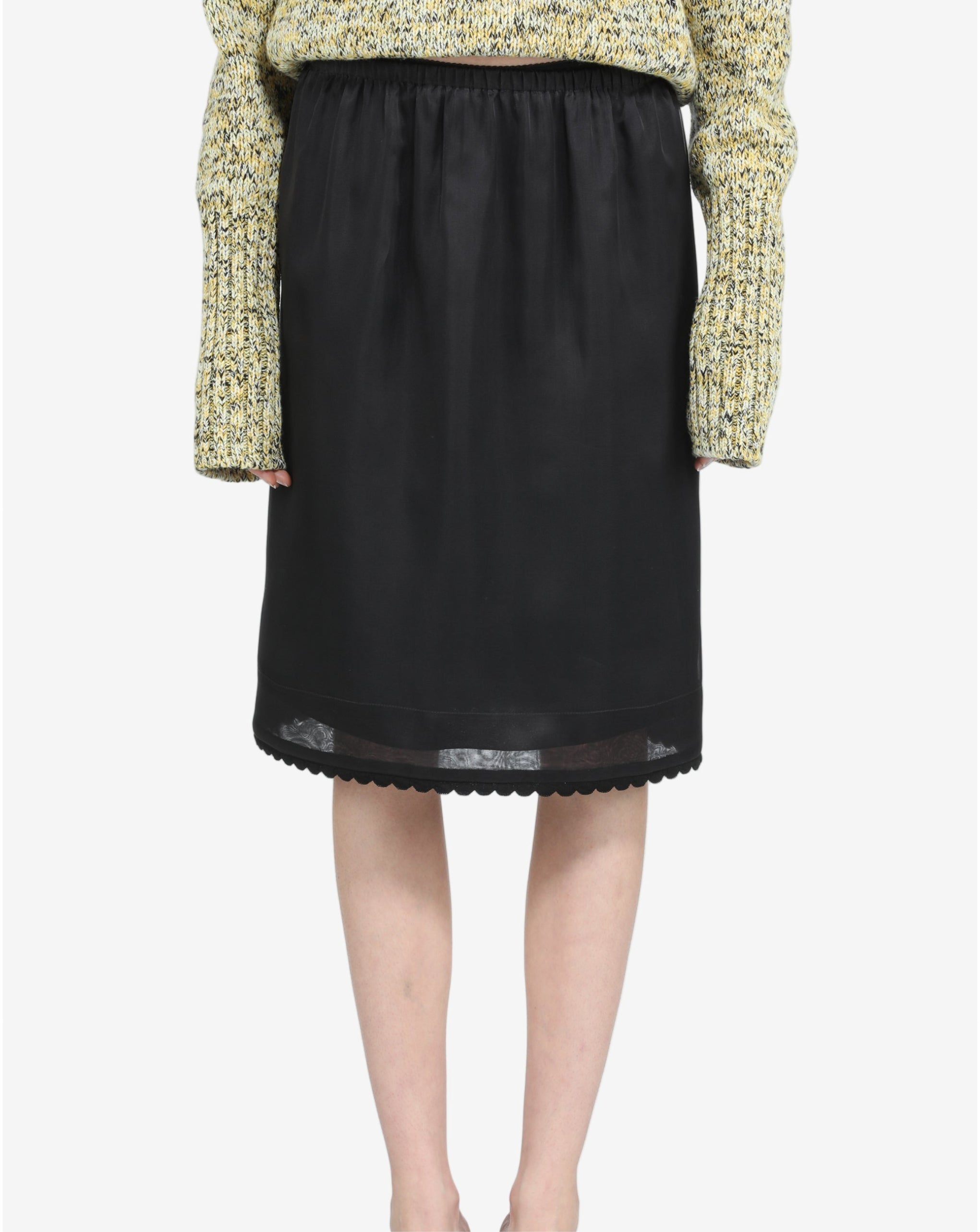N21 midi skirt made of lightweight fabric, featuring a simple, classic design. The elastic waistband ensures a comfortable fit, ensuring a snug fit. The skirt features a decorative scallop trim, adding a touch of elegance. Available in a neutral shade, this skirt is suitable for a variety of occasions and can be easily paired with a variety of outfits