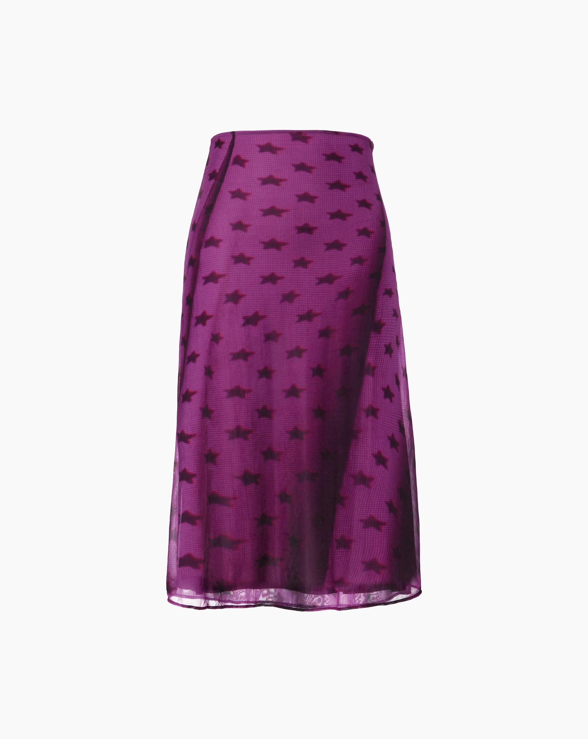 Acne Studios midi skirt crafted from a semi-sheer, stretchy fabric with a high-waisted fit, adorned with a star pattern throughout