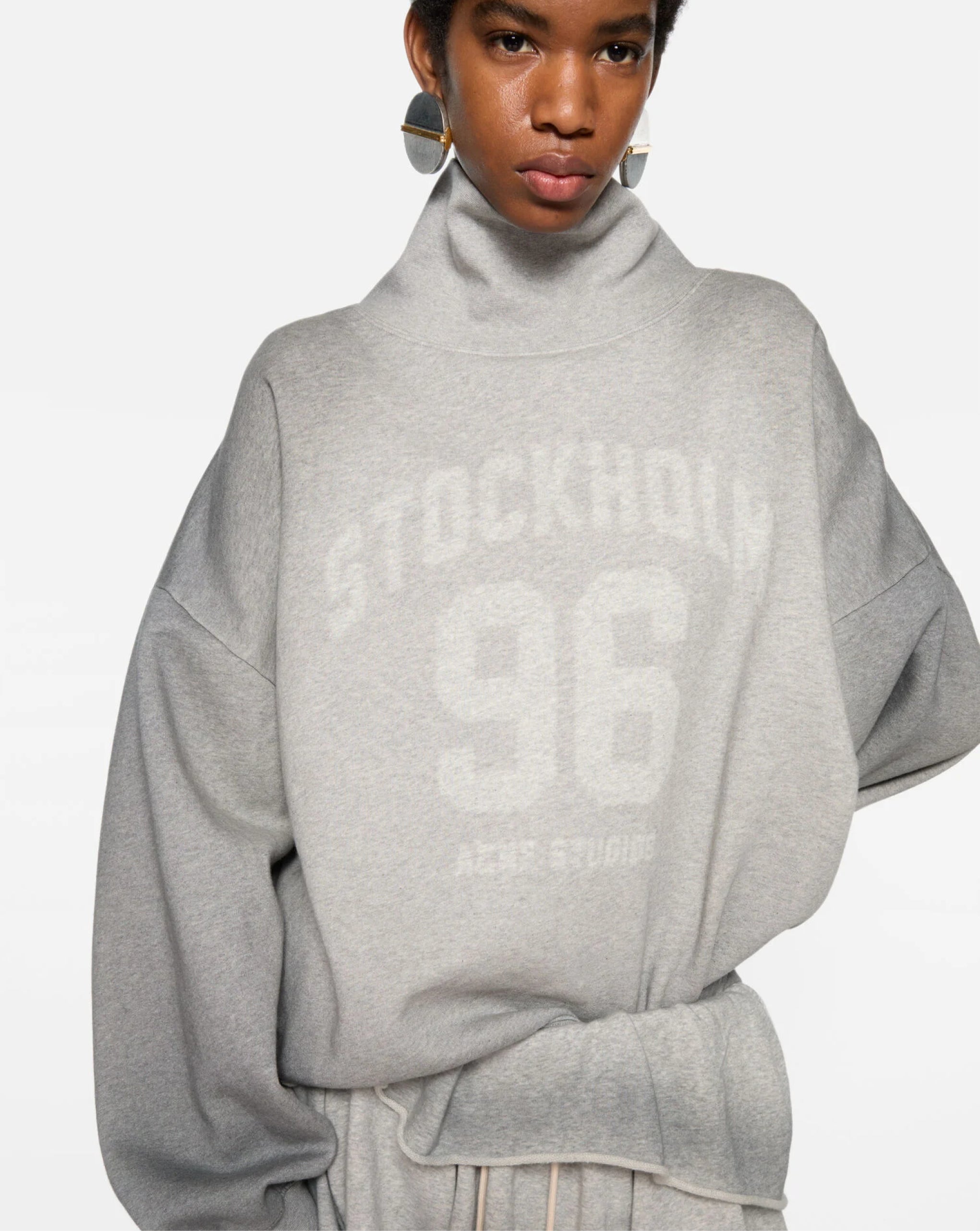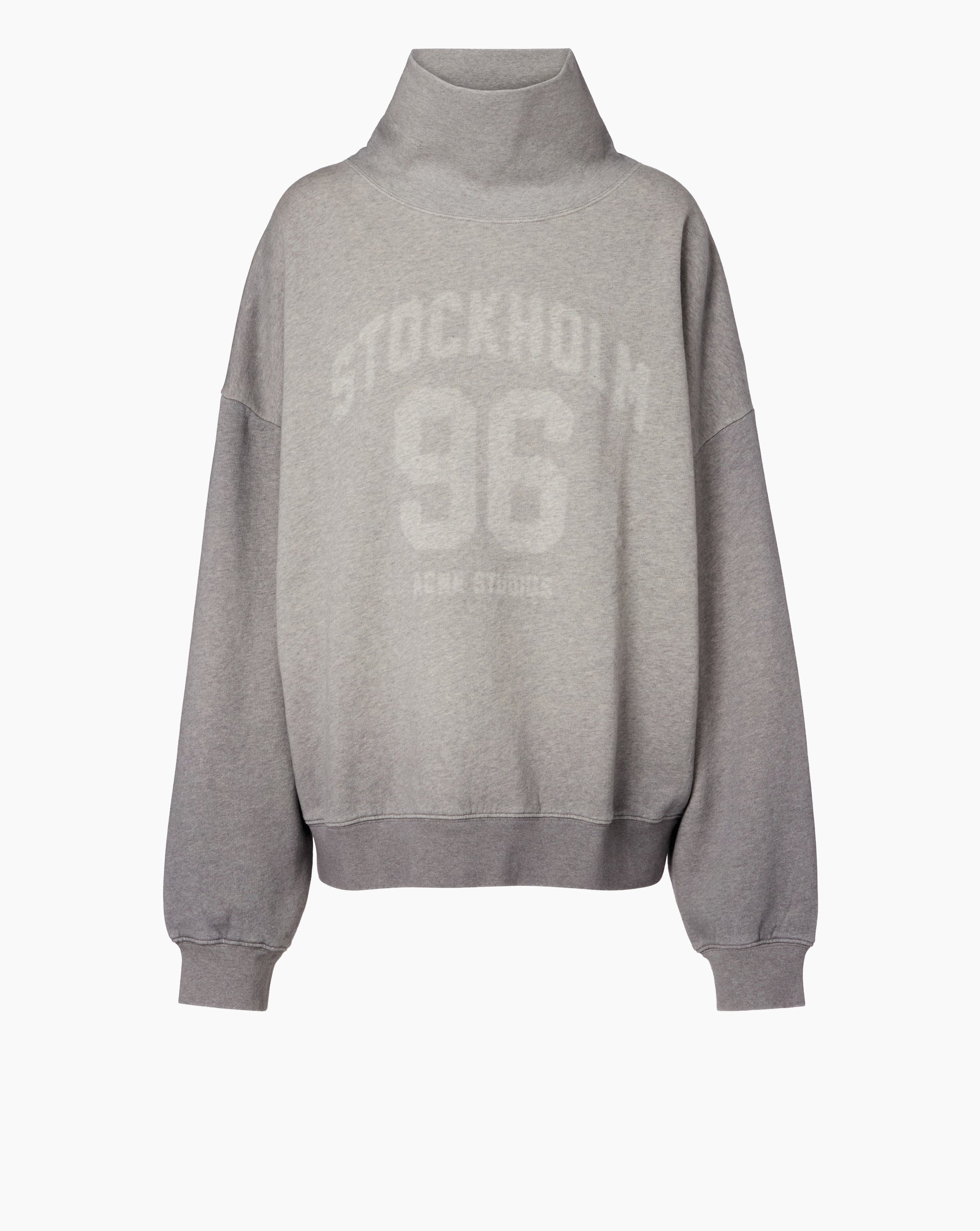 Acne Studios high-neck sweater crafted from midweight jersey, featuring college-inspired seasonal logo artwork on the front. Finished with ribbed cuffs and hem. Cut to a relaxed fit and hip length