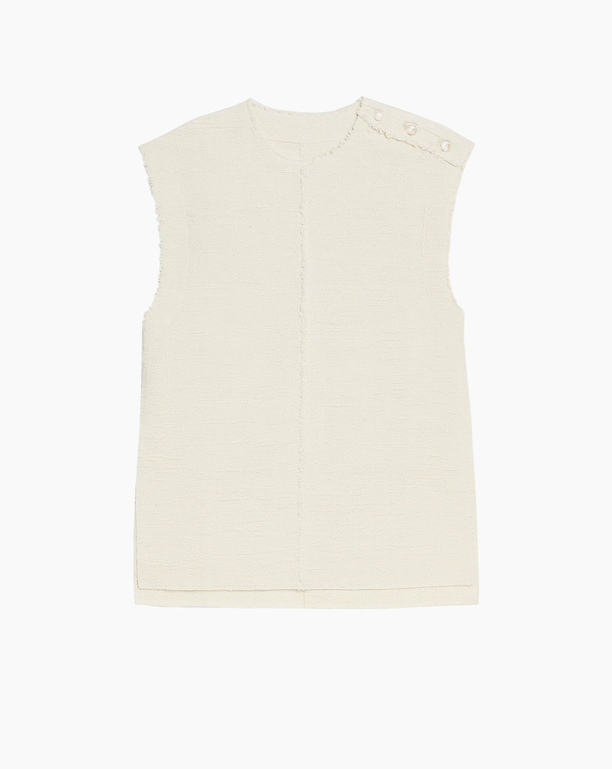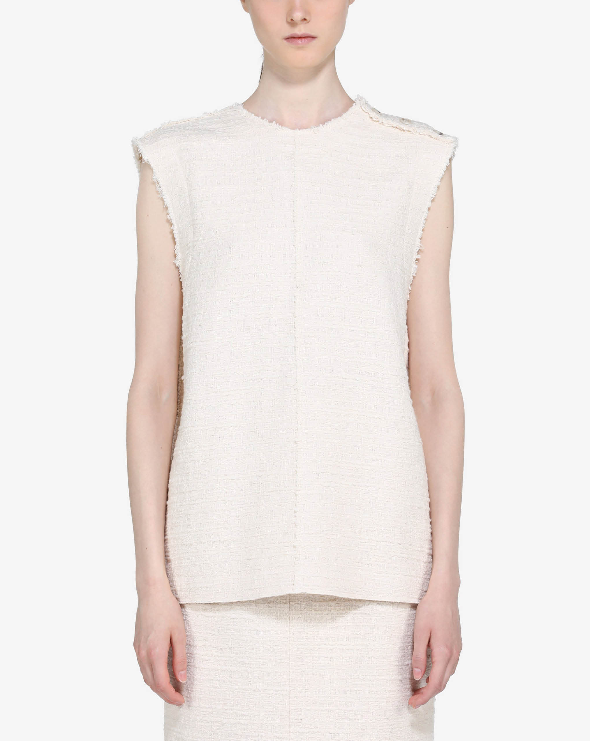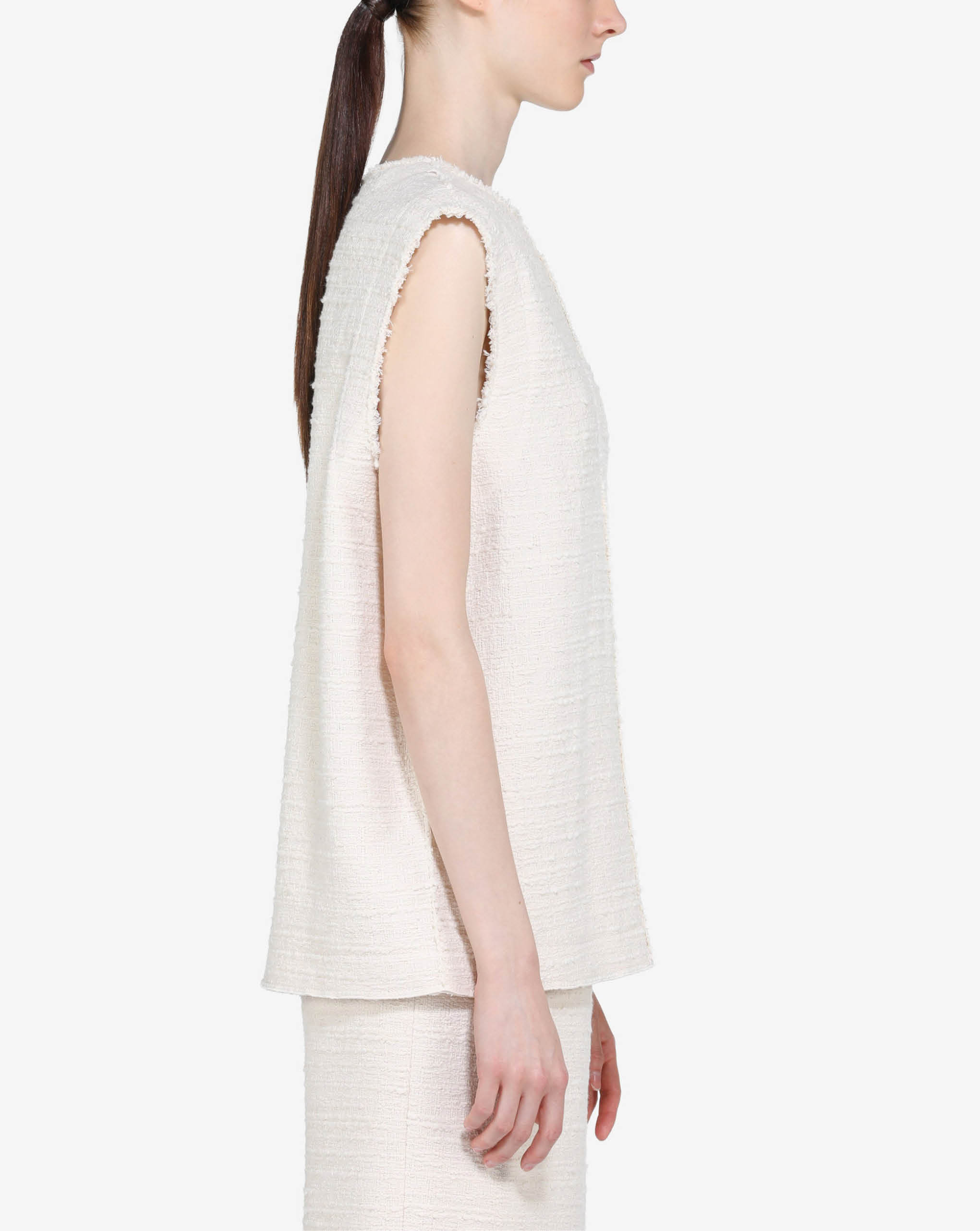 N21 sleeveless top made of ivory textured bouclé fabric. Relaxed, hip-length fit. The collar features a raw, fringed edge, and the side hems have the same finish. The bouclé weave gives the garment an uneven surface