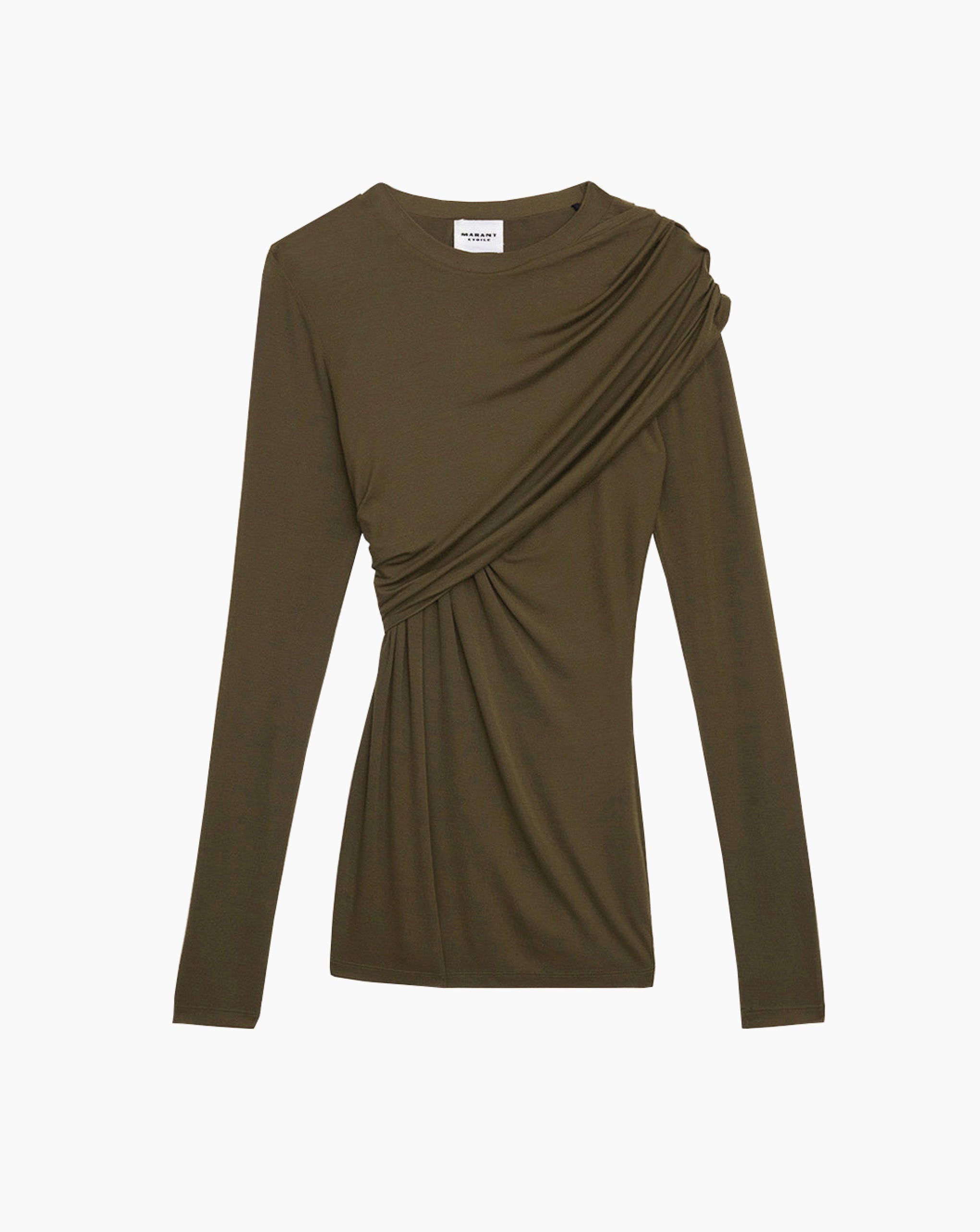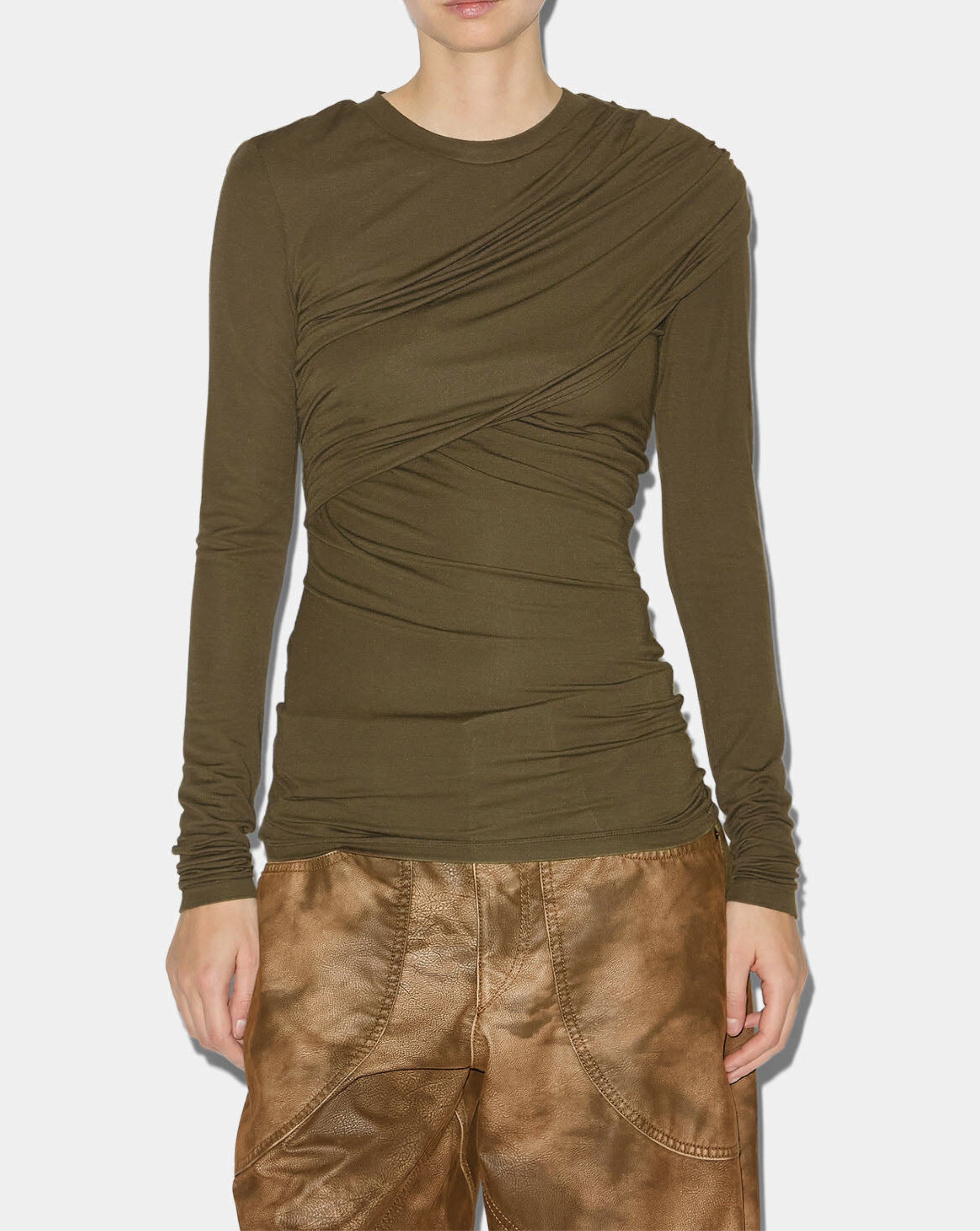 Marant Etoile jersey top featuring a plain-colored design with elegant draping. It includes a round neckline detailed with ribbed edges, gathered shoulder yoke, and long sleeves. The front and back are gathered to enhance the fitted silhouette, offering both comfort and style