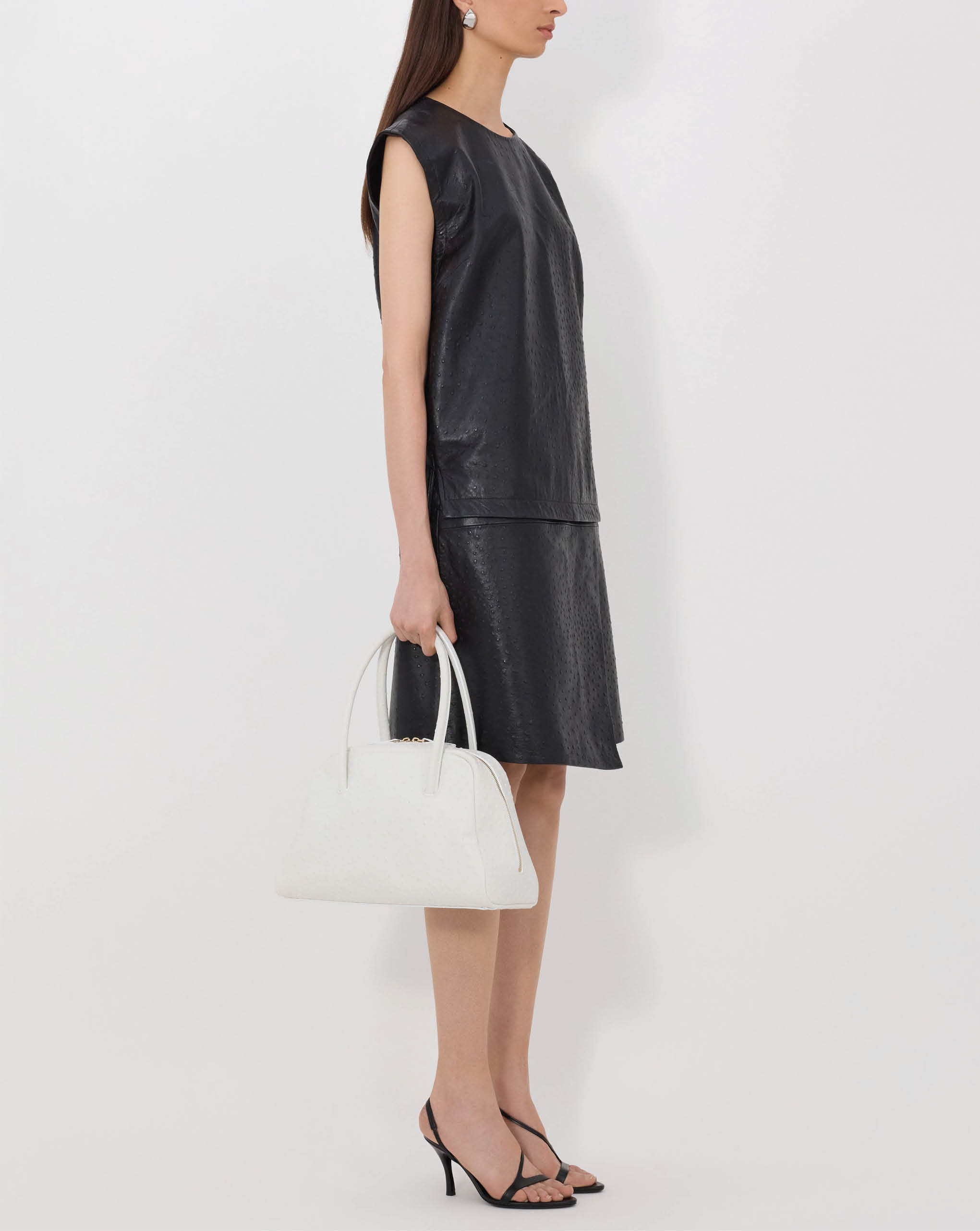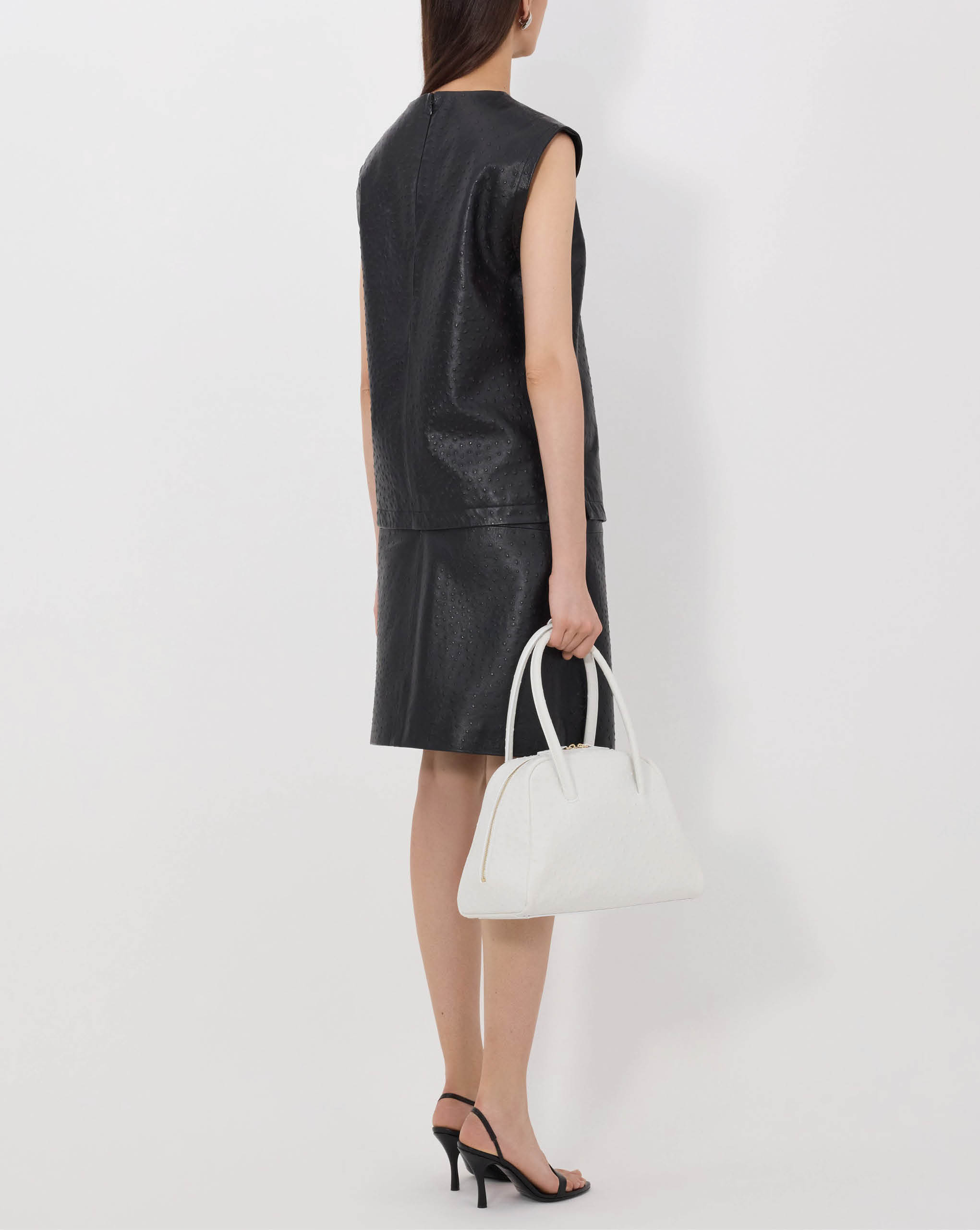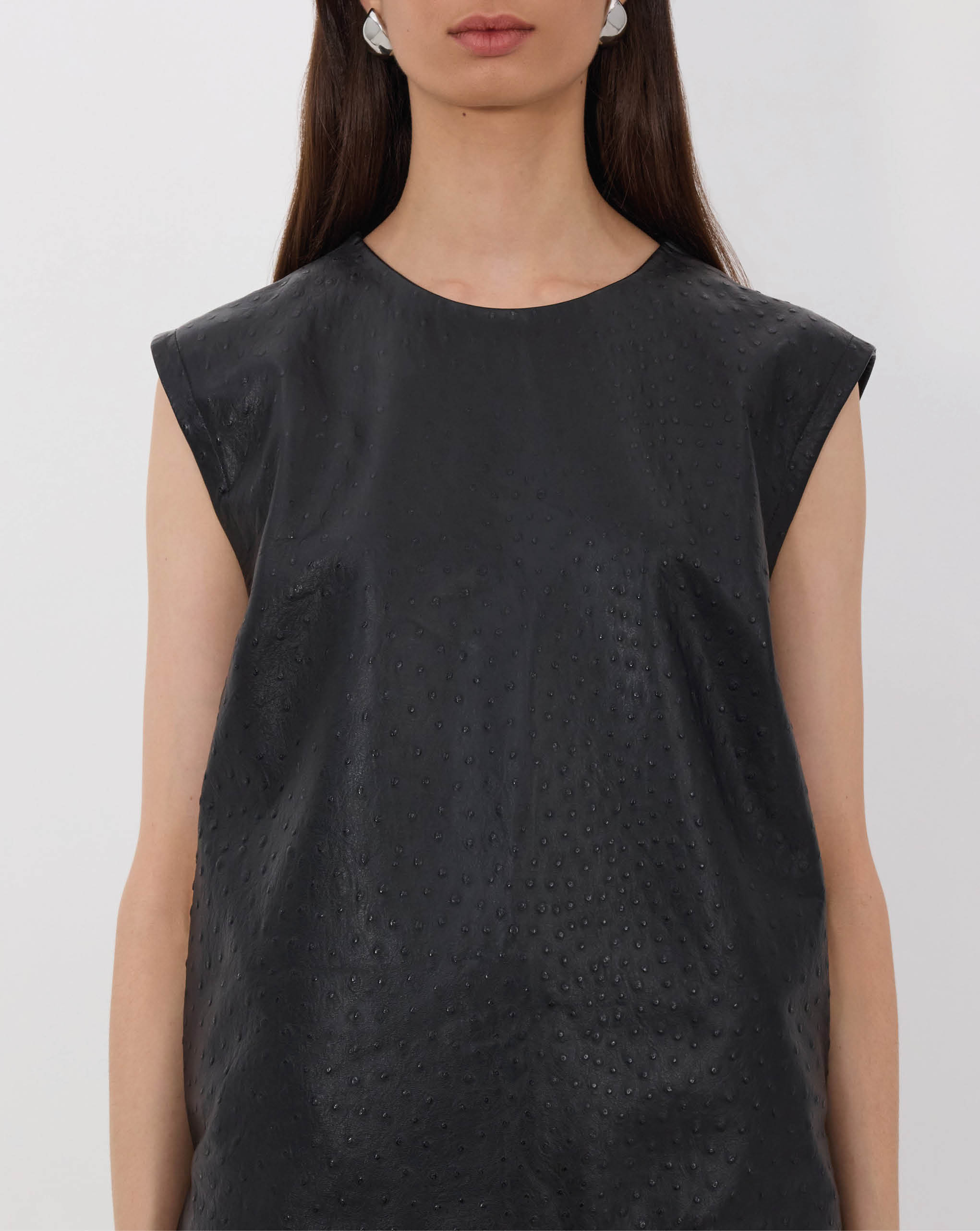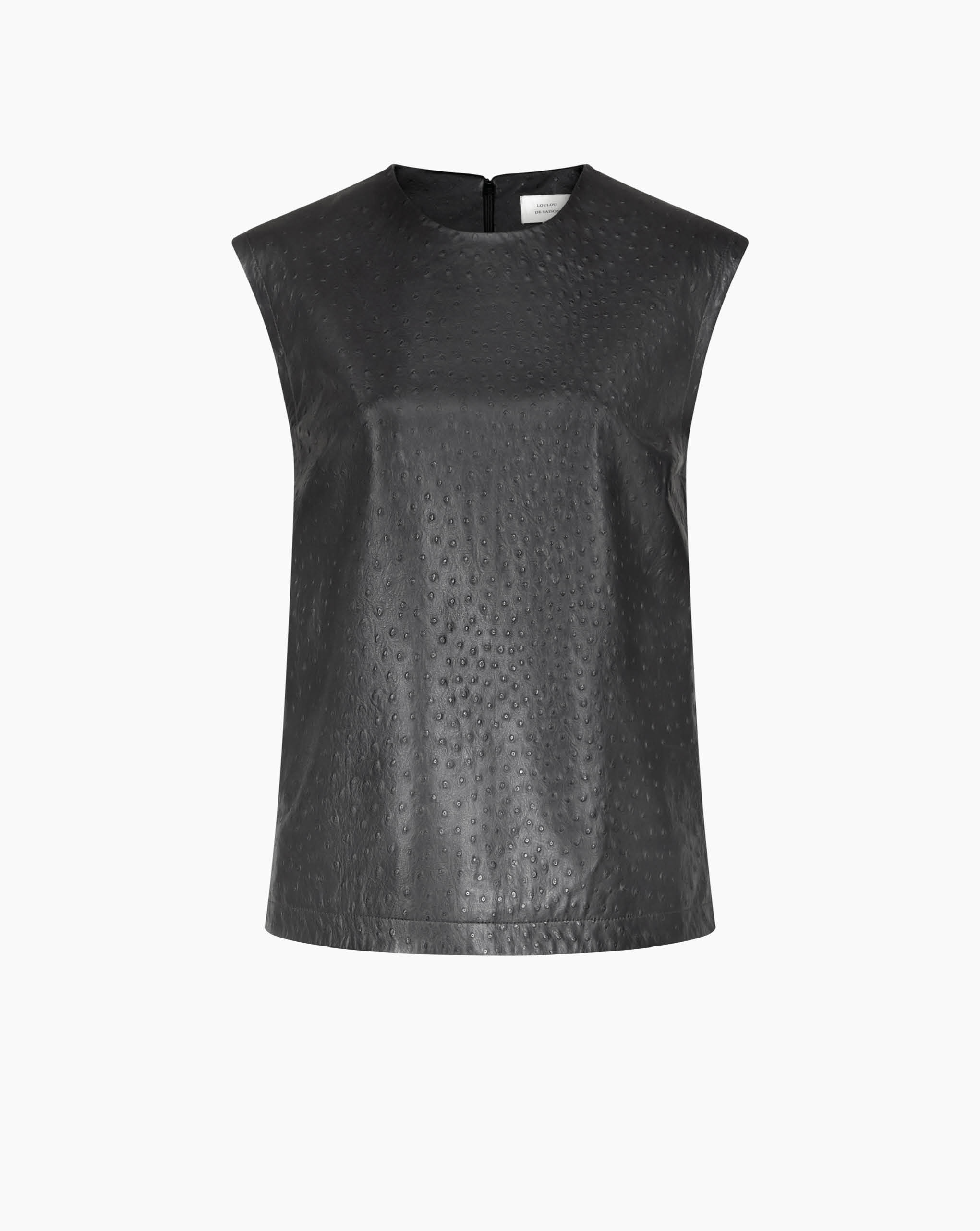 LouLou De Saison top made of ostrich-effect leather. It features a straight, ample fit, a crew neck and a zipped back fastening, creating a minimal yet striking allure