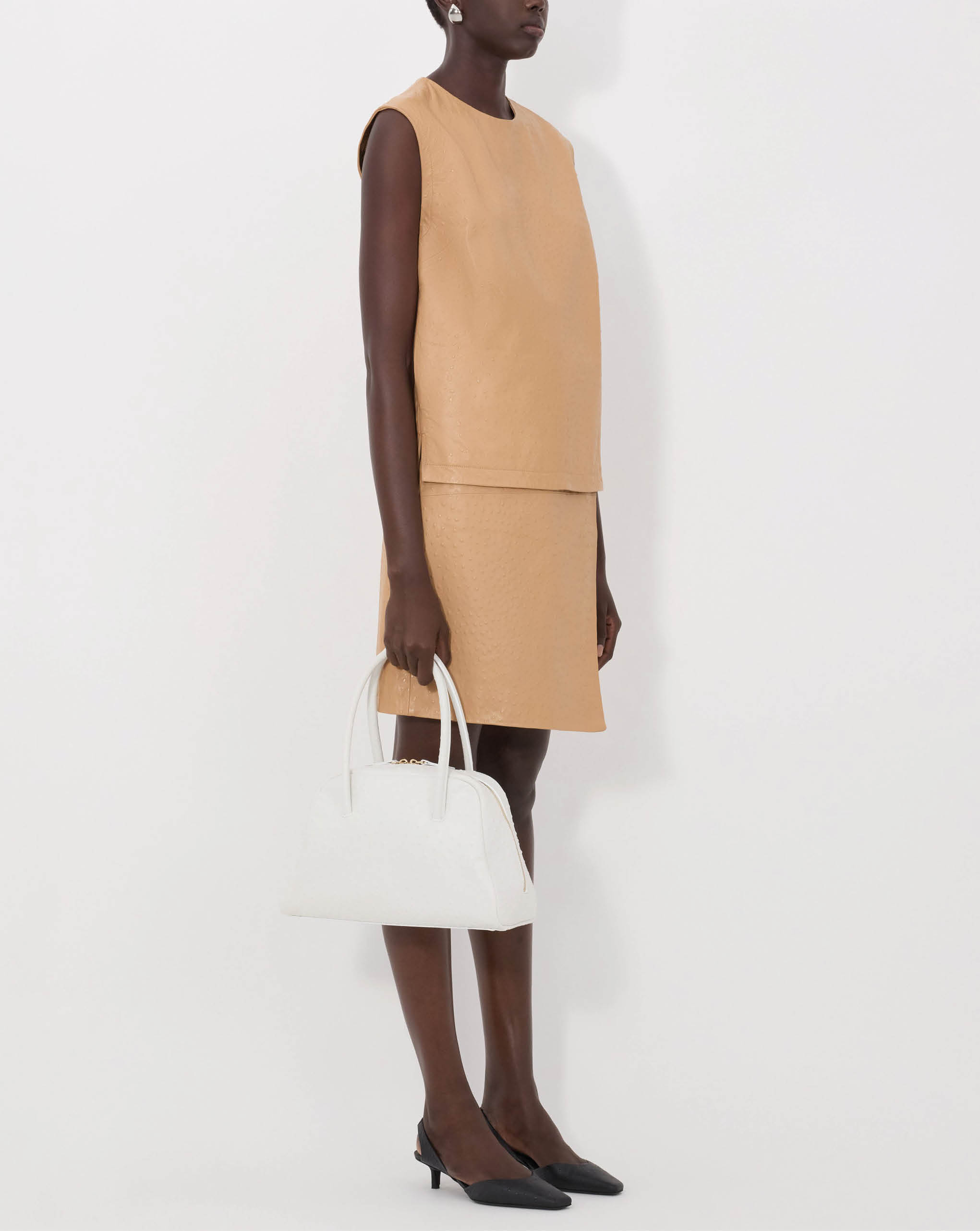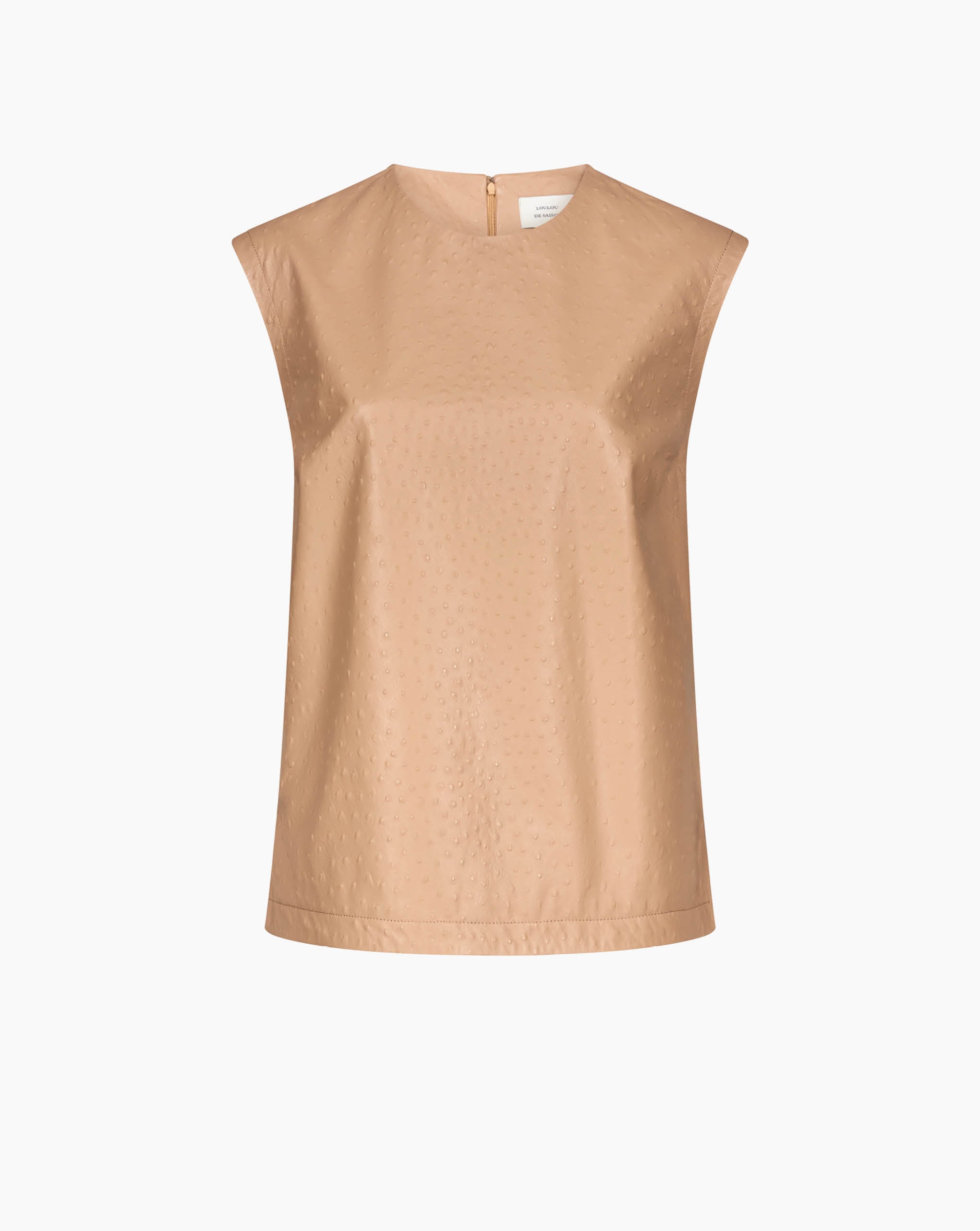 LouLou De Saison top made of ostrich-effect leather. It features a straight, ample fit, a crew neck and a zipped back fastening, creating a minimal yet striking allure