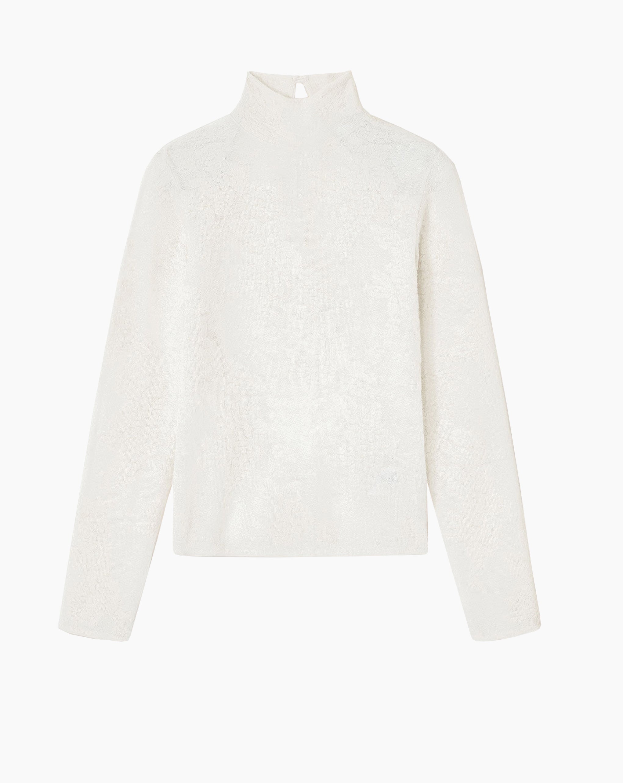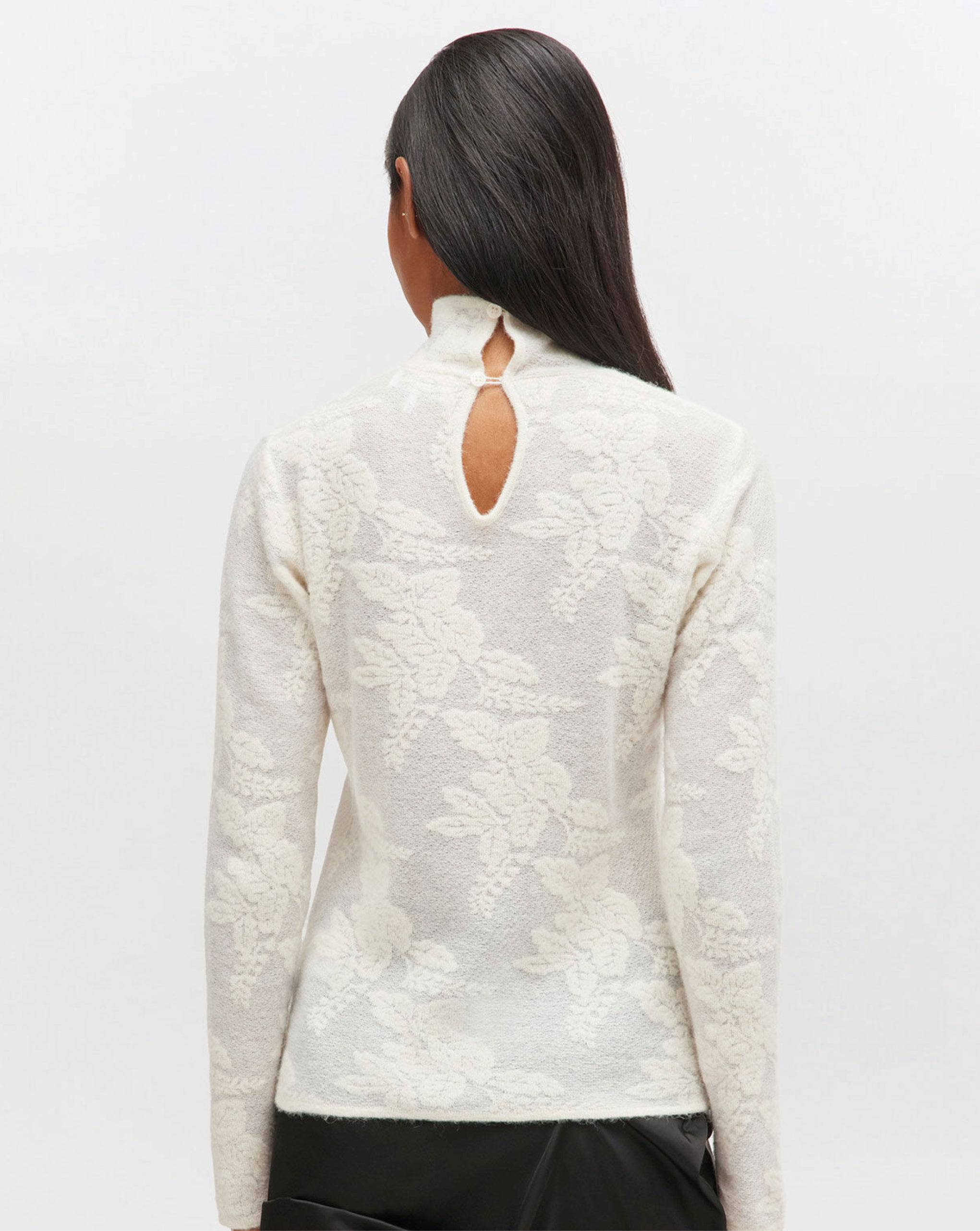 Ganni turtleneck featuring a sheer flower print, high collar and long sleeves 39% Alpaca 30% Polyamide 16% Wool 15% Recycled polyamide Color — Egret True to size