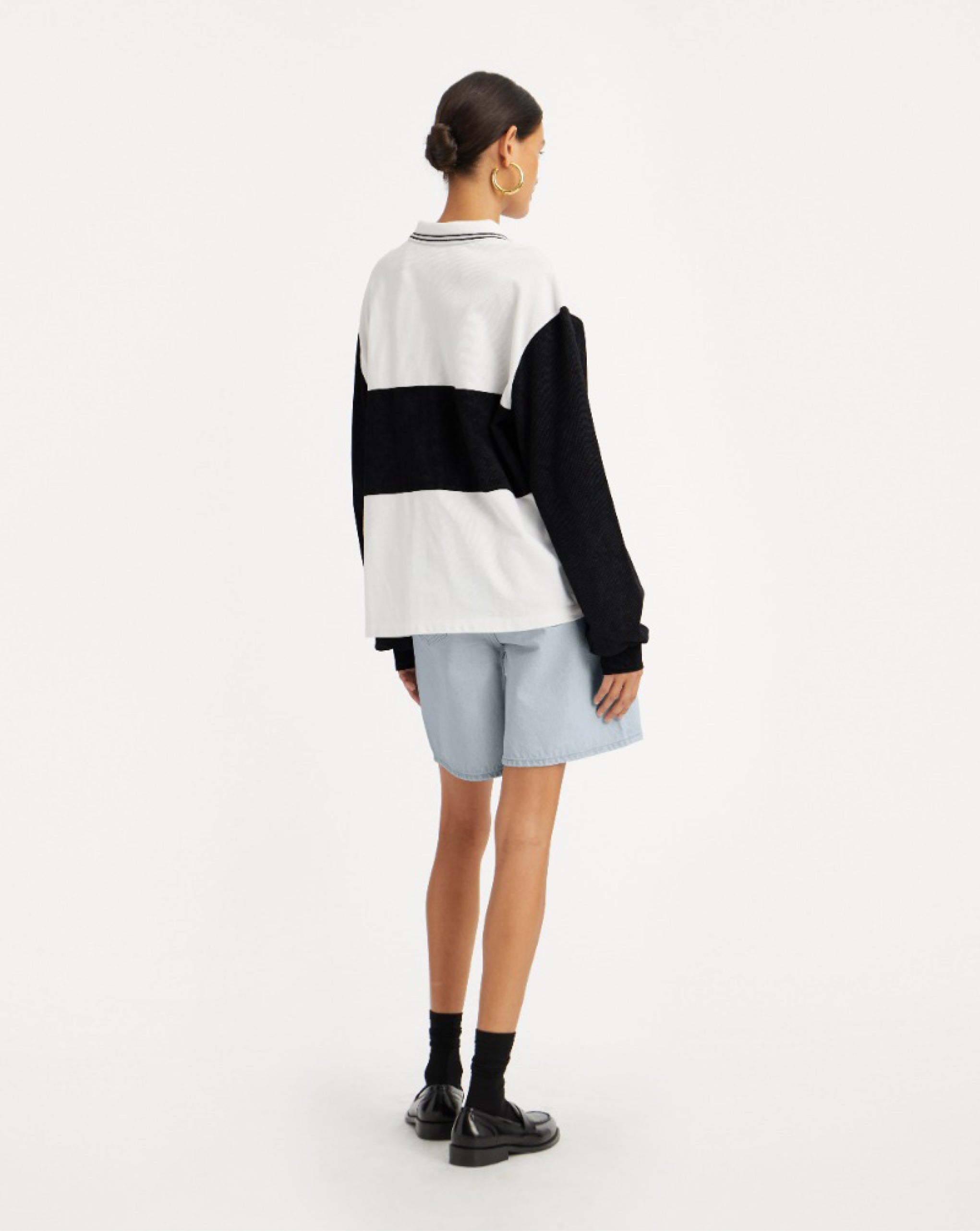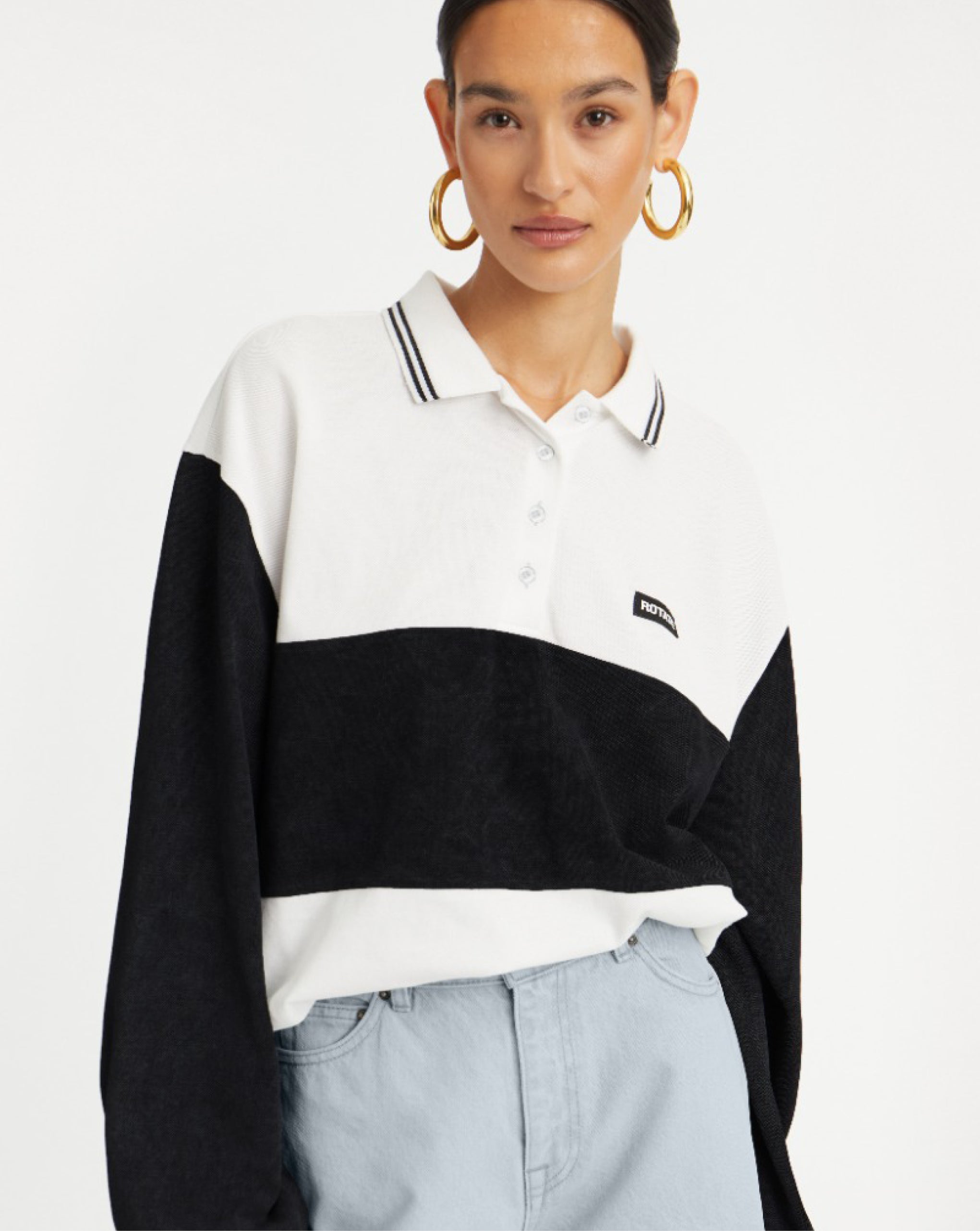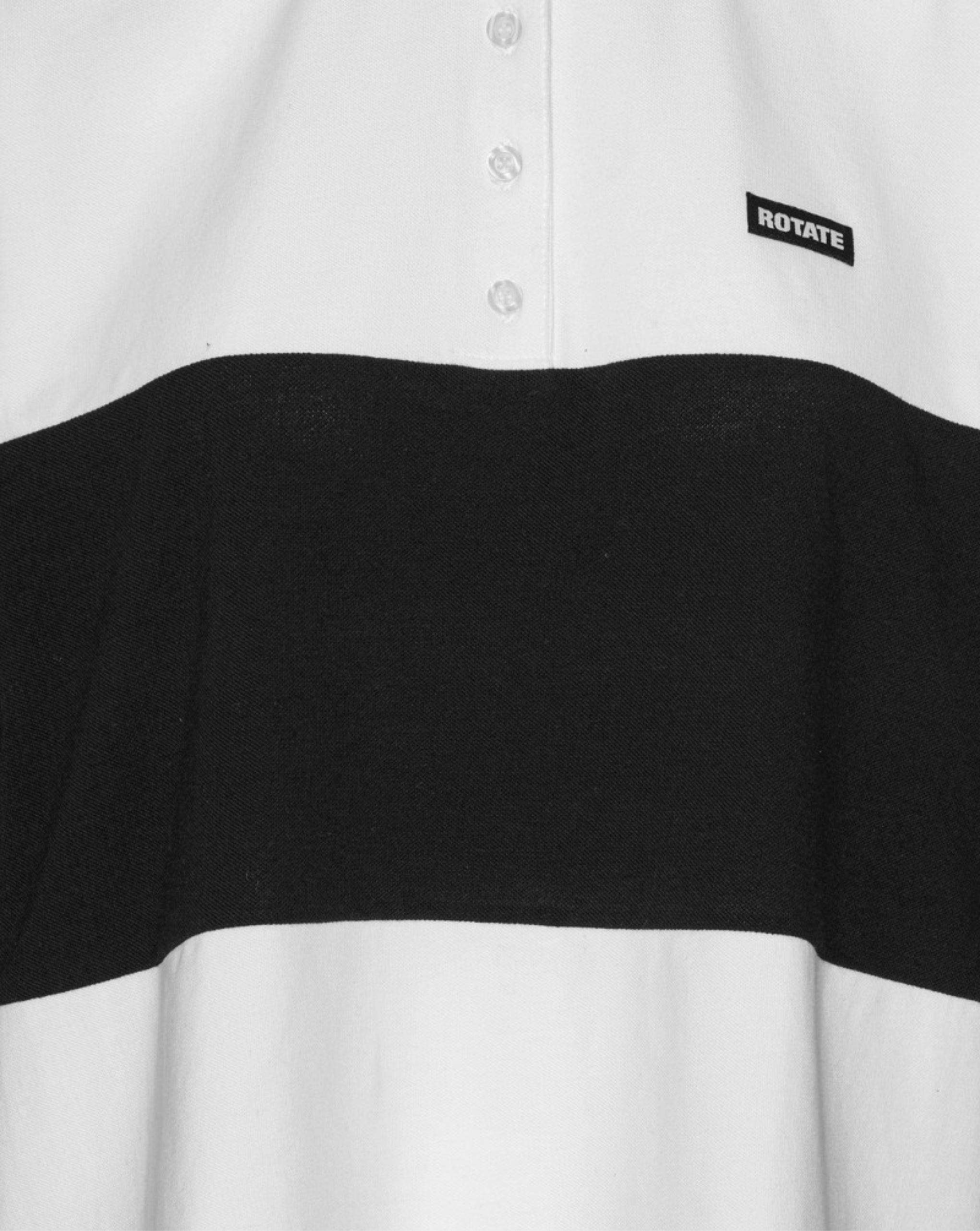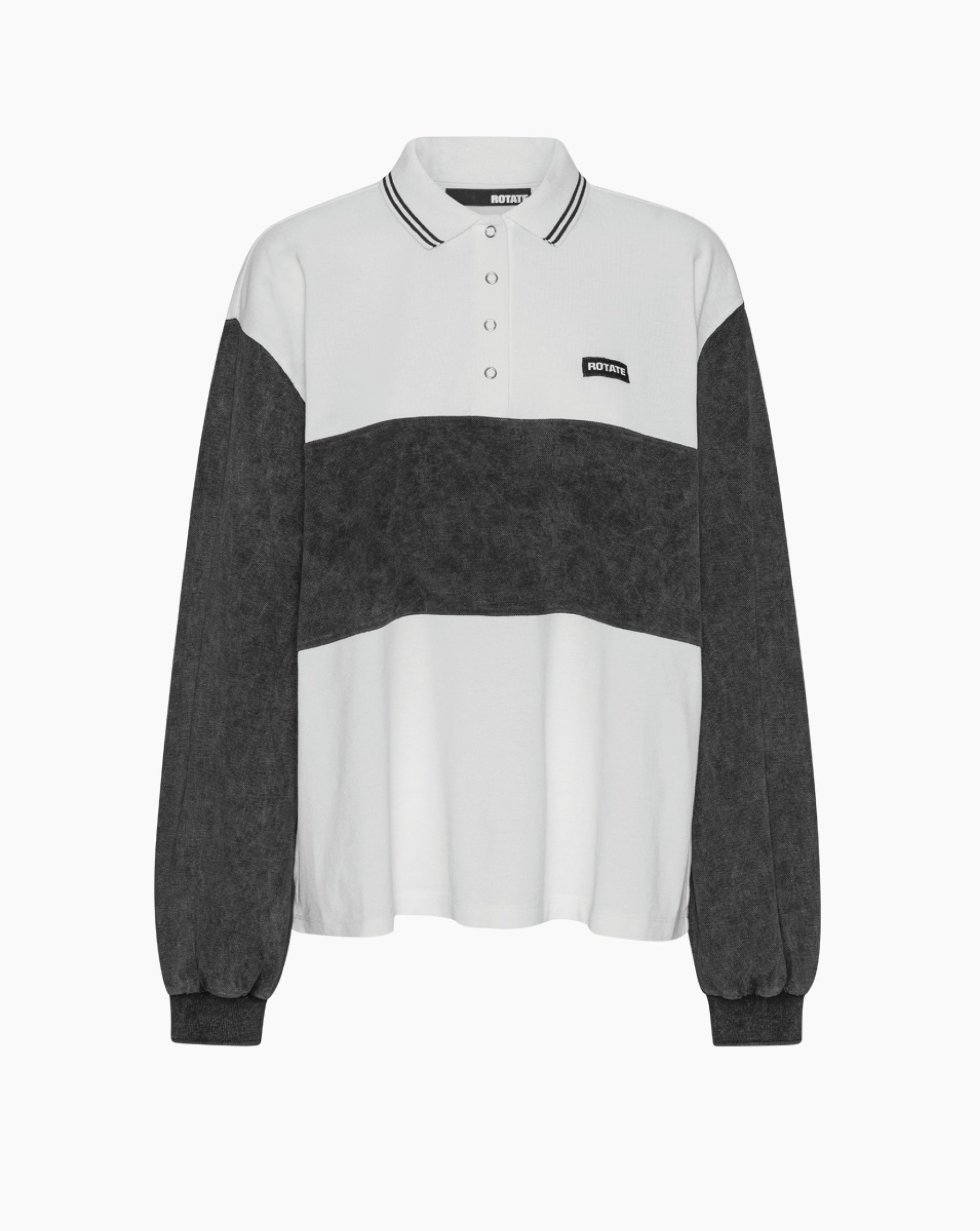 Rotate long sleeve polo with contrast panel in a washed effect. Featuring a button placket, striped collar and small logo patch on the chest