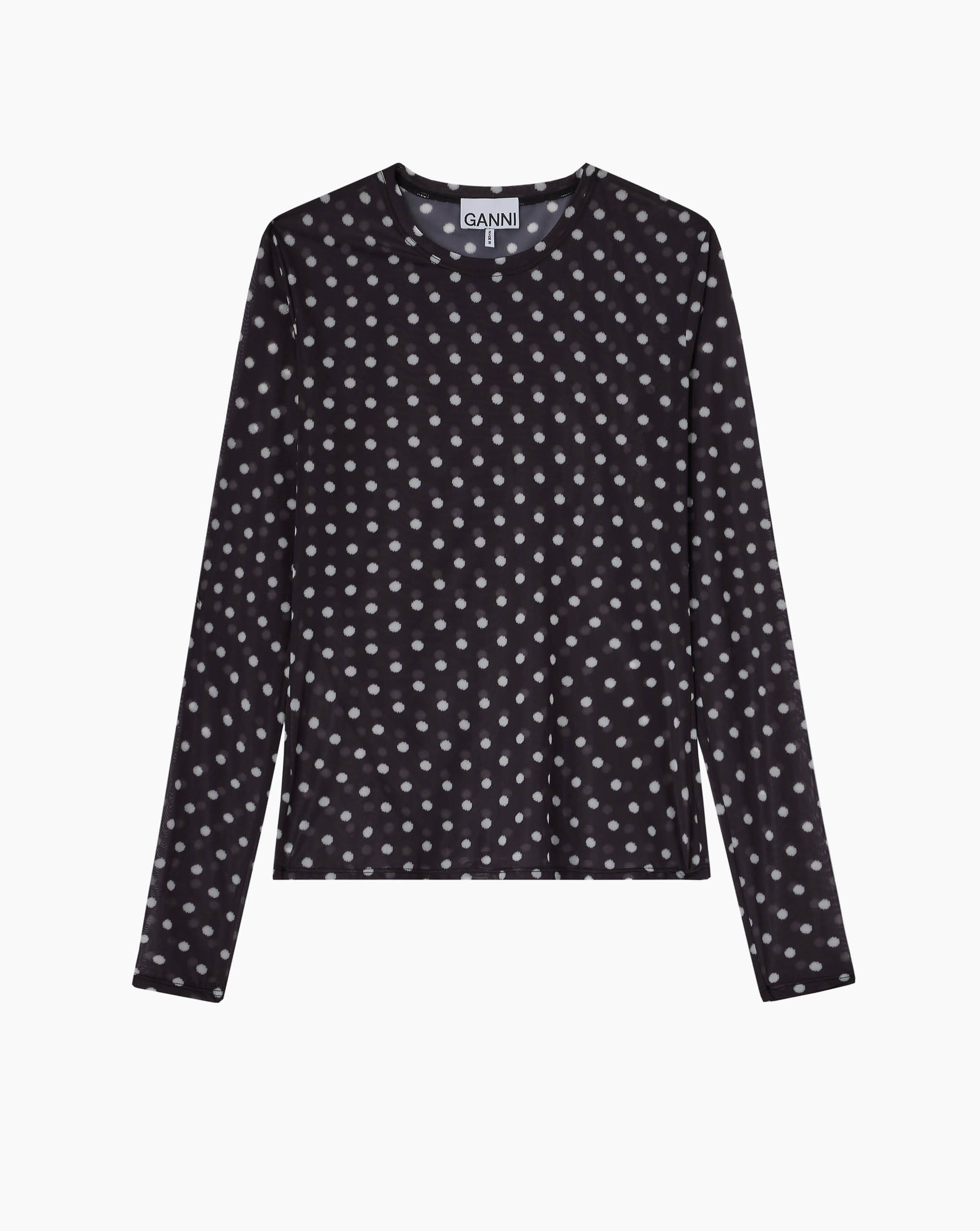 Ganni printed sheer top featuring a round neckline and long sleeves