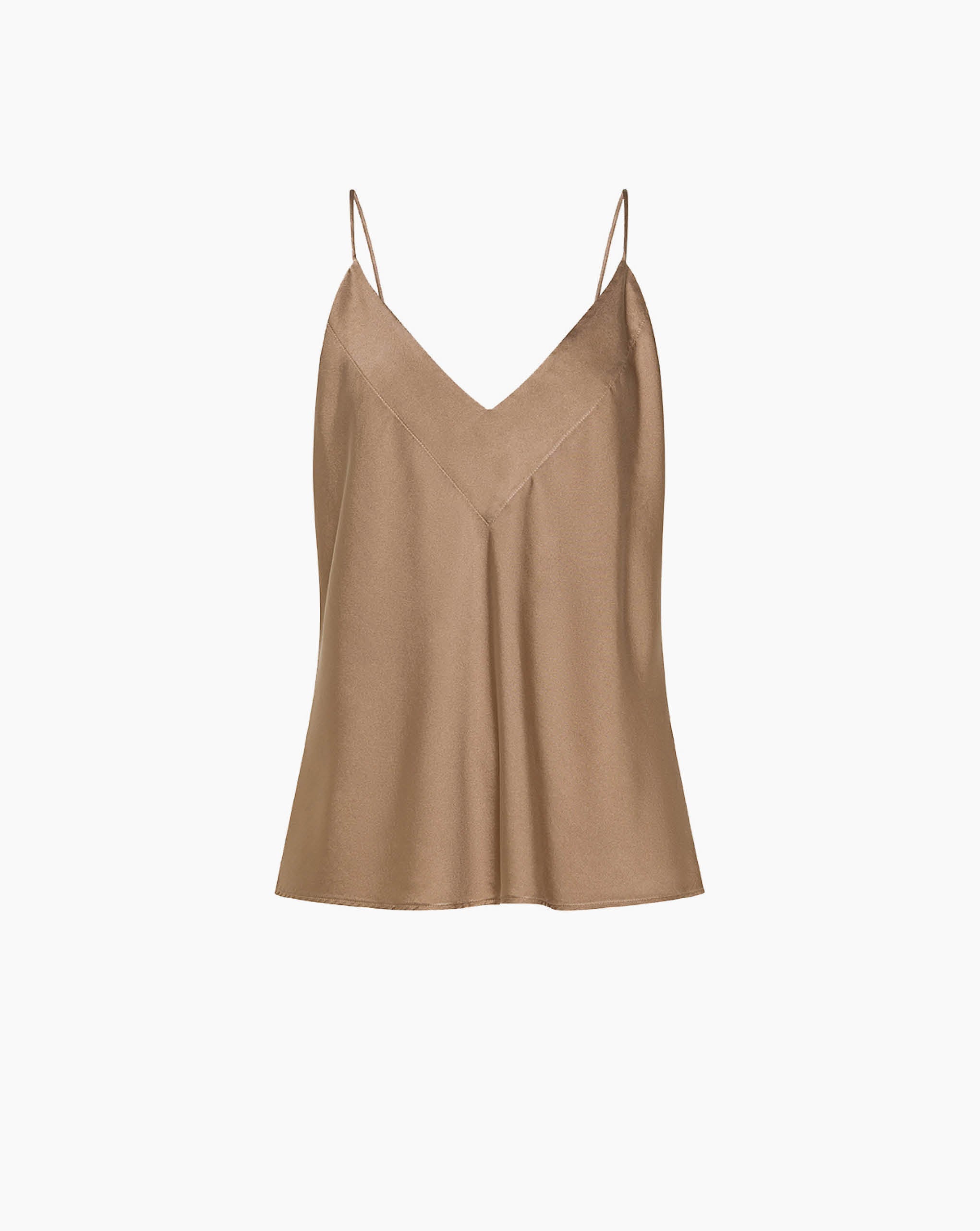 Forte Forte silk–satin top with a sleek feminine cut, slender spaghetti straps and a generous v–neckline. It features a central cut for a soft flare and includes a folded hem with top–stitched detailing to accentuate the fabric drape