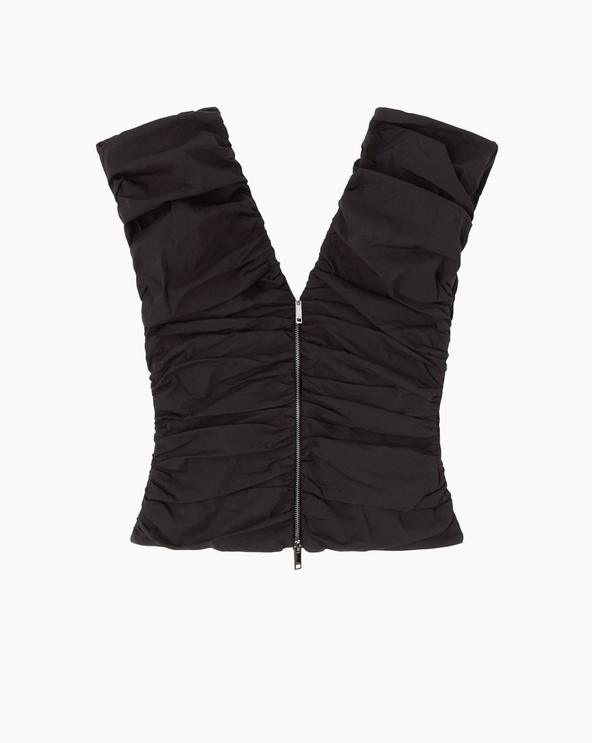 Ganni ruched top featuring a v-neckline, two-way zip closure and ruching along the bodice