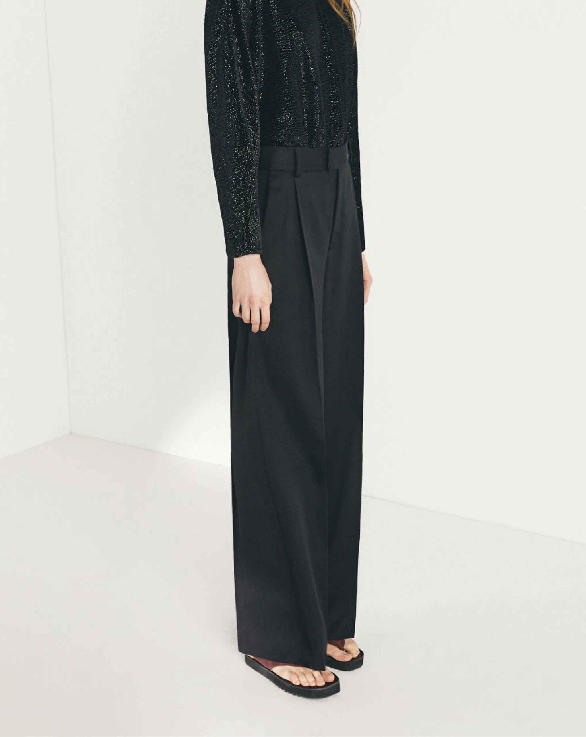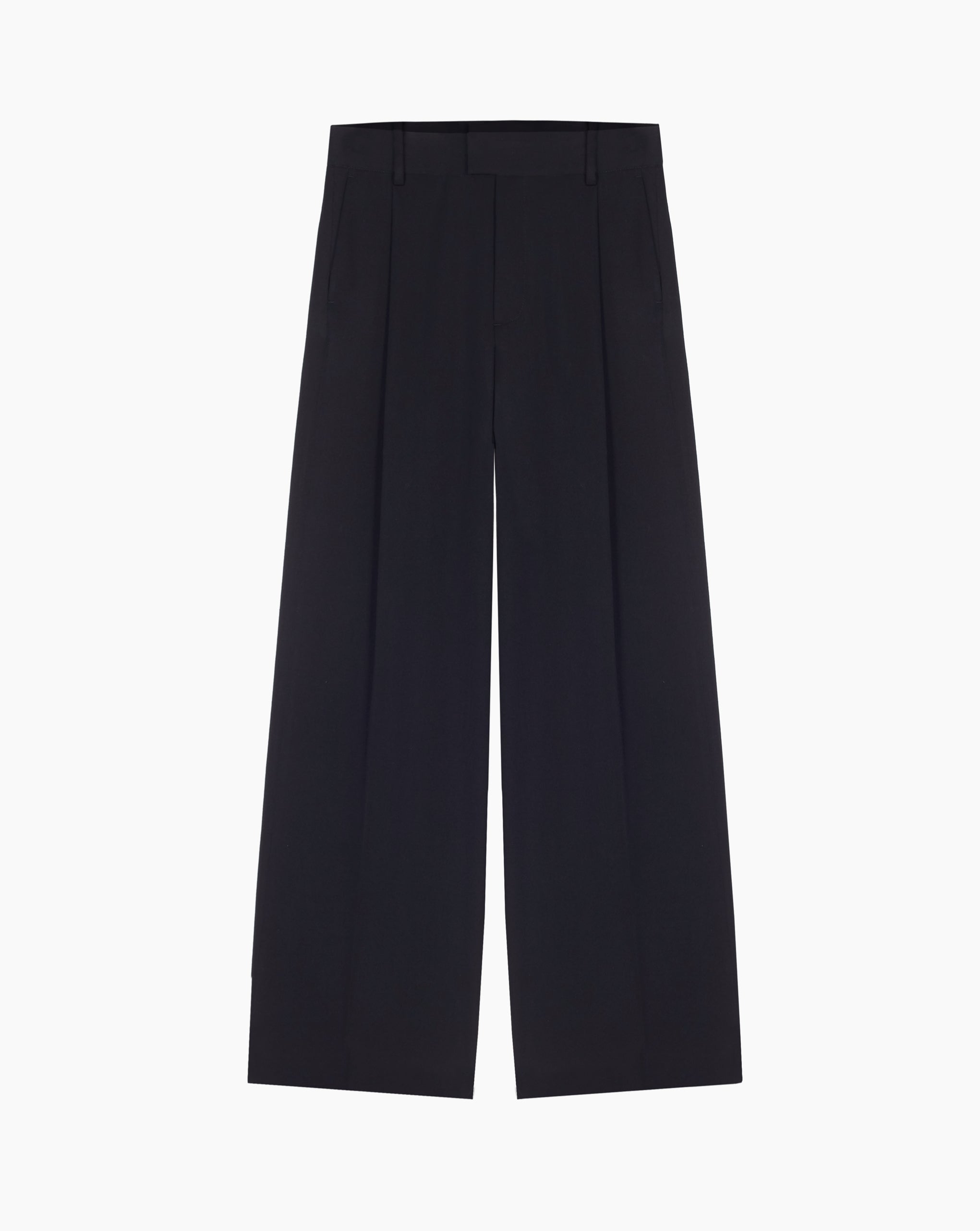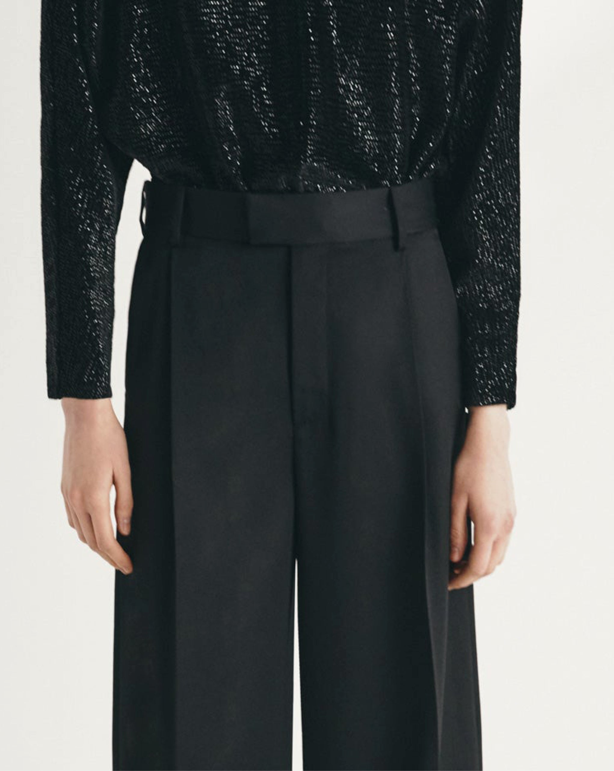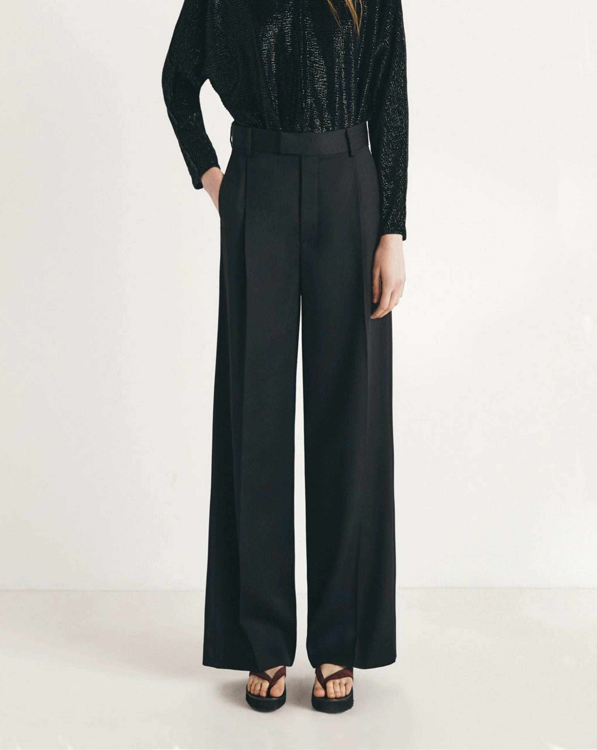 Masscob trousers crafted from soft, breathable wool with a fluid drape. They feature a classic tailored fit with darts and neatly pressed creases at the front. The high-waisted design includes belt loops and a discreet zip fly closure, complemented by diagonal pockets. They offer a full-length silhouette for a polished look