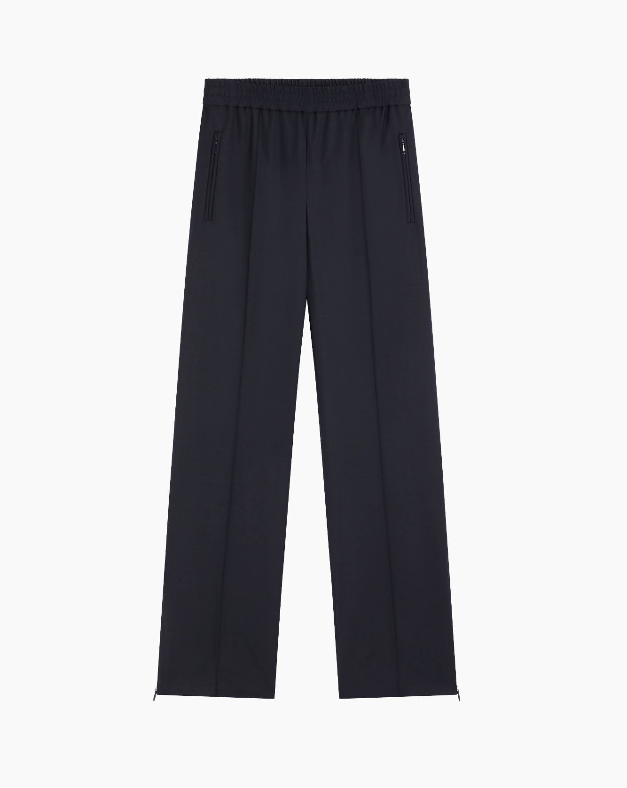 Roseanna high-waisted pants with a straight, flowing cut, elastic waistband with drawstring, slanted side pockets, and slits at the bottom of the legs 100% Wool Color — Navy True to size