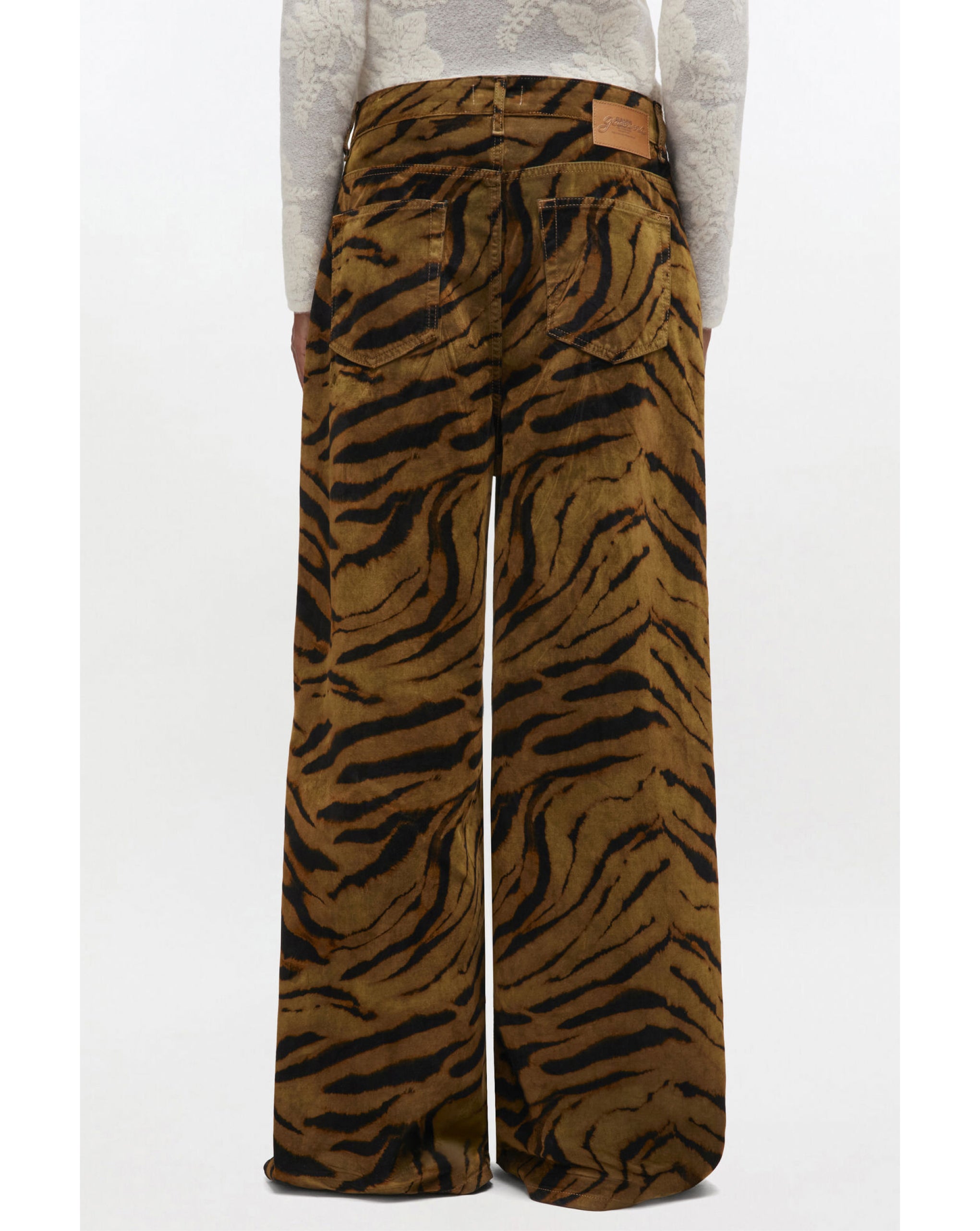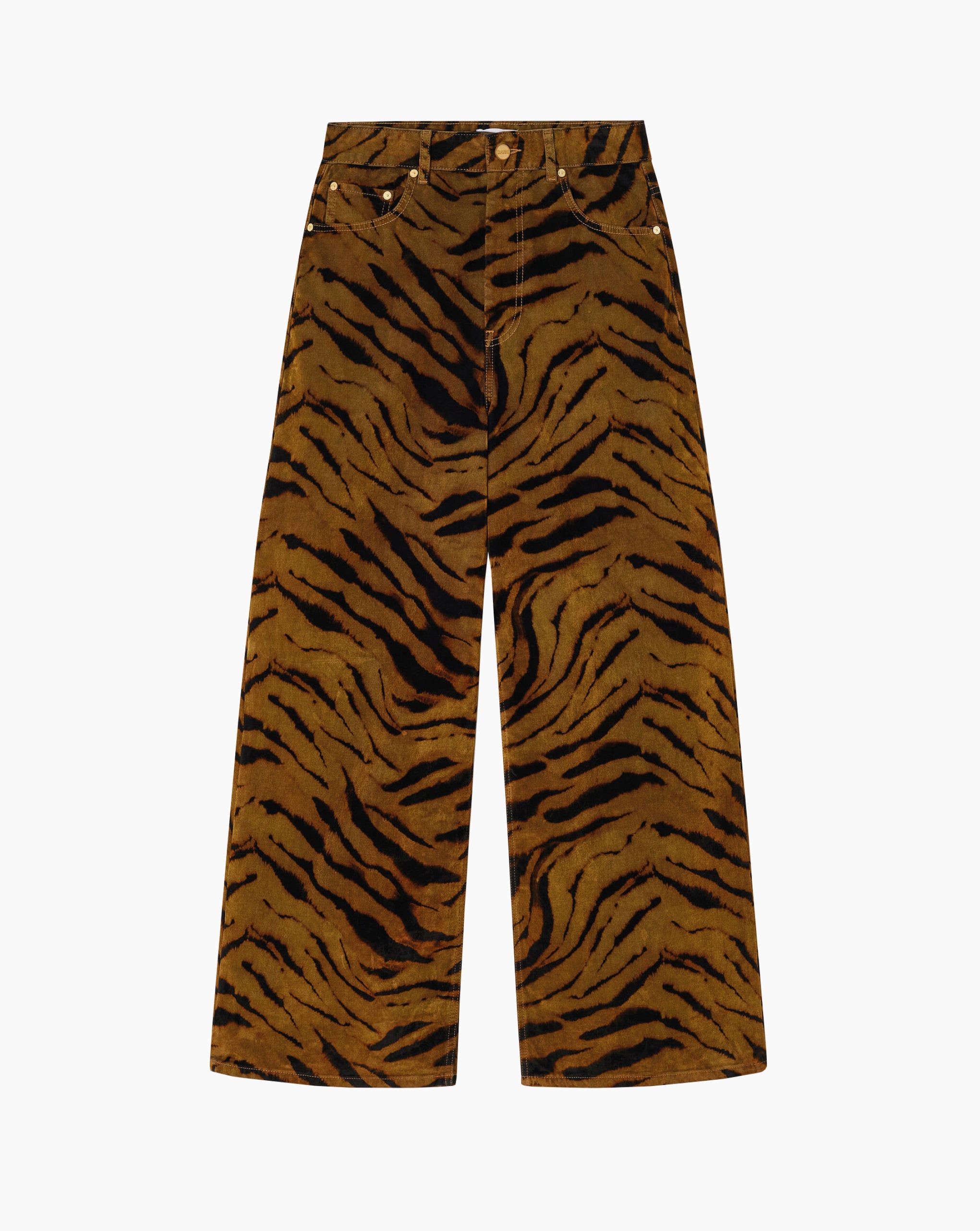 Ganni tiger print baggy trousers featuring a button and zip closure, belt loops for added fit options, and five practical pockets. Finished with the GANNI logo patch on the back pocket