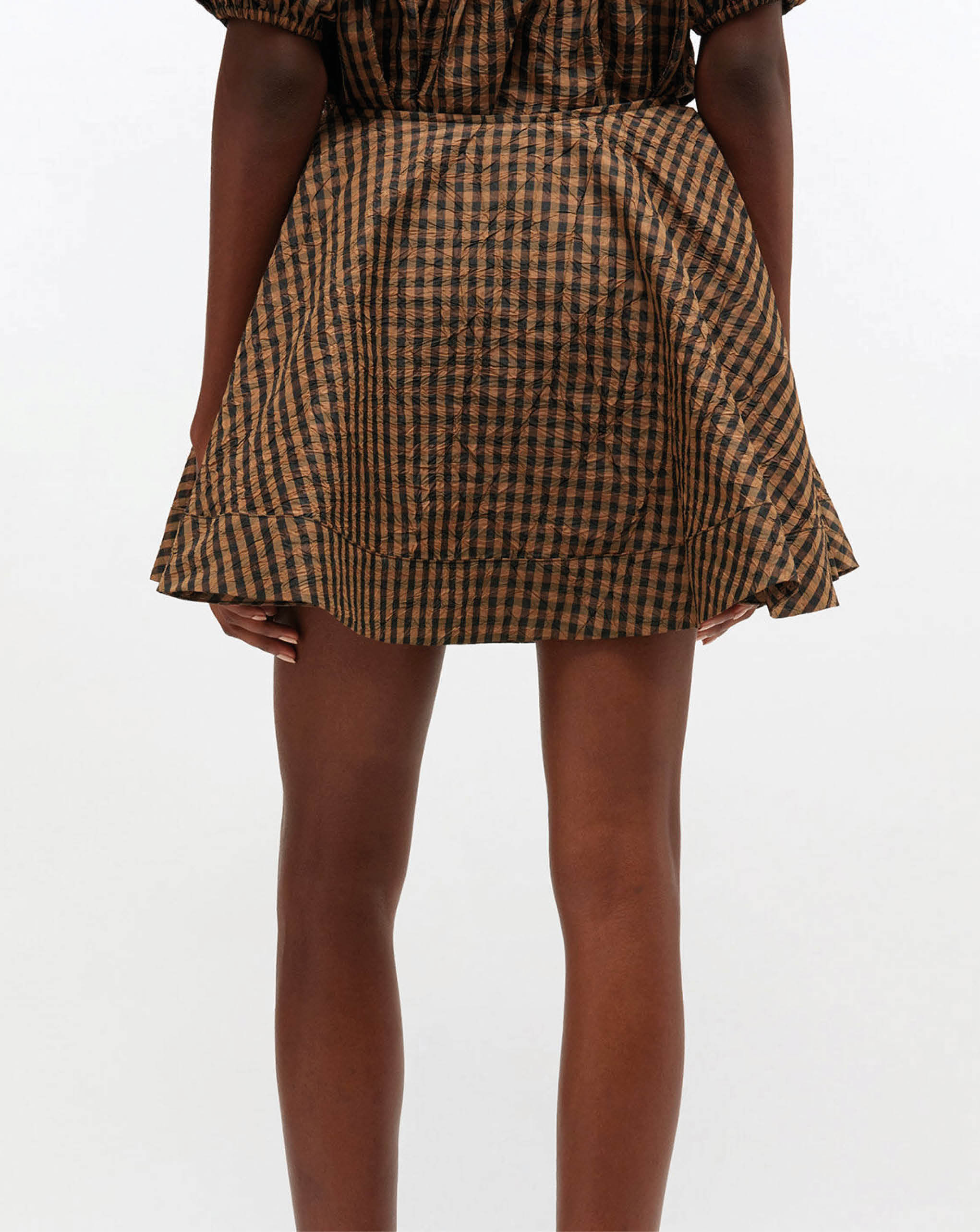 Ganni mini skirt featuring a crinkled technique, zipper closure and a wide hem detail