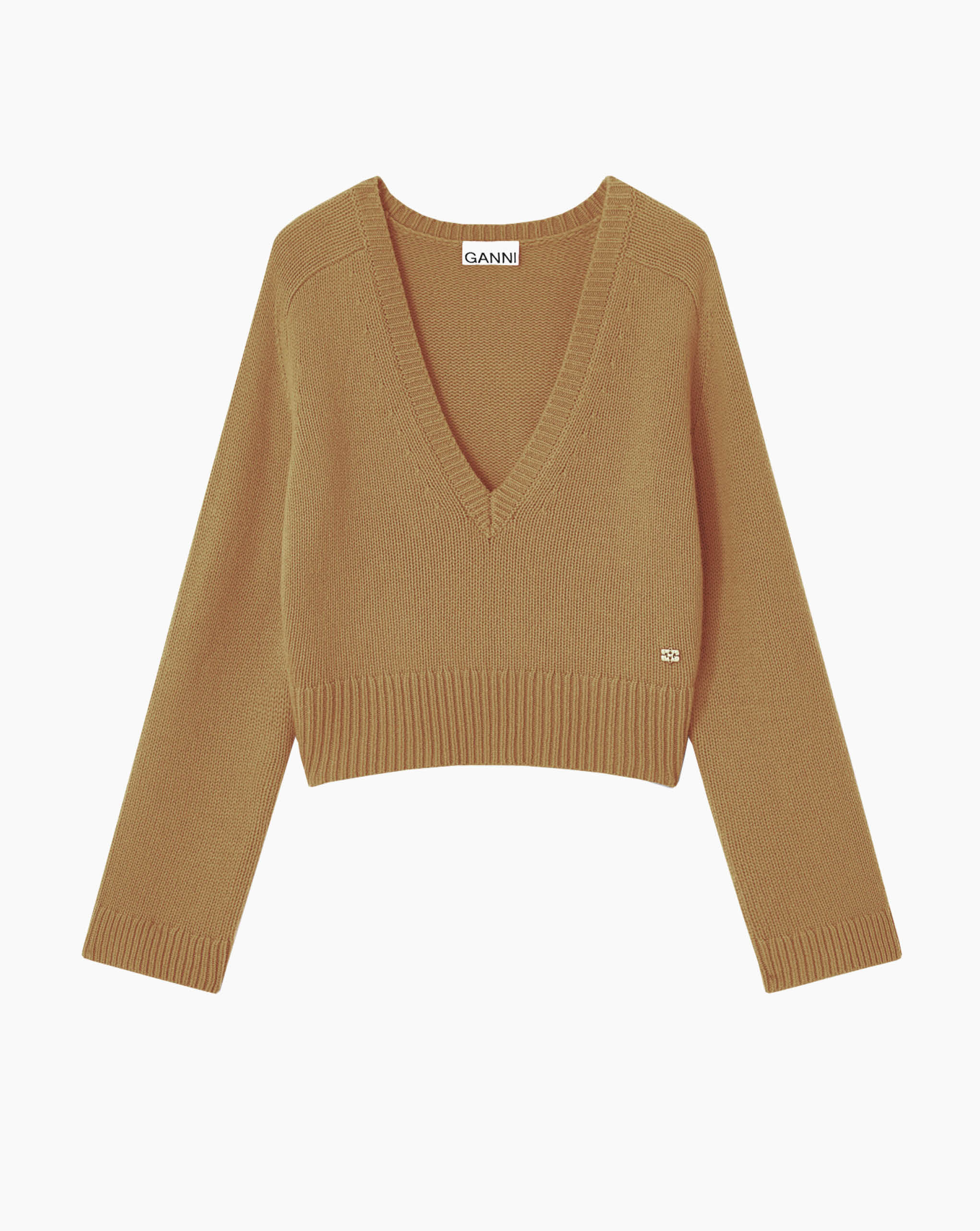 Ganni jumper featuring a deep v-neckline, long sleeves with rib edges and a GANNI Butterfly logo at the side