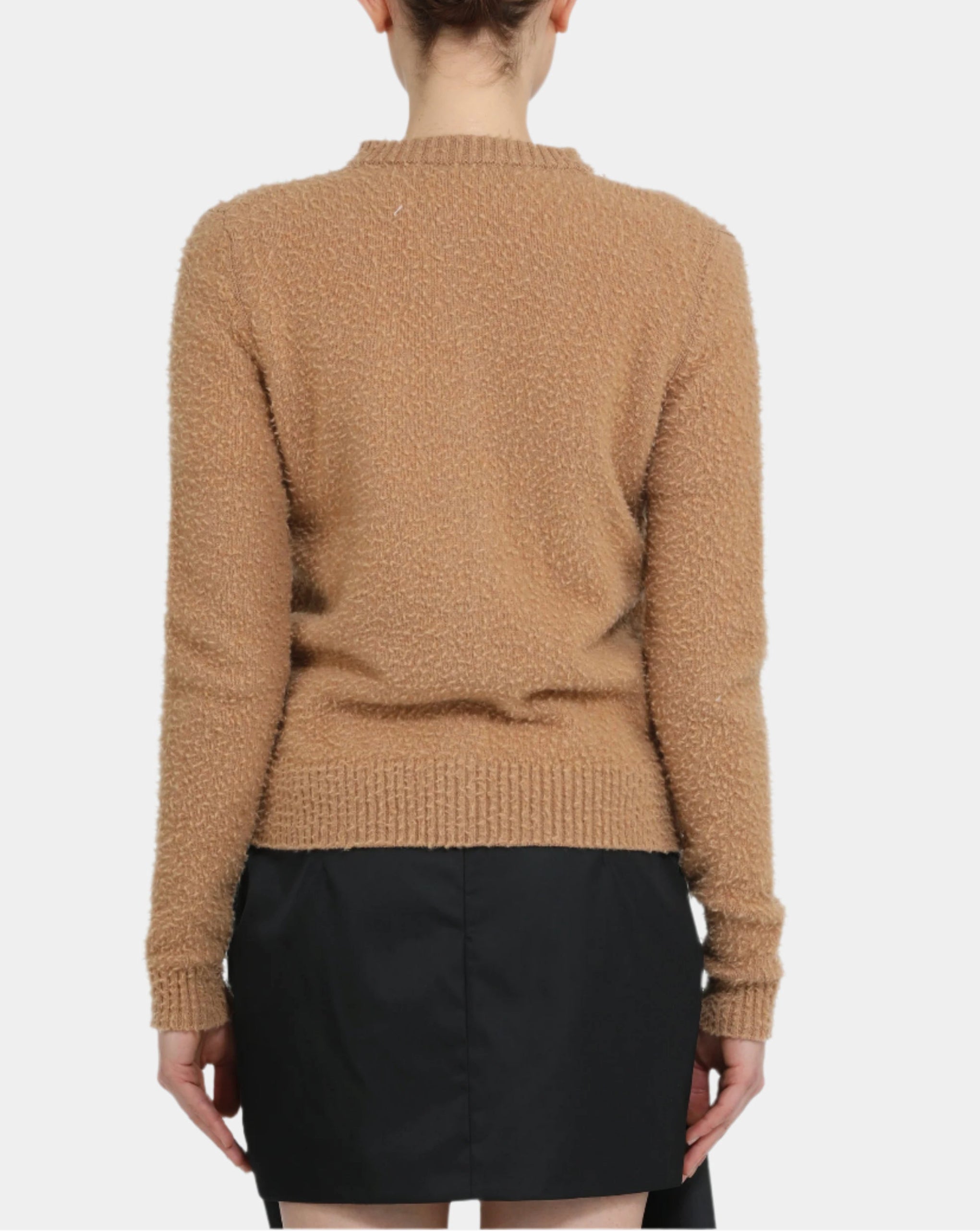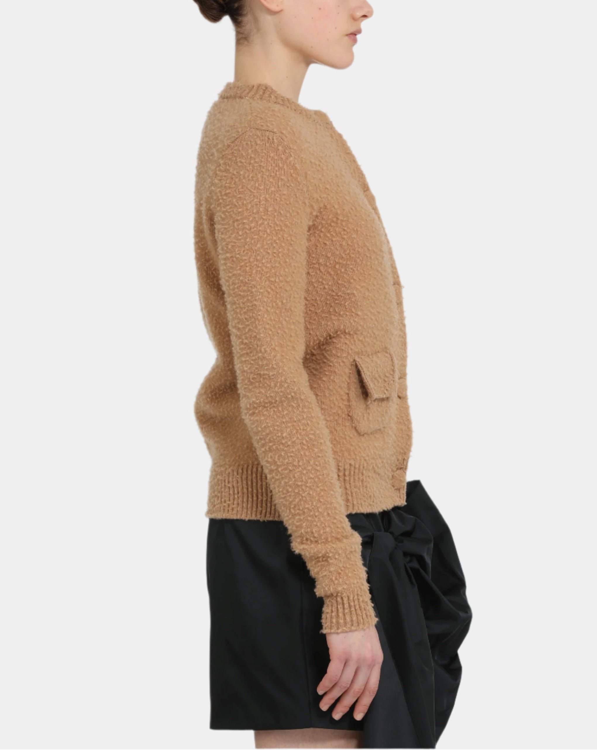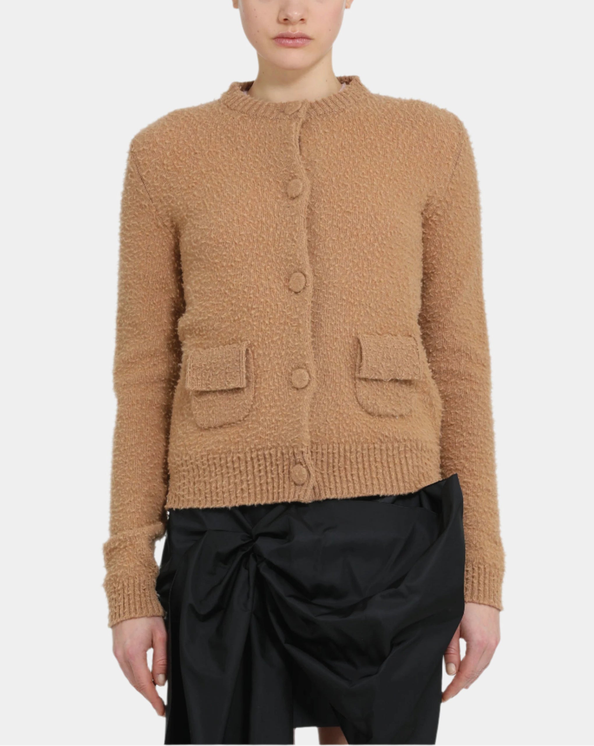 N21 crew-neck cardigan offering a slim silhouette that enhances your shape, made from knit fabric with a delicate bouclé texture. It includes convenient front pockets and closes with covered buttons. The ribbed collar, cuffs, and hem add both comfort and structure to the overall design.