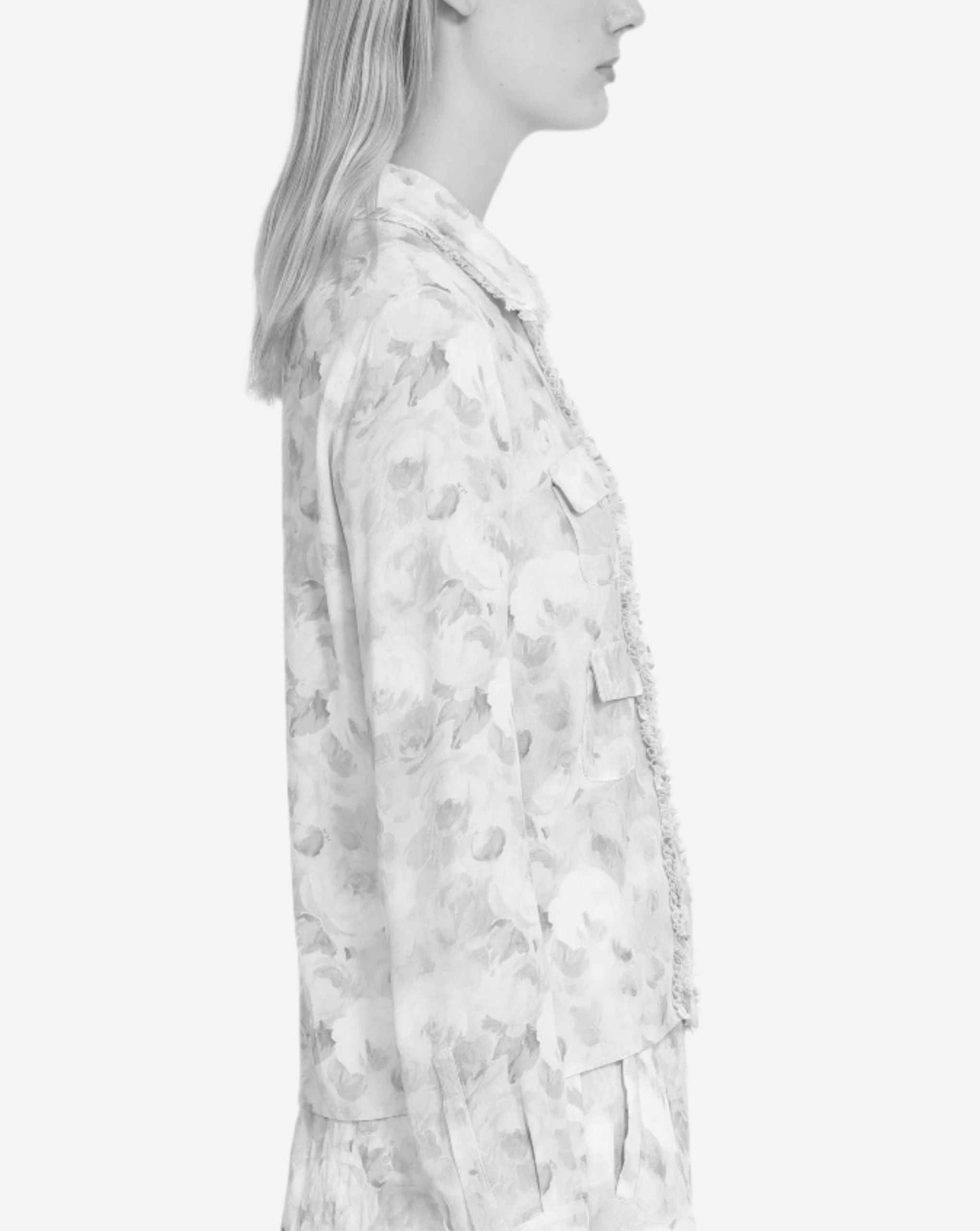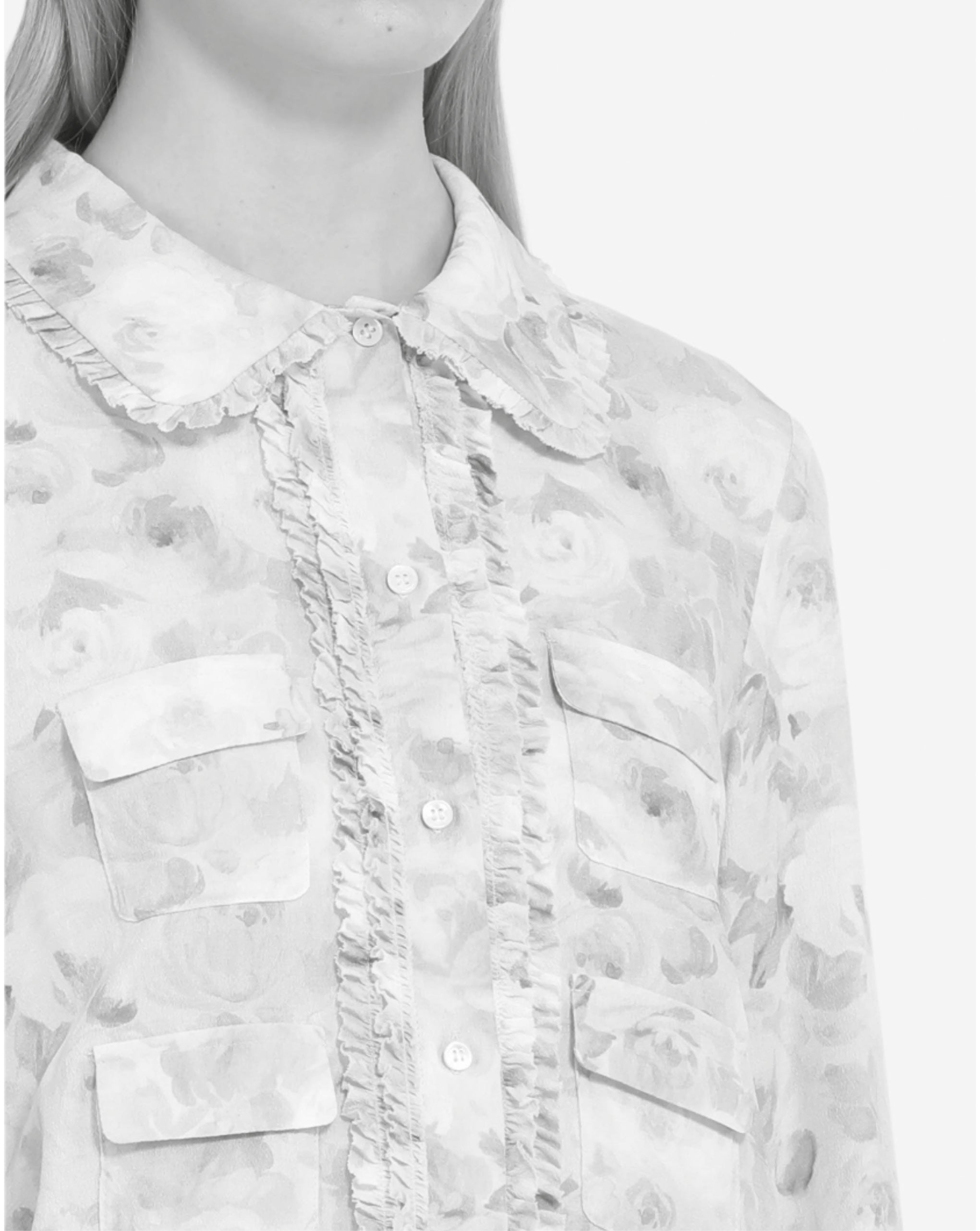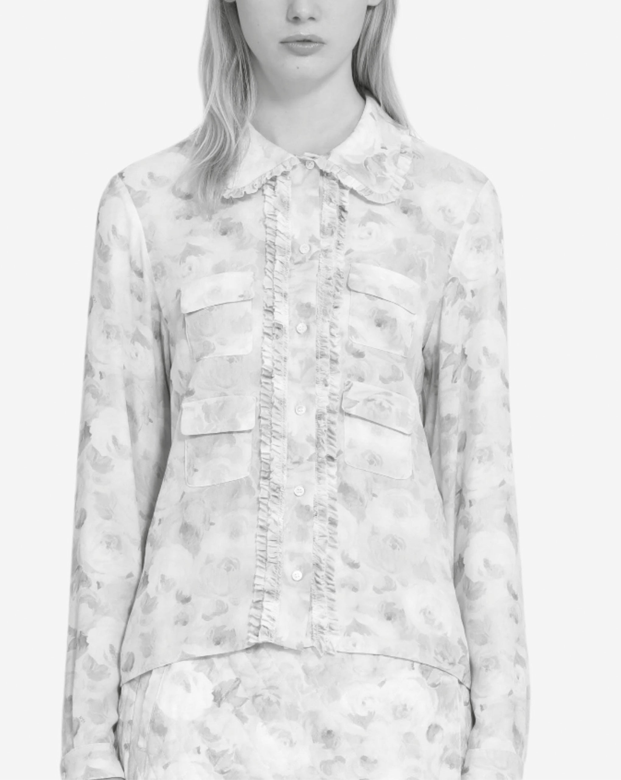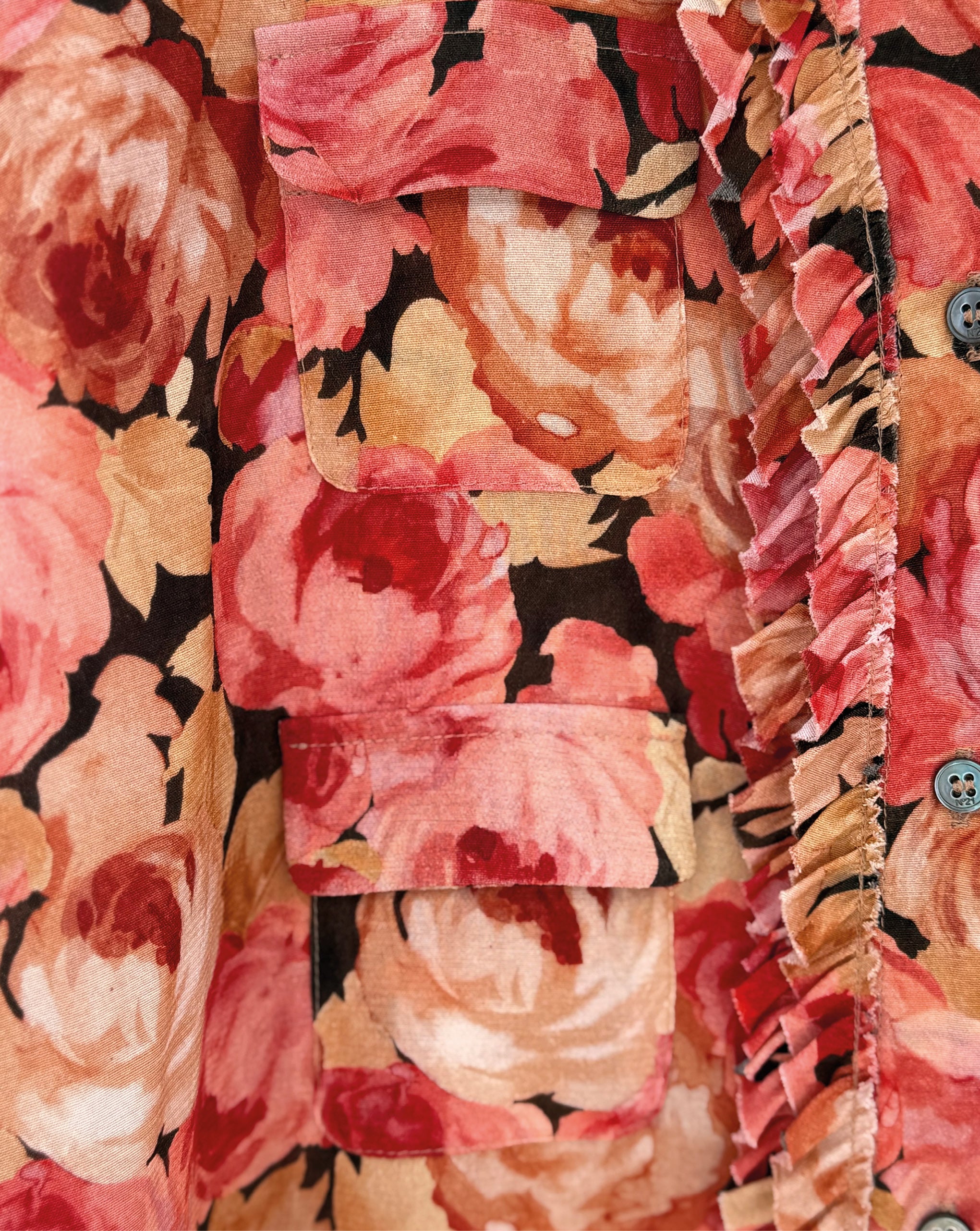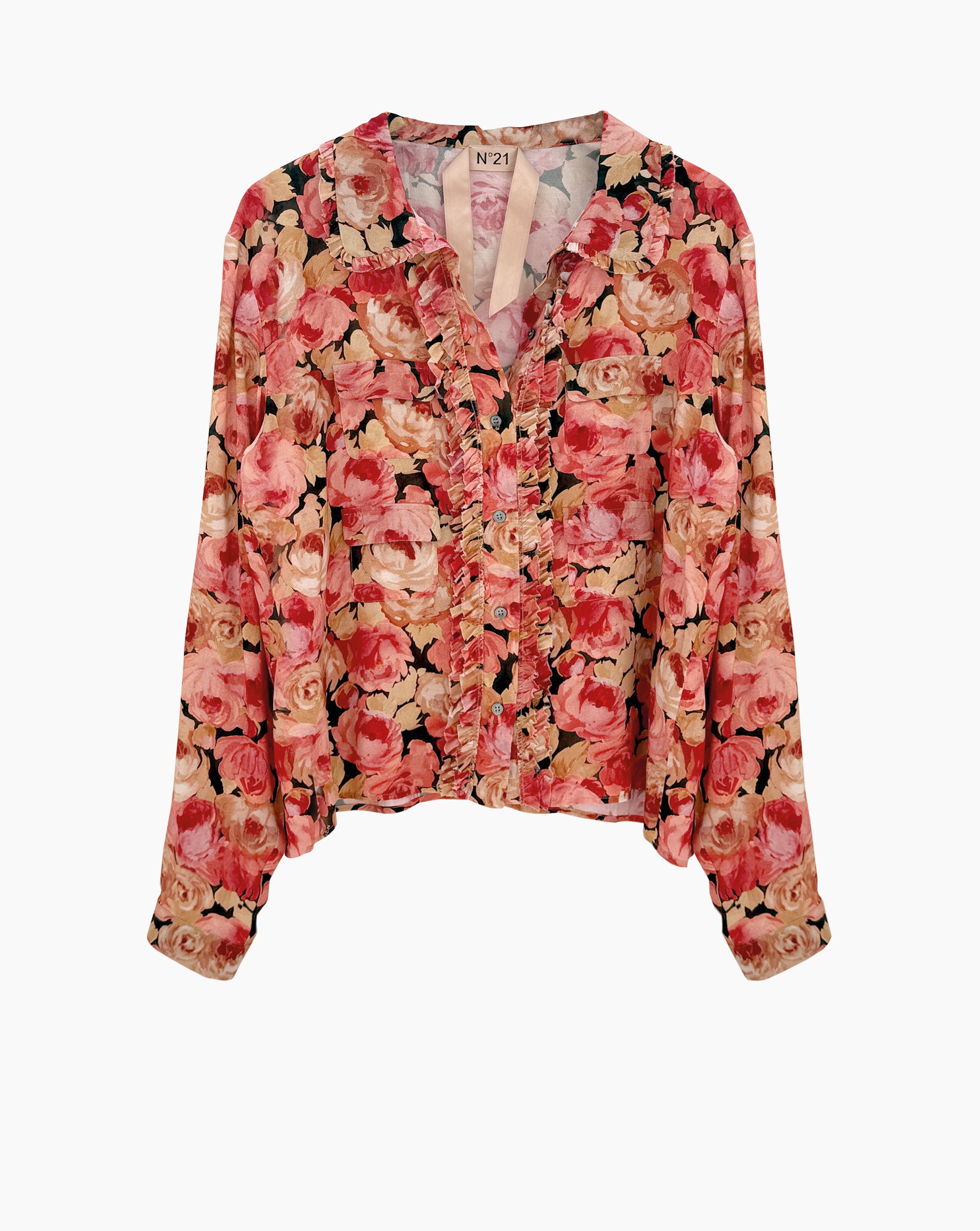 N21 regular fit floral shirt with mini ruffles and pockets made of light and soft fabric. It features a floral pattern in shades of pink and black, a classic collar and a front button closure.