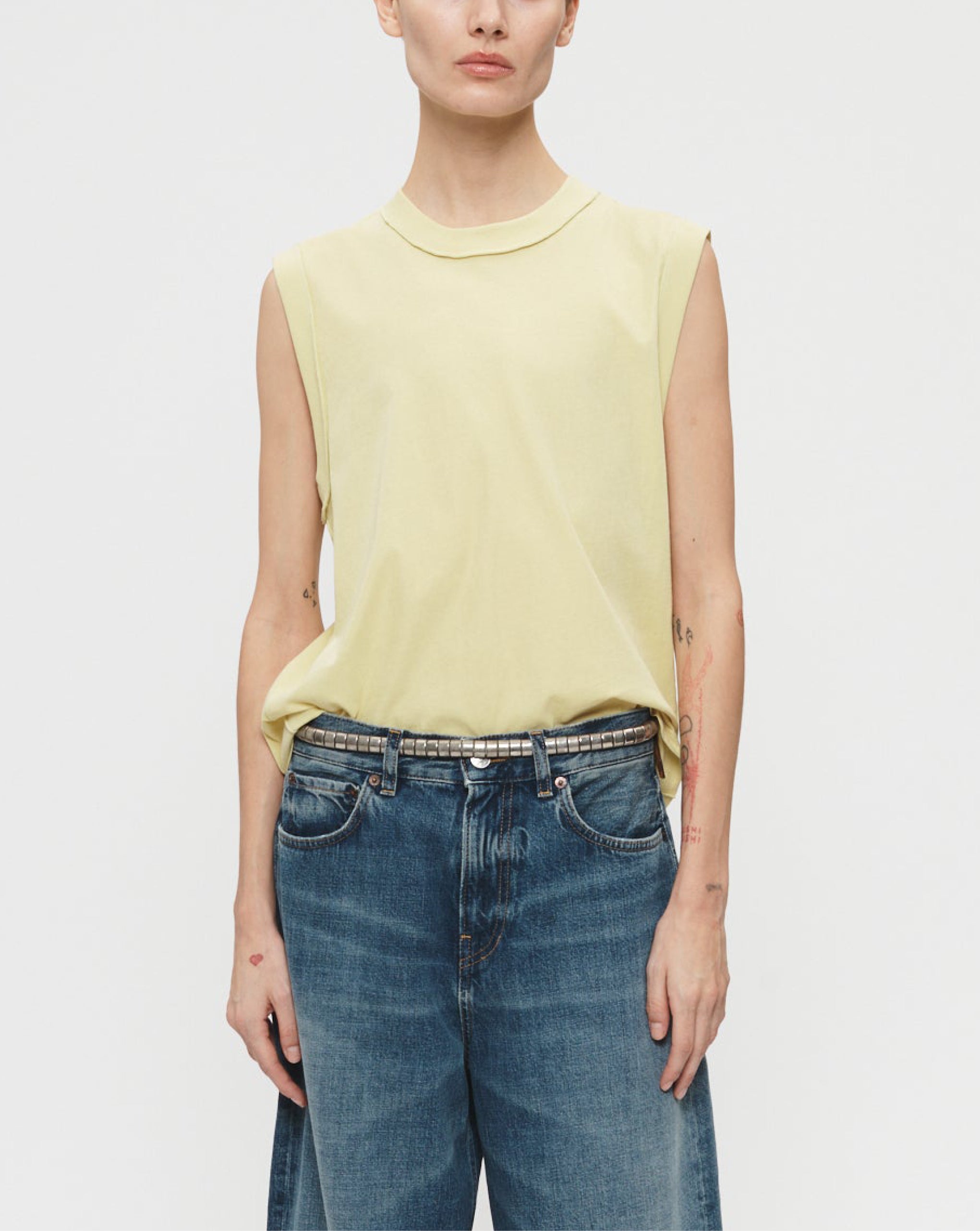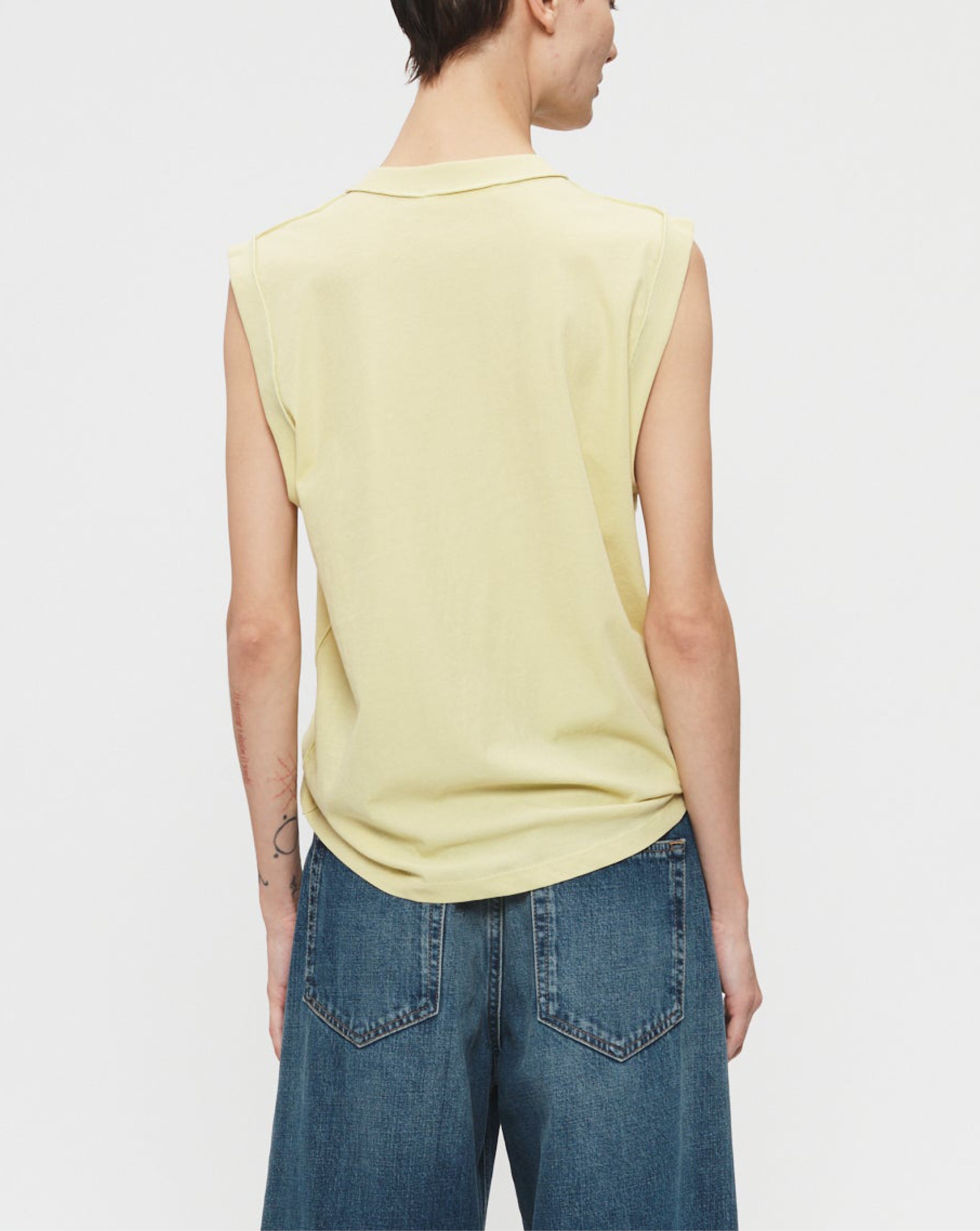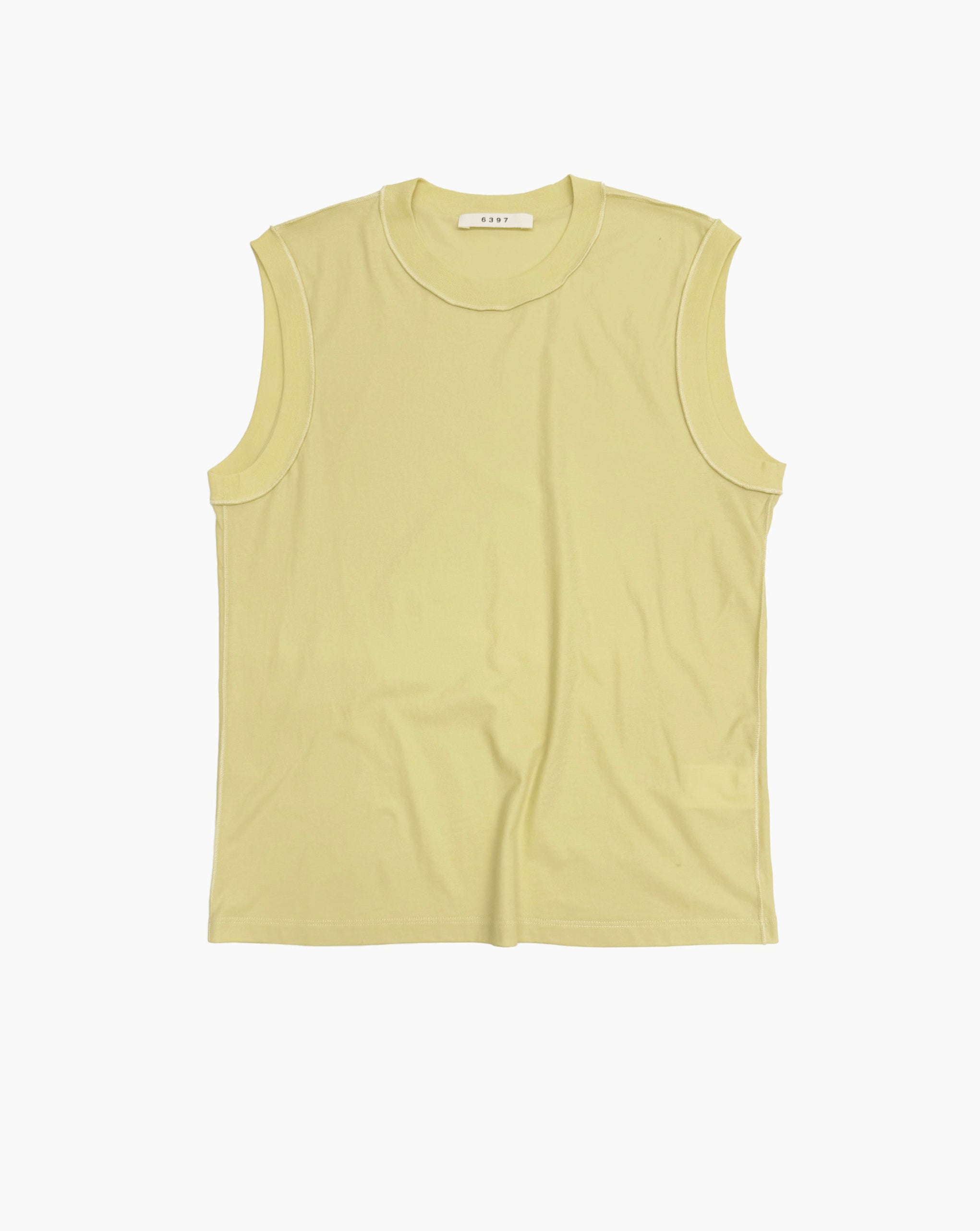 6397 sleeveless relaxed fit top made in a lightweight cotton jersey, with an exposed seam detail at the neck and side seams