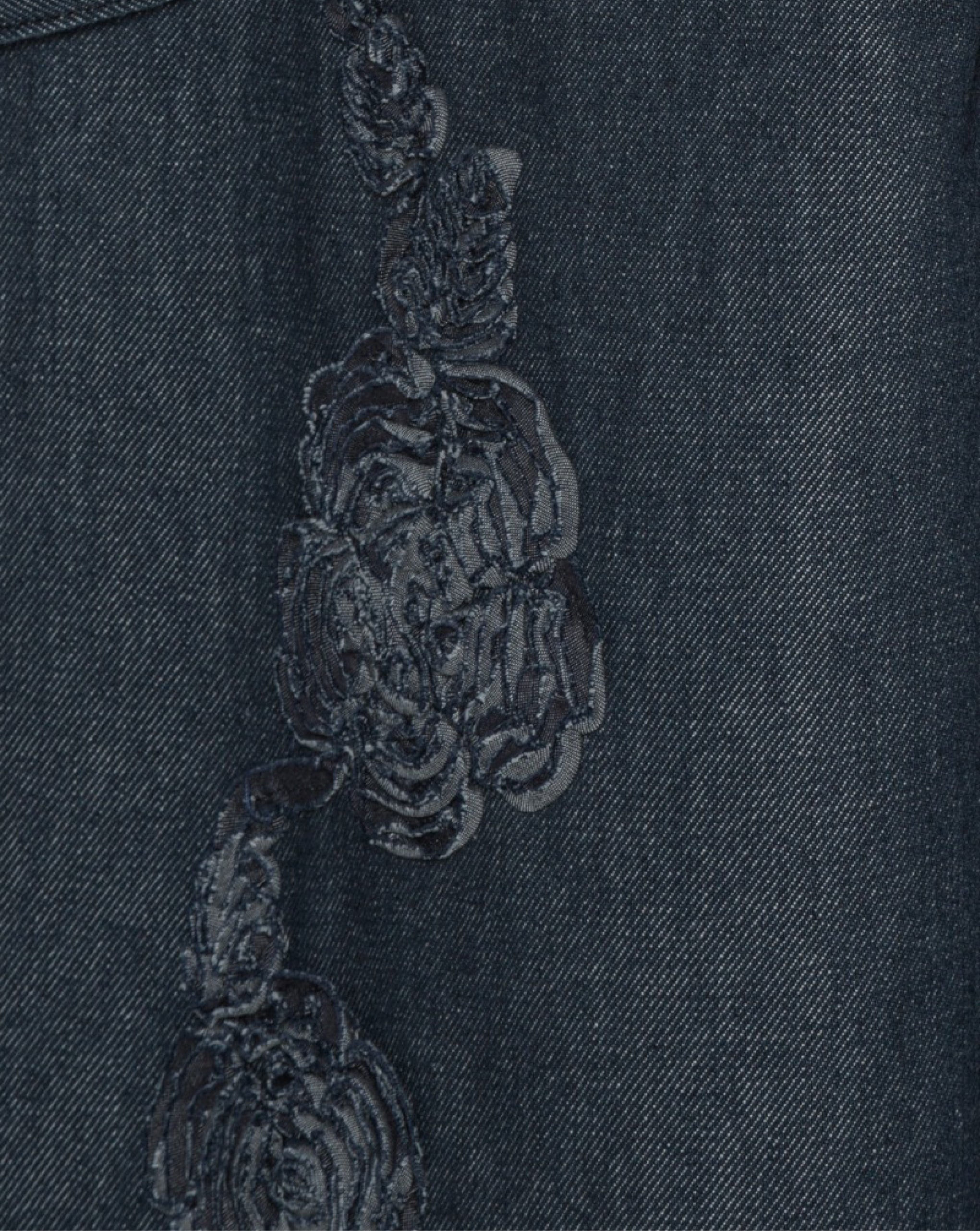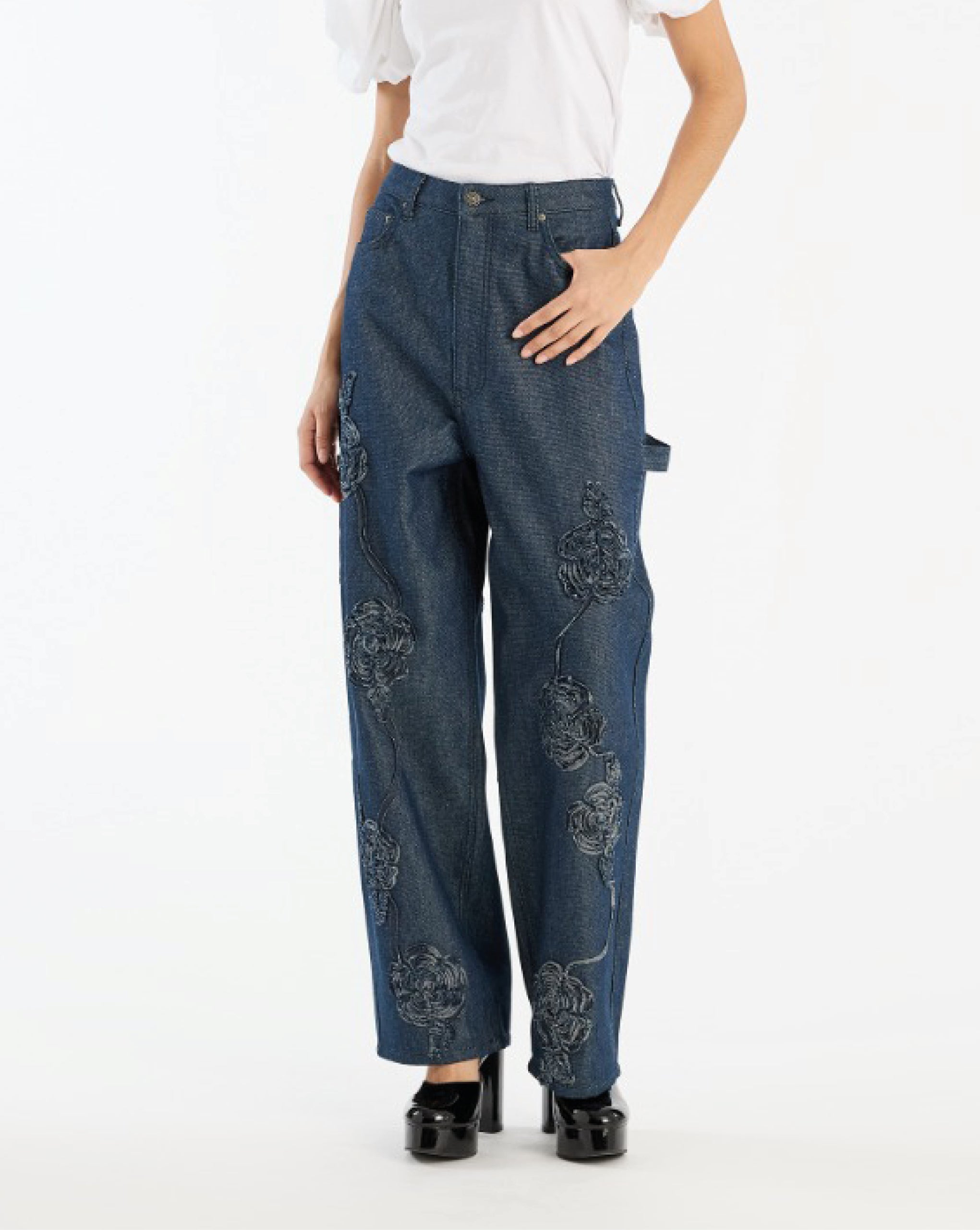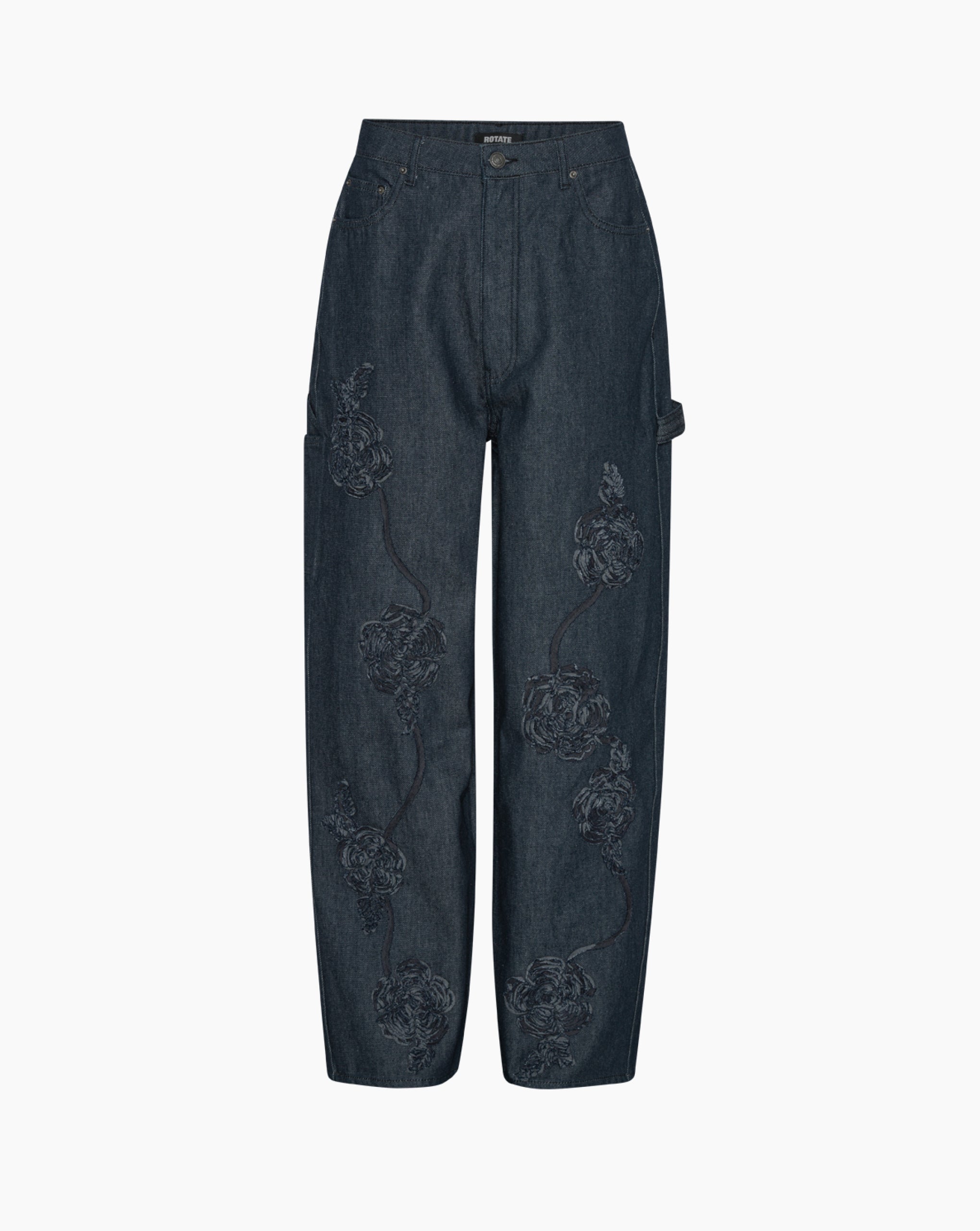 Rotate denim boyfriend jeans designed in a relaxed silhouette with embroidered floral details throughout the legs and a carpenter-inspired strap on one side
