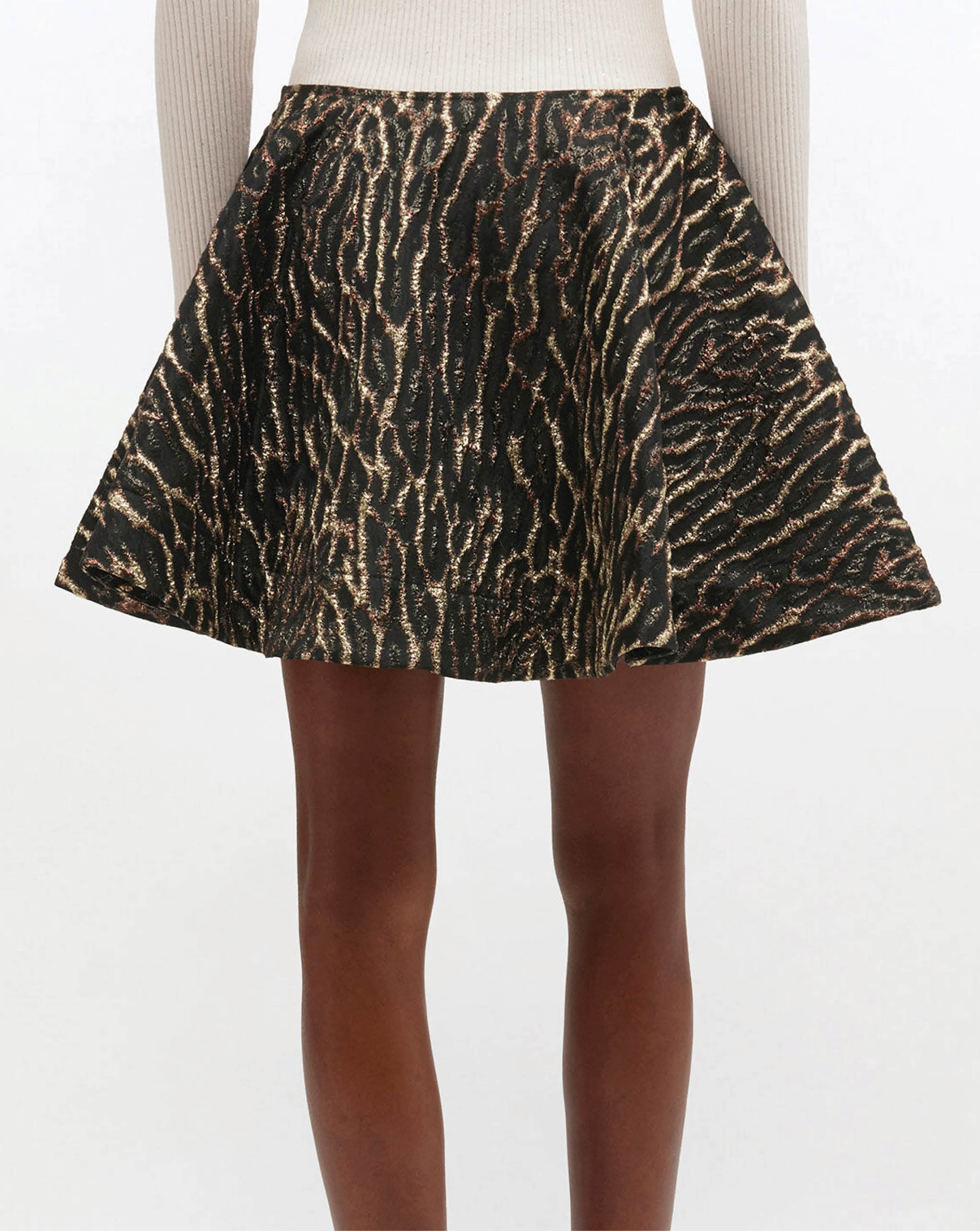 Ganni mini skirt featuring a metallic cloque print and zipper closure