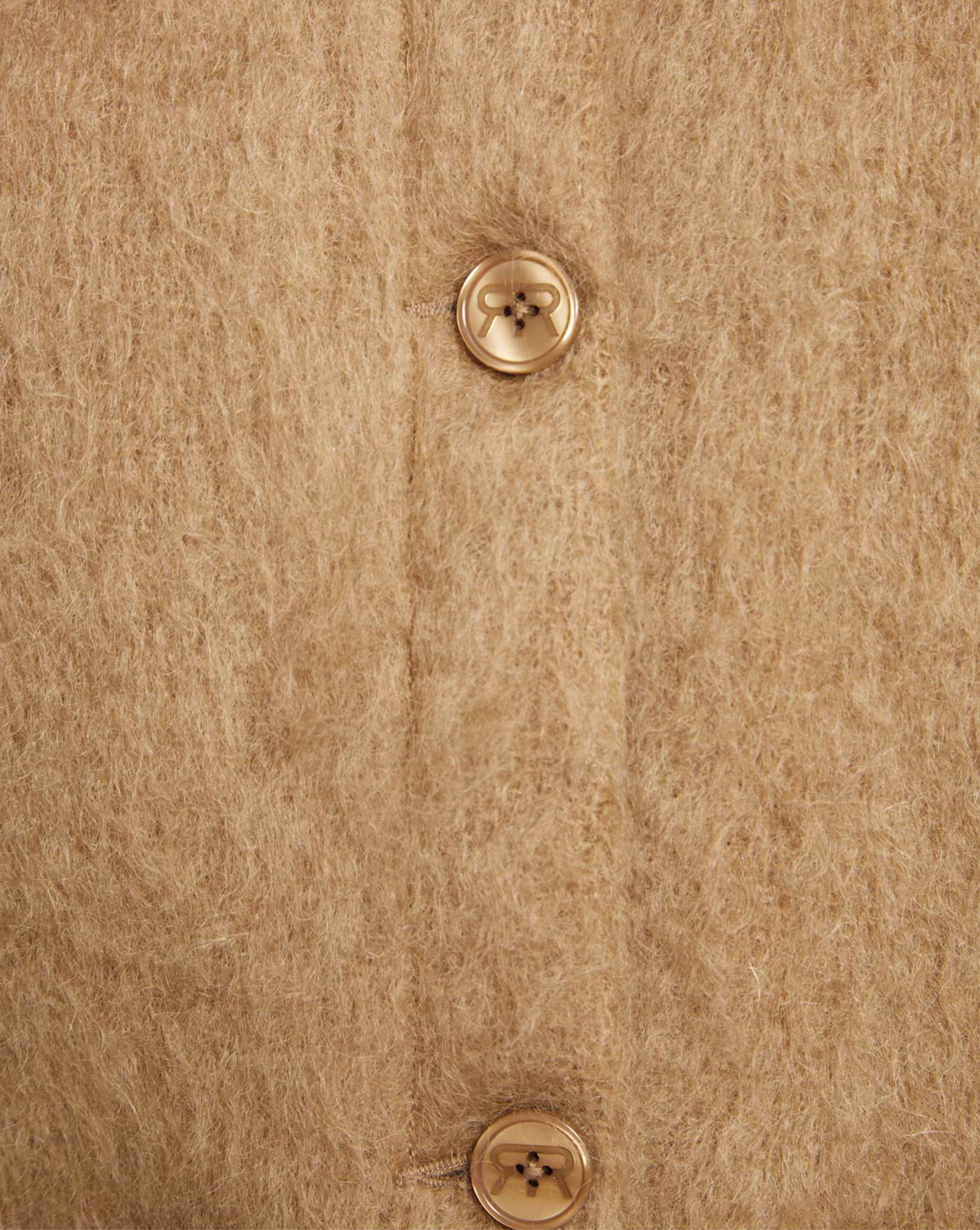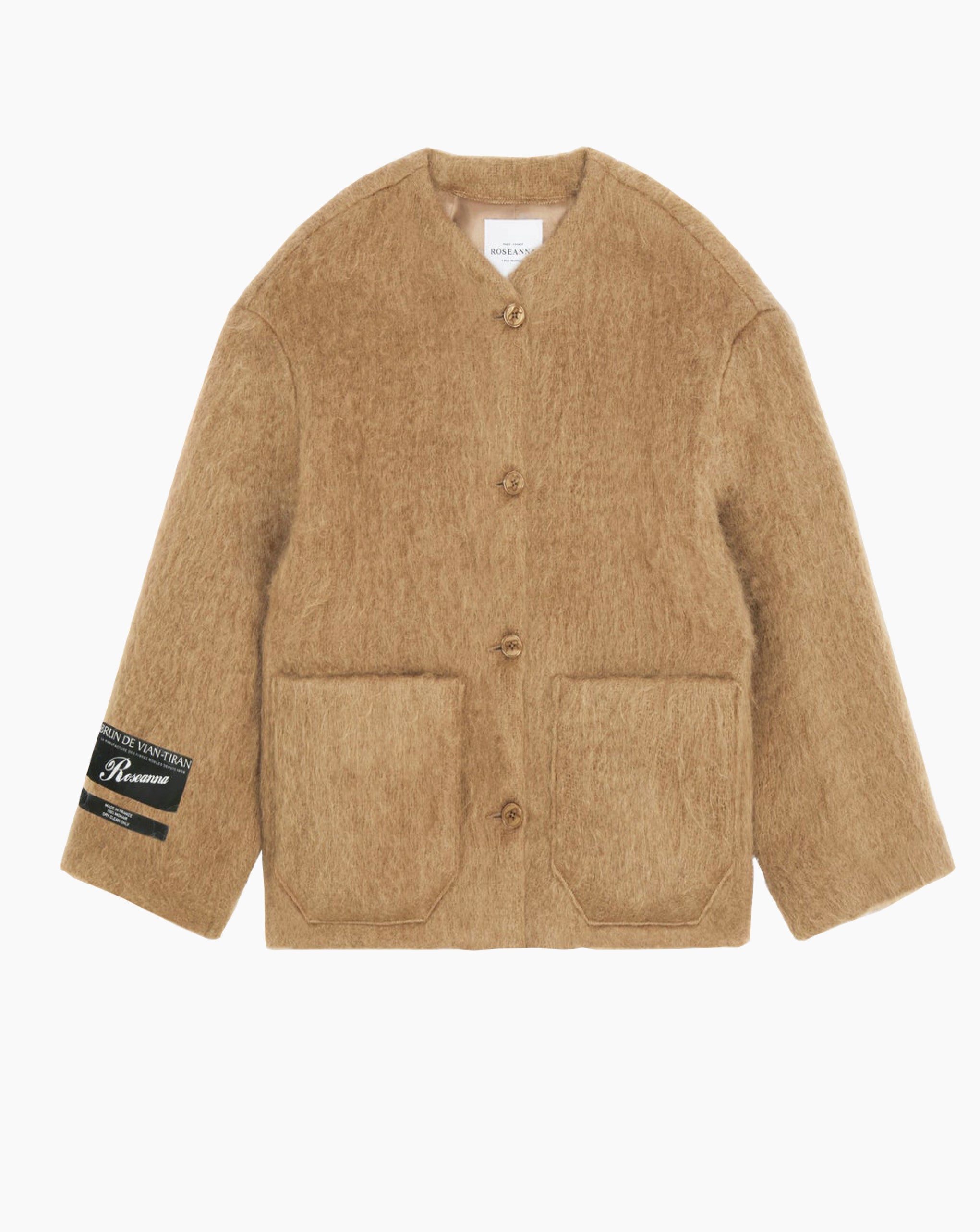 Roseanna loose-cut mohair jacket without collar. It closes with engraved mother-of-pearl buttons and features two patch pockets on the front. The interior is fully lined.