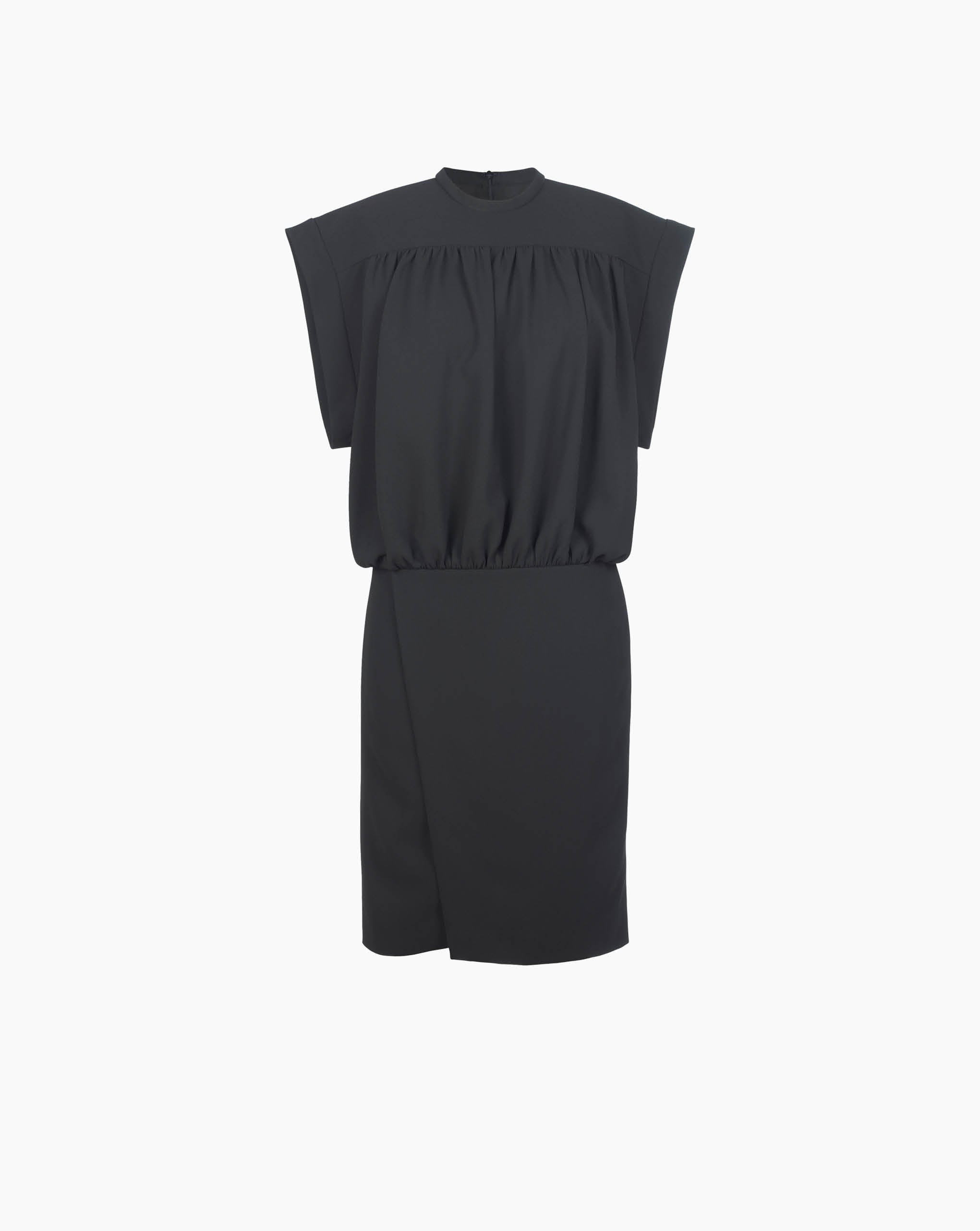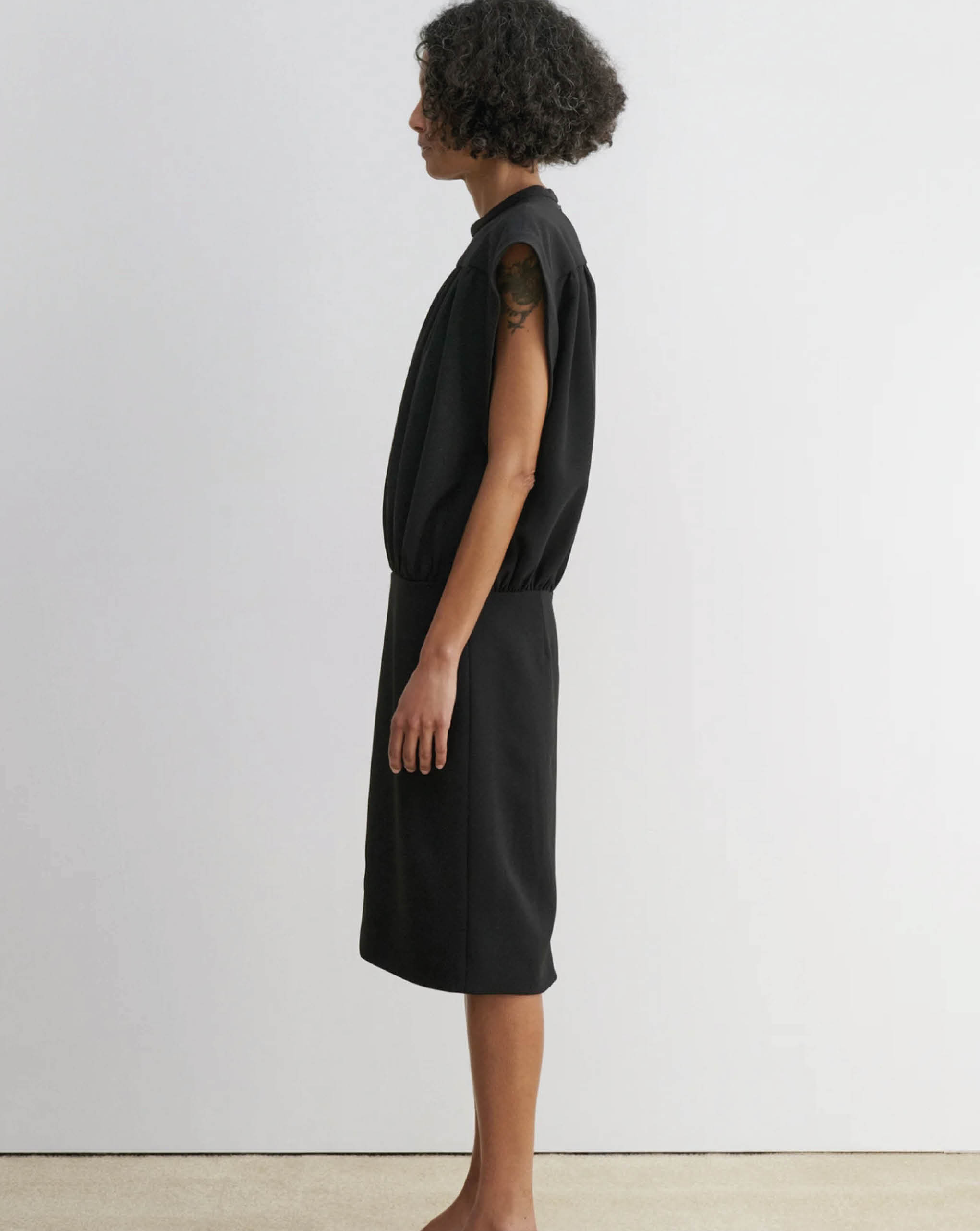 Rachel Comey sleeveless dress cut from durable and sleek Georgette featuring a dropped armholes, pleated bodice, and a diagonal panel on the skirt. Designed with a mid-length cut and relaxed silhouette. Concealed zipper at back of the neck and waist