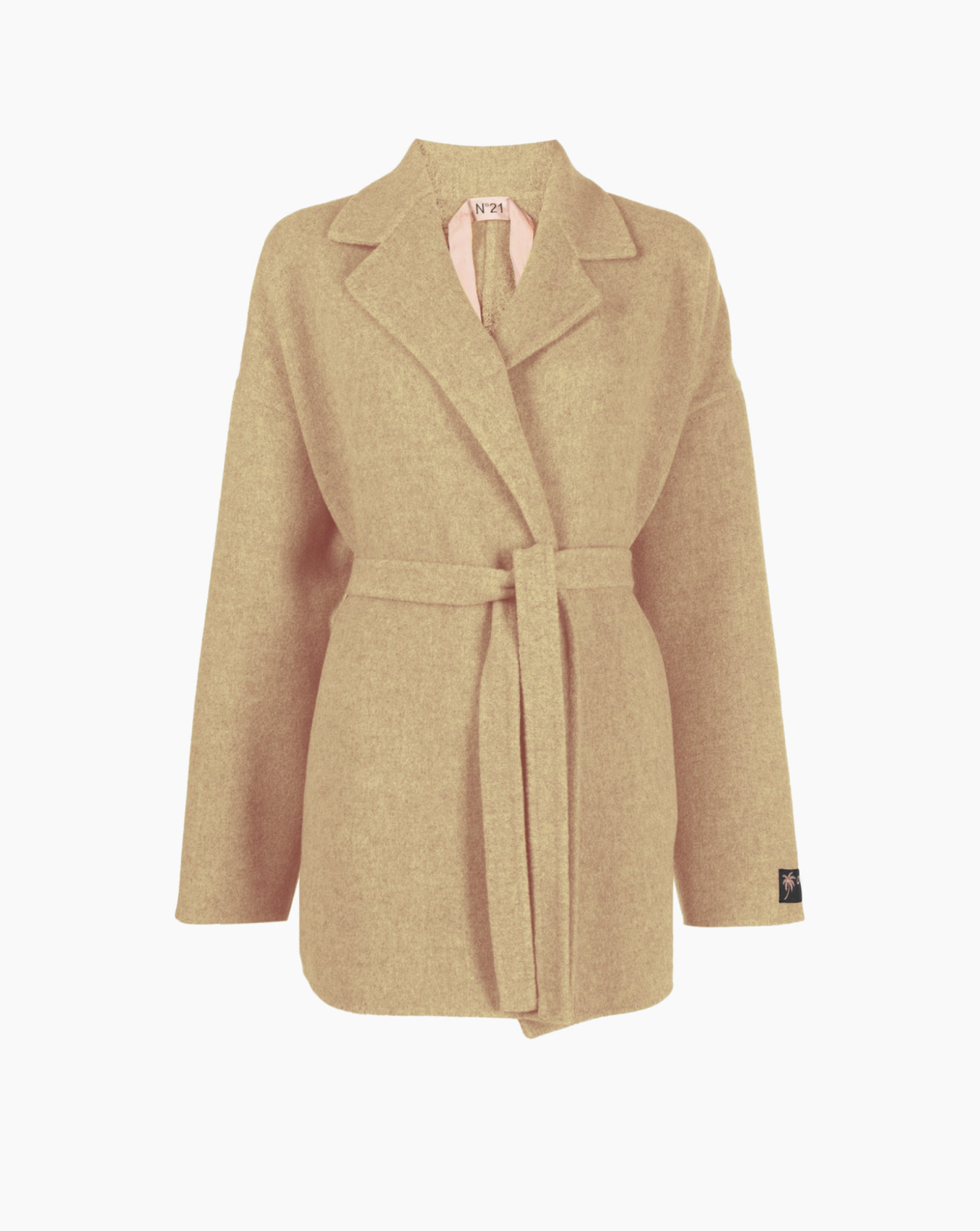 Color — Pale BrownTrue to sizeRelaxed fit double face camel coat with dropped shoulders, open front and detachable and adjustable waist strap 81% Wool19% Polyamide