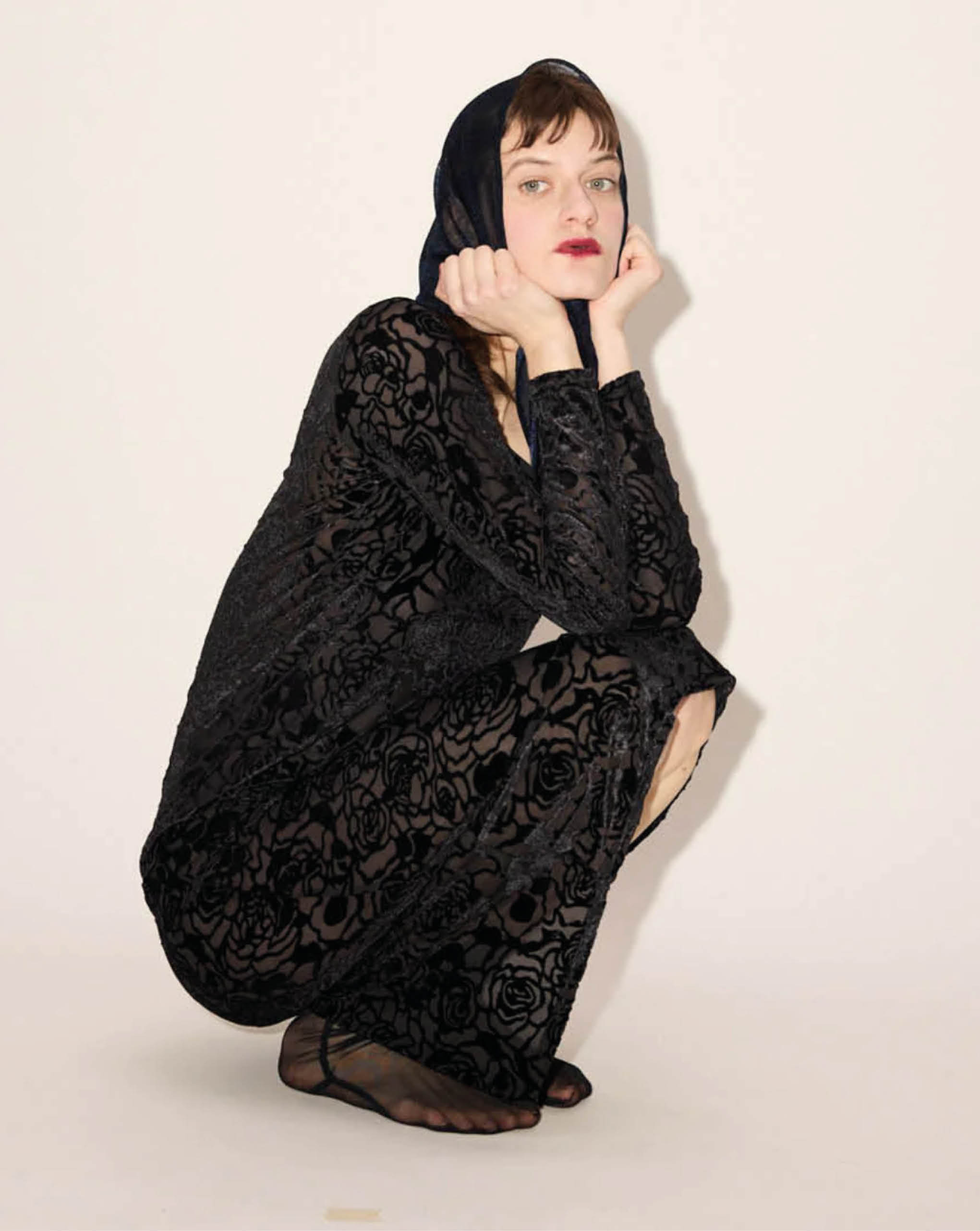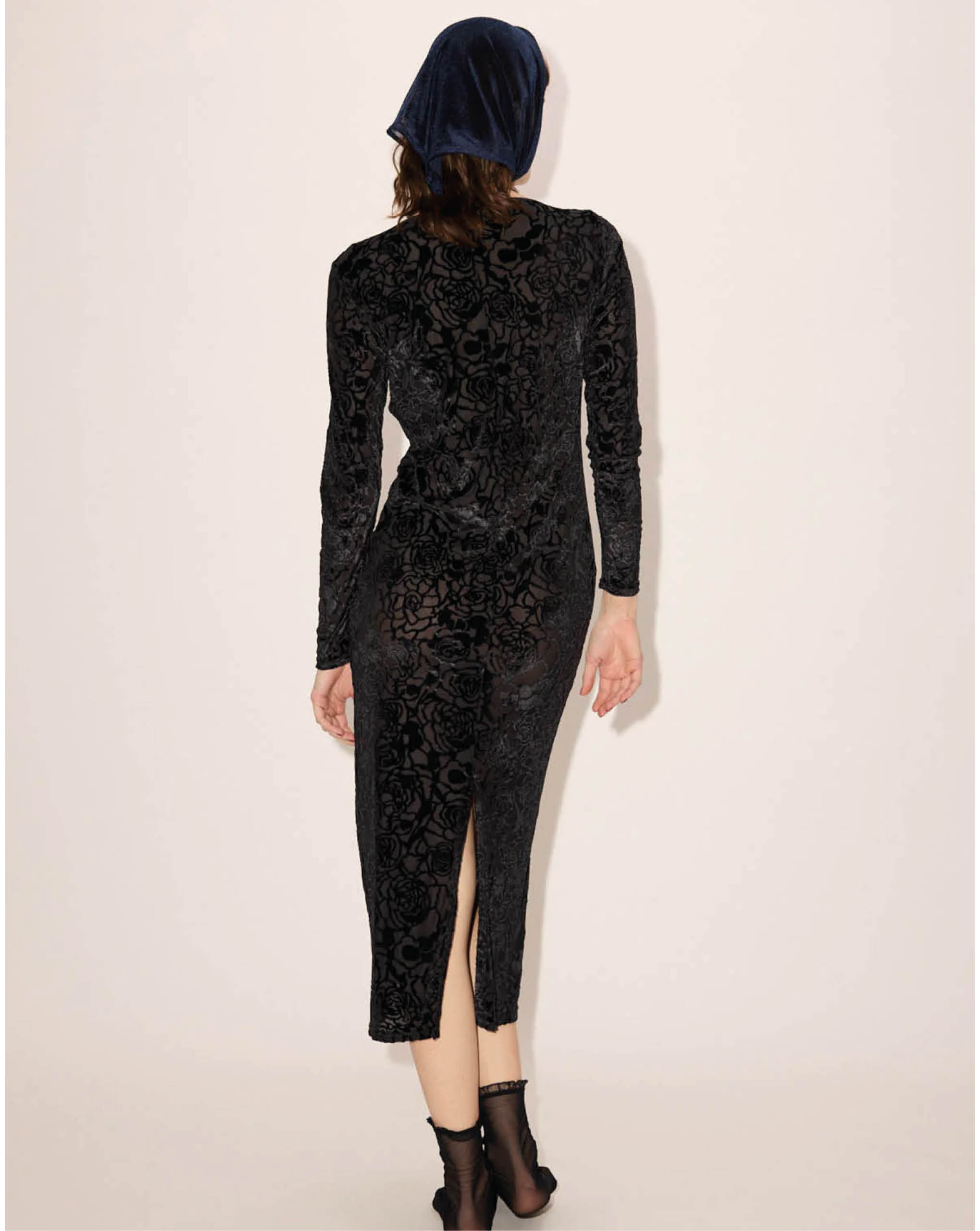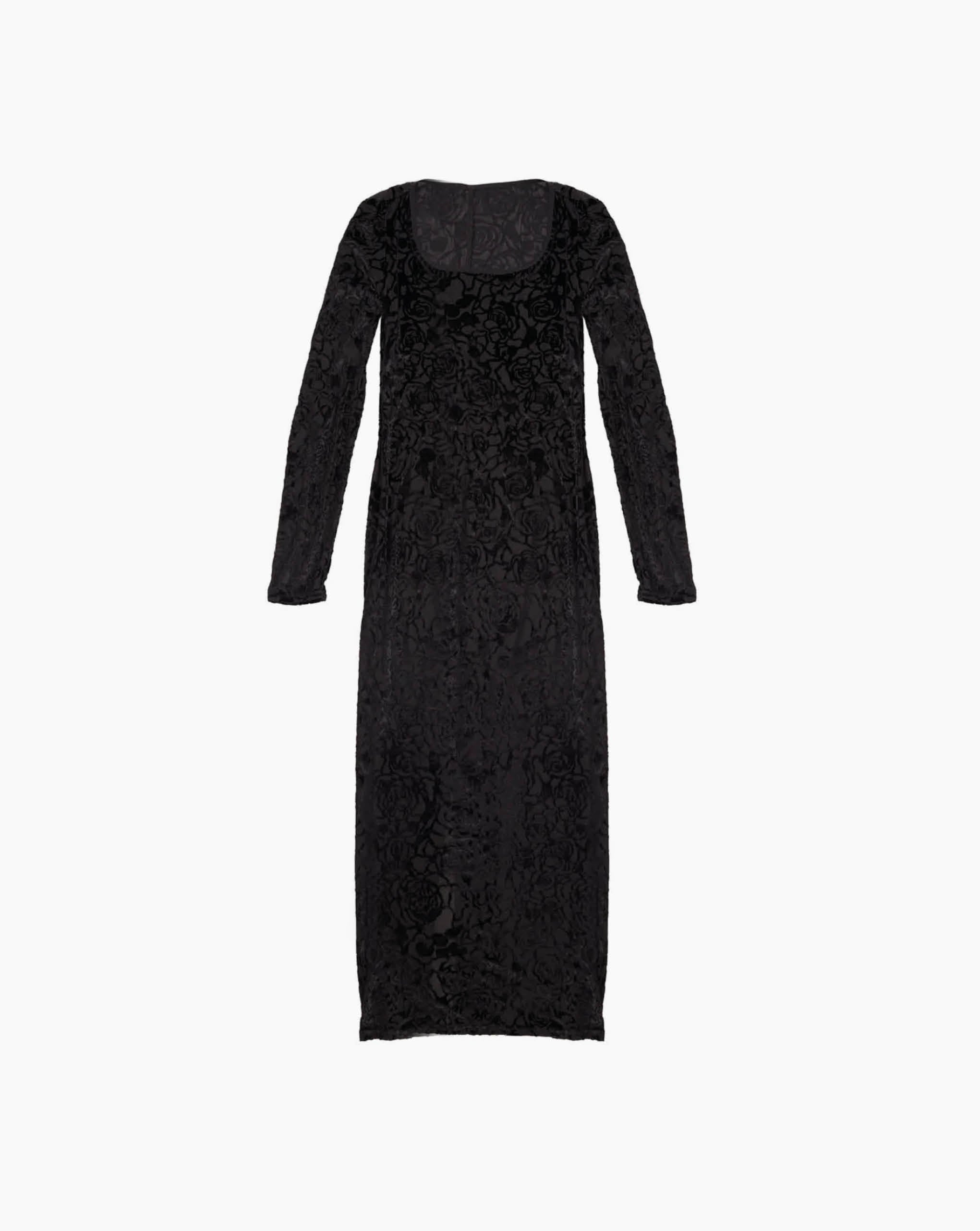Simone Wild fitted velvet rose devore maxi dress with long sleeves featuring a round neckline and back slit
