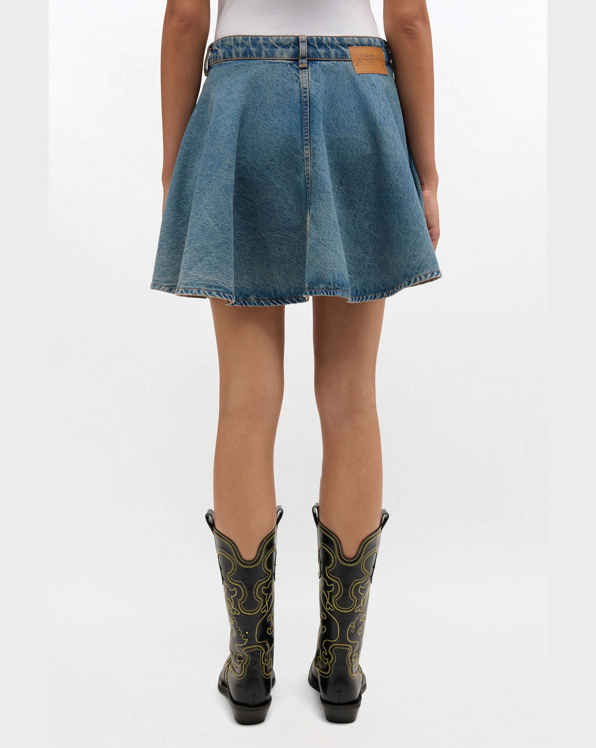Ganni mini skirt in a light rigid denim features a zip and button closure, 3 pockets, belt loops and a GANNI logo at the back pocket